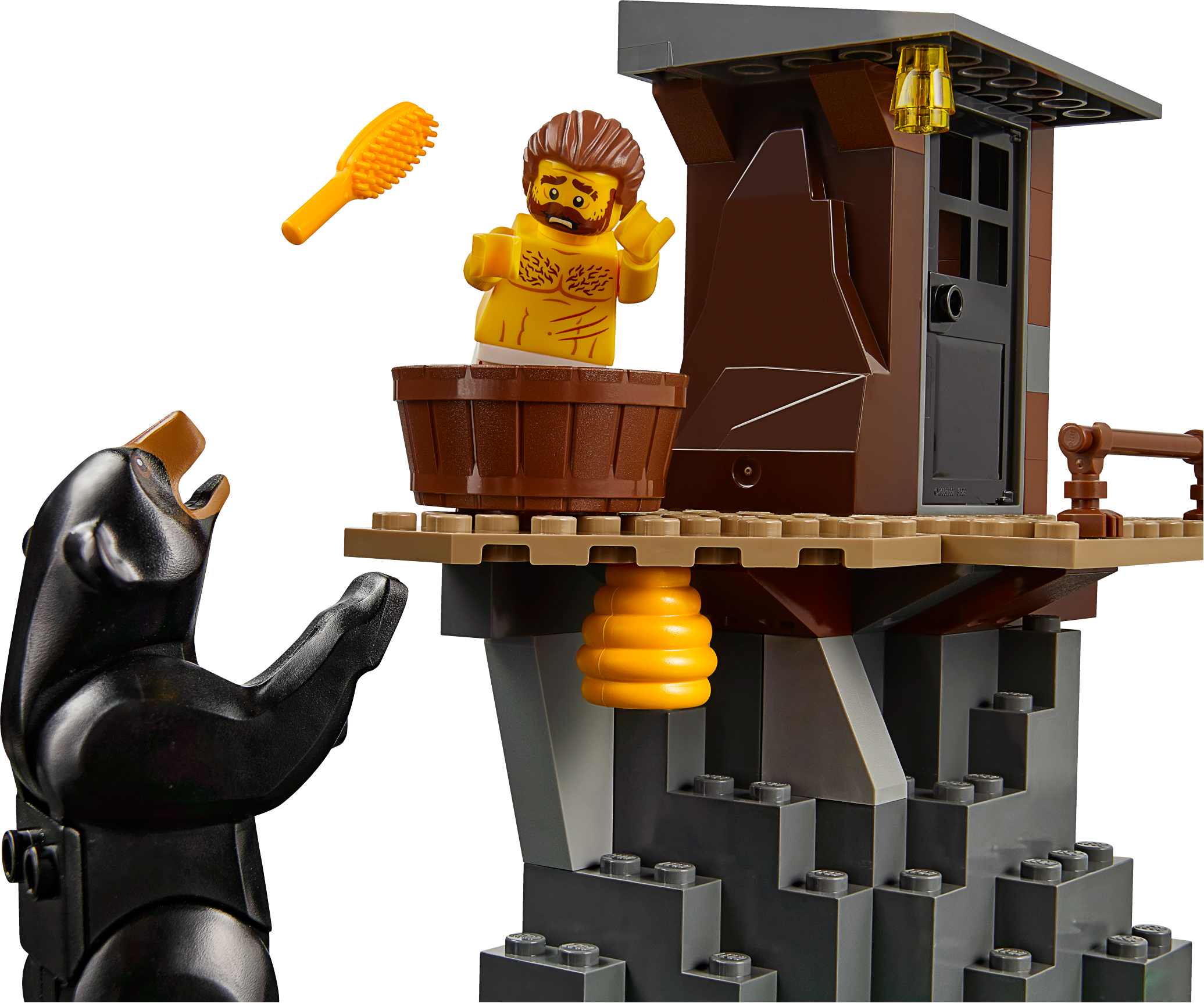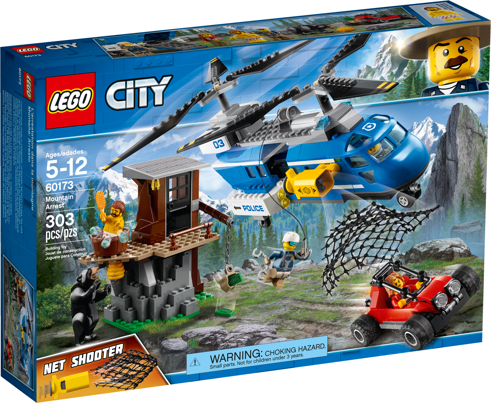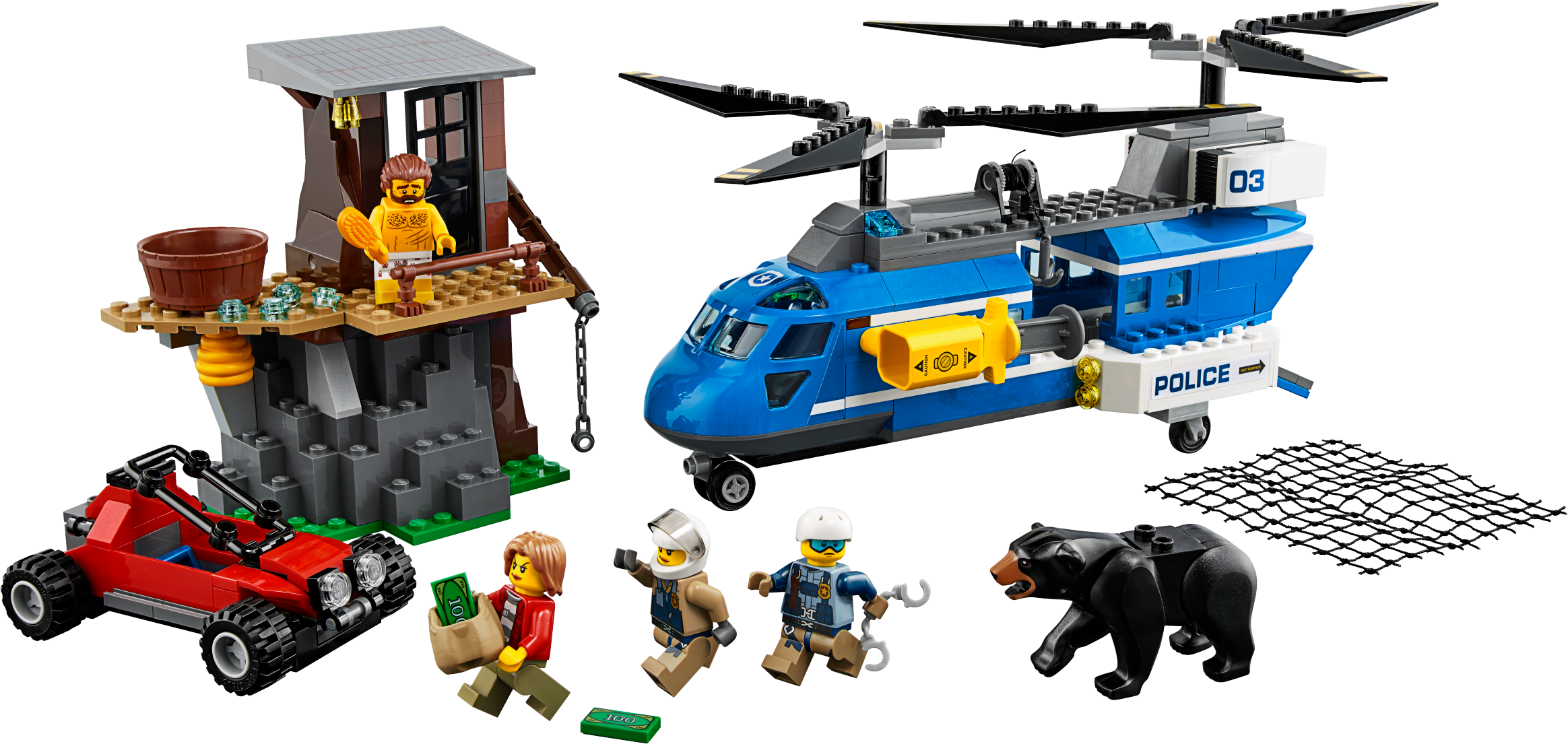 Pick up your badge and join the LEGO® City Mountain Police officers as they make a Mountain Arrest! This amazing children's toy set features a 2-level hideout with opening door, bathtub, beehive and post with crane and chain, a police helicopter with opening cab, double spinning rotors, opening door on the back, net shooter, winch with string and hook, plus a crook's escape buggy with space for loot. Includes 4 minifigures and a bear figure.