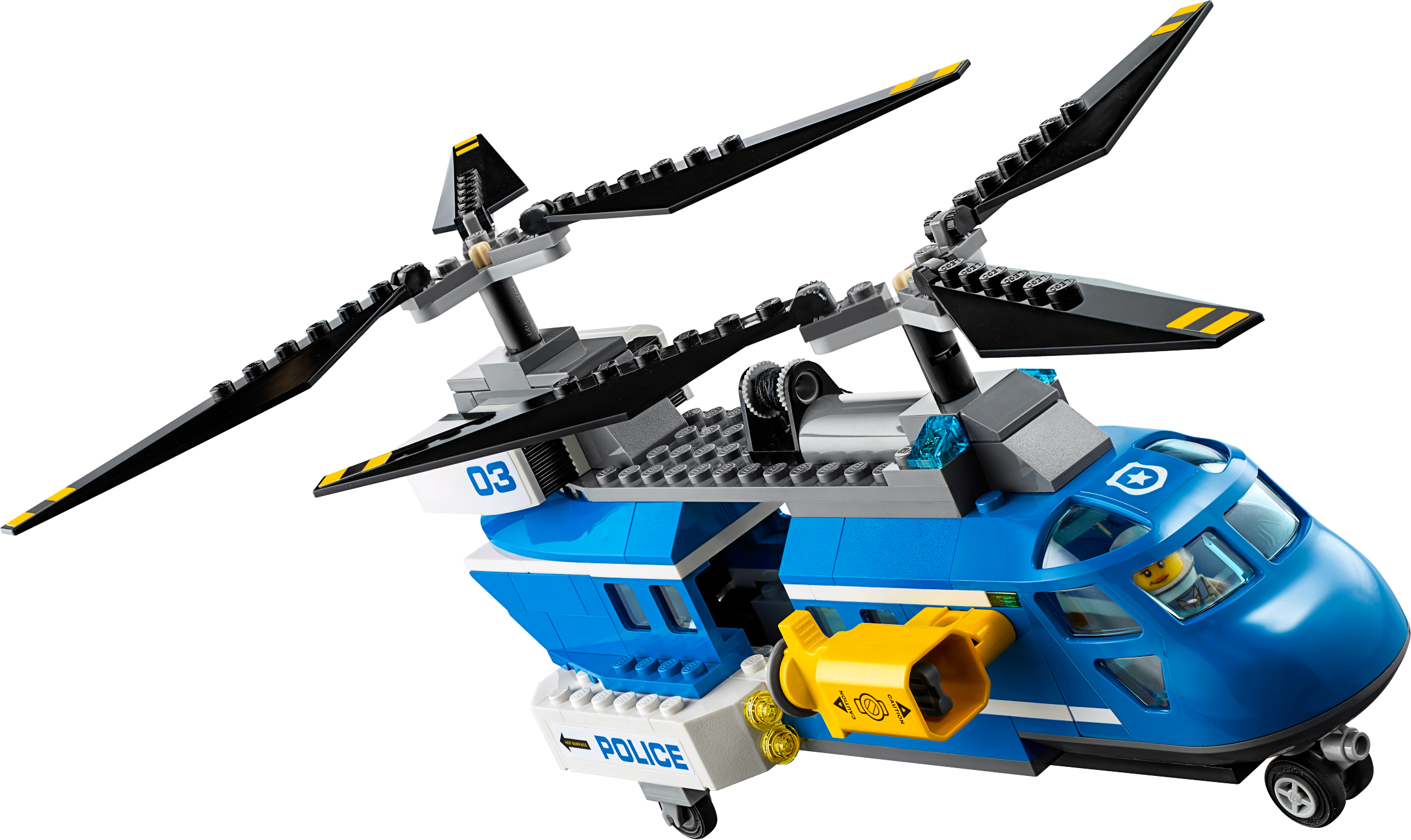 Also includes a police helicopter with double spinning rotors, net shooter and winch with string and hook, opening cockpit and sliding rear door, plus an escape buggy for the crooks with space for a backpack.