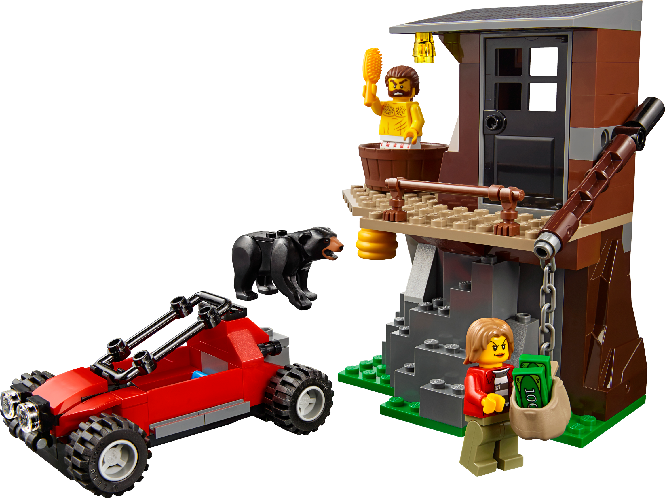 Includes 4 minifigures: a police officer, pilot and 2 crooks, plus a bear figure.
