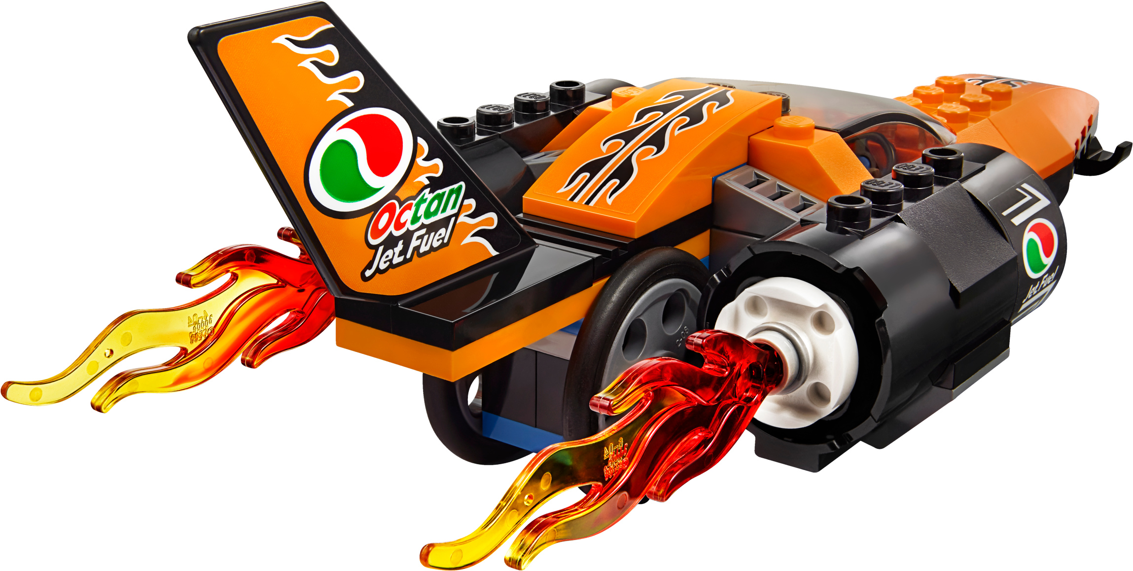 Features a streamlined car with opening cockpit, flame elements and large rear wing.