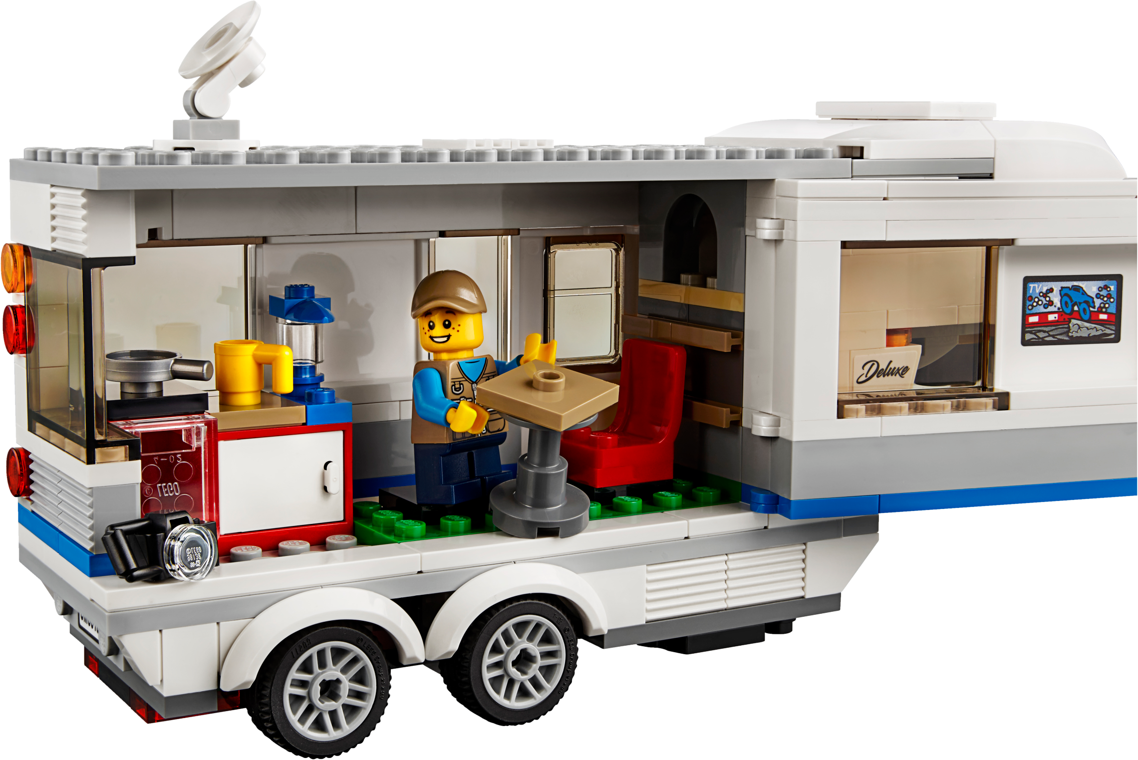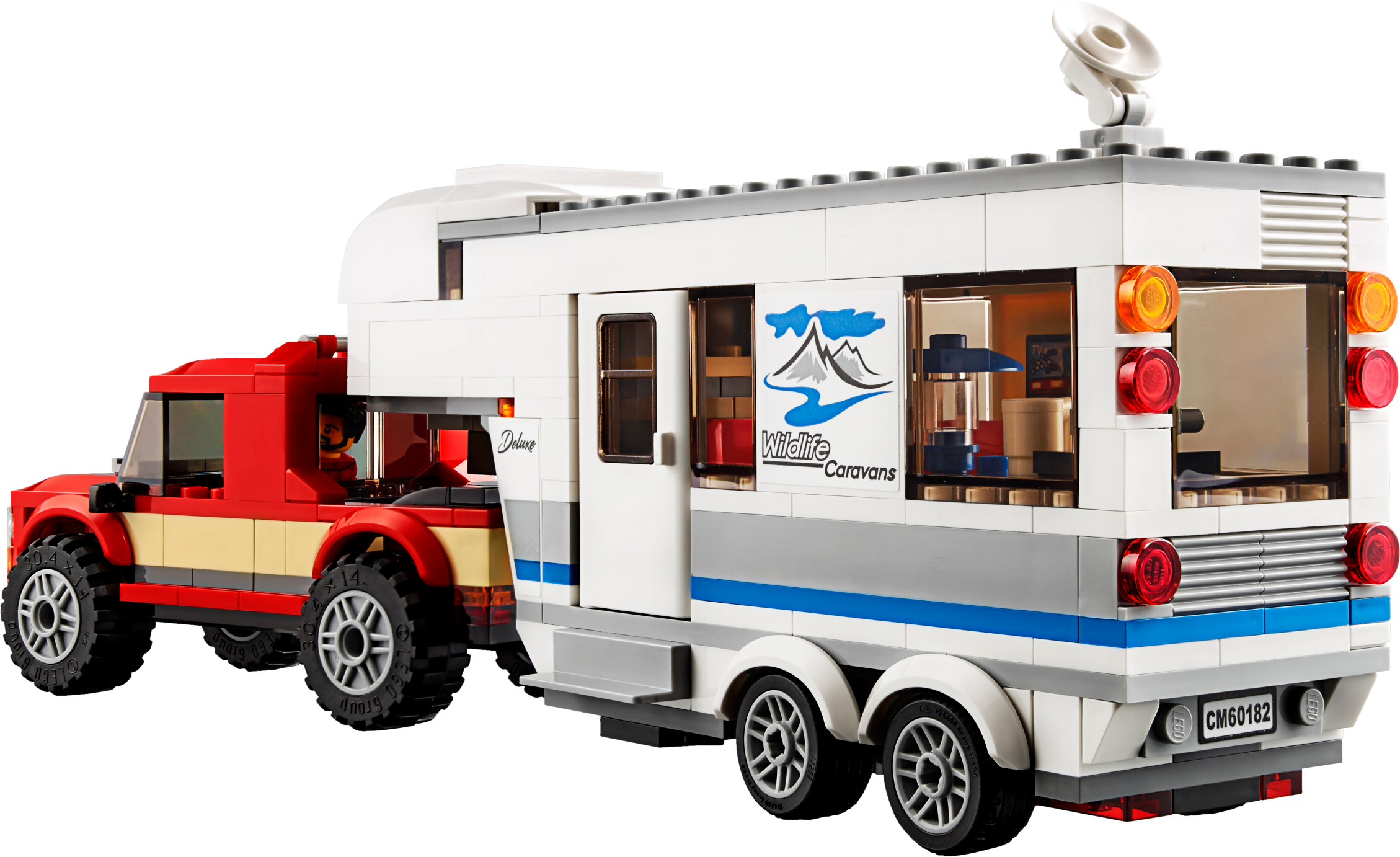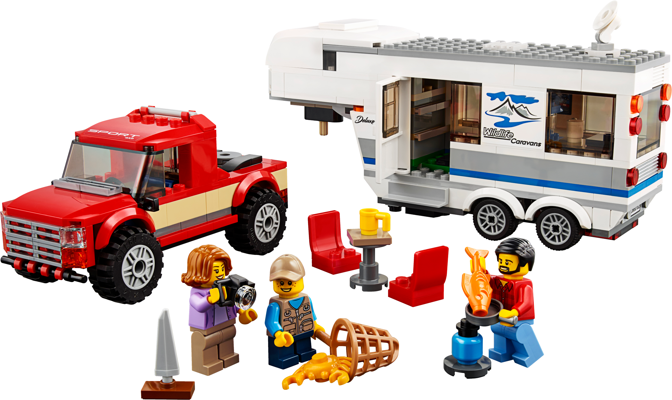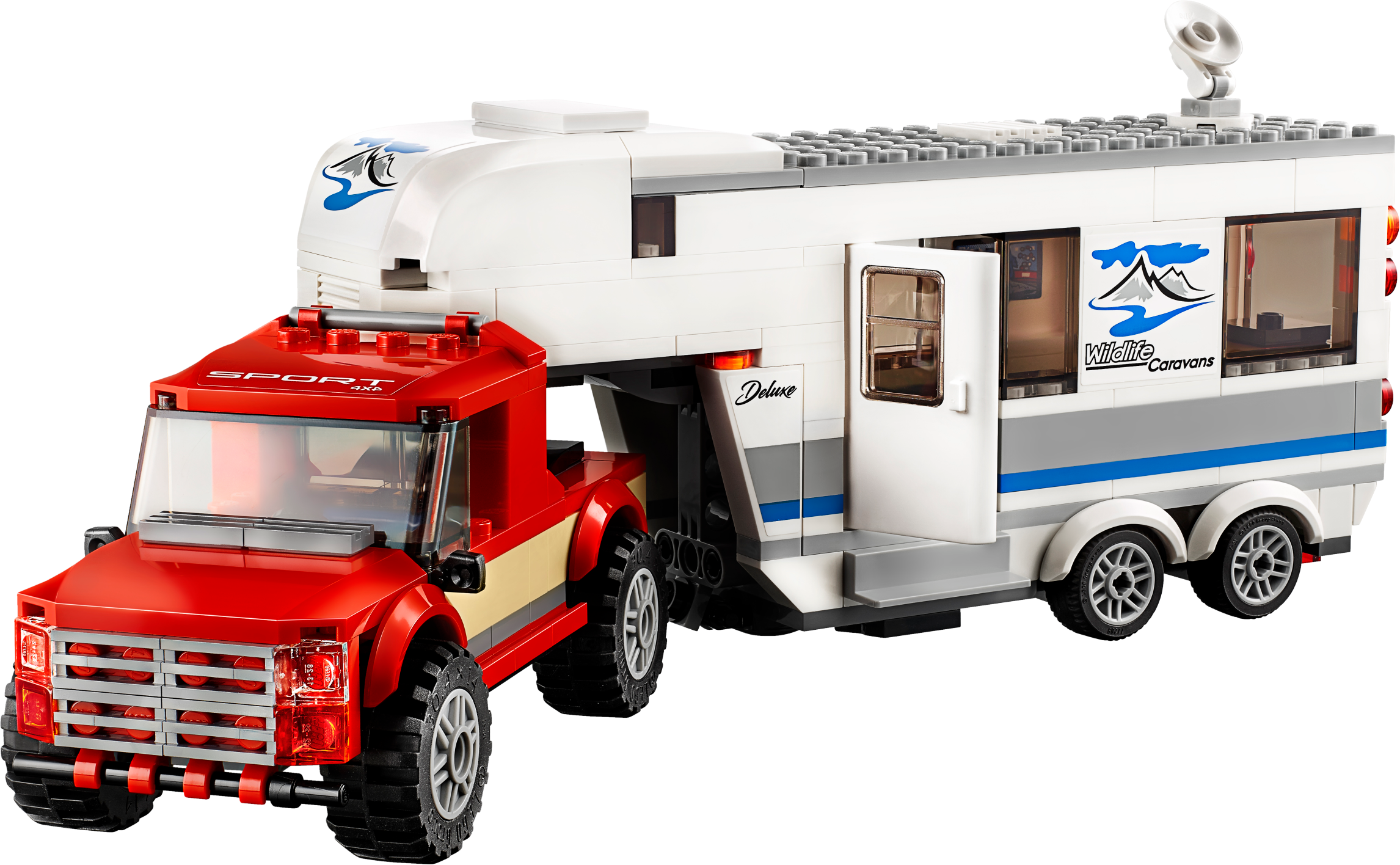 Features a caravan that opens on the side, opening door, removable front roof, furniture and a separate support leg to stand alone, plus a pickup truck with removable cab roof, minifigure cab and truck bed with a hitch for the caravan.