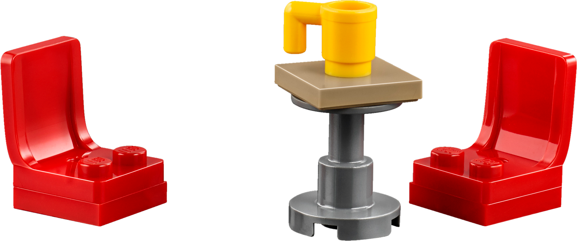 Accessory elements include a net, toy ship, camera, gas fire, pan, fish, 2 mugs, 2 chairs and a small buildable table.