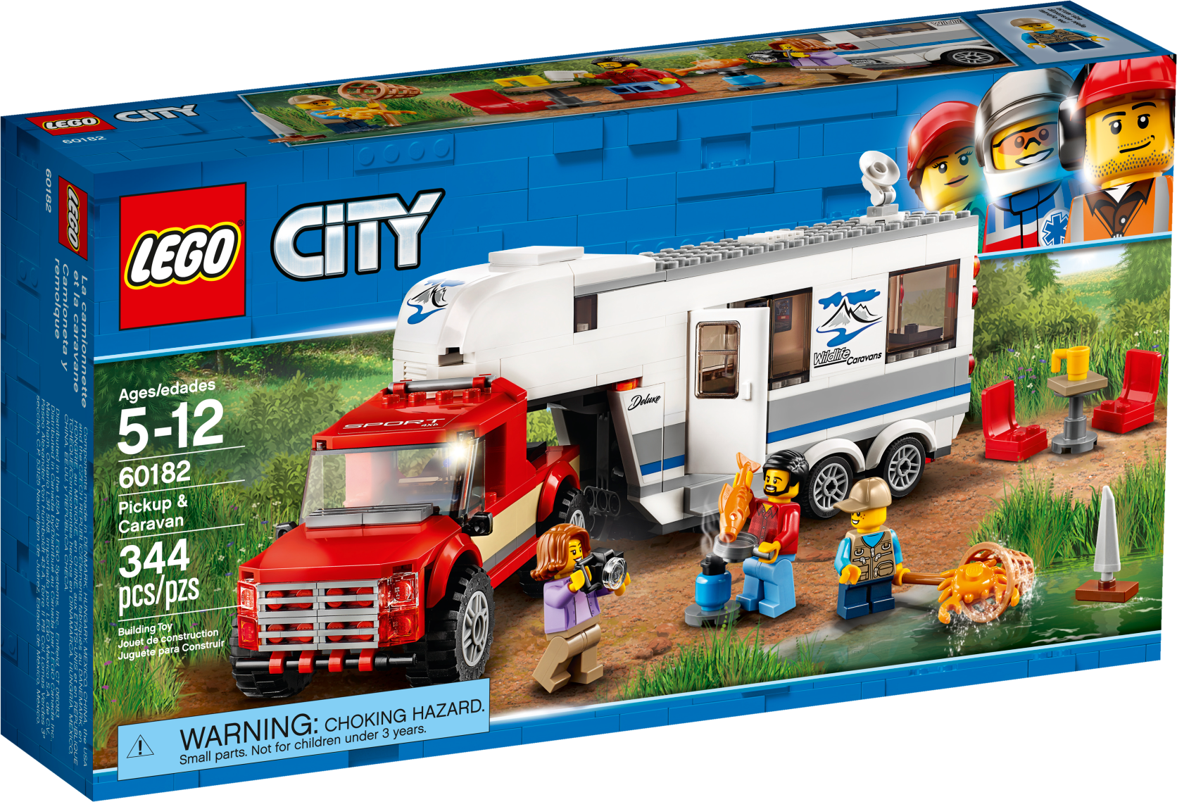 Head out into nature with the family in the LEGO® City Pickup & Caravan, featuring a big caravan with opening side, door, removable front roof to access the bedroom, removable furniture and a separate support leg to stand alone, plus a pickup truck with removable cab roof and bed with caravan hitch. This fun toy for boys and girls includes 3 minifigures and a crab figure.