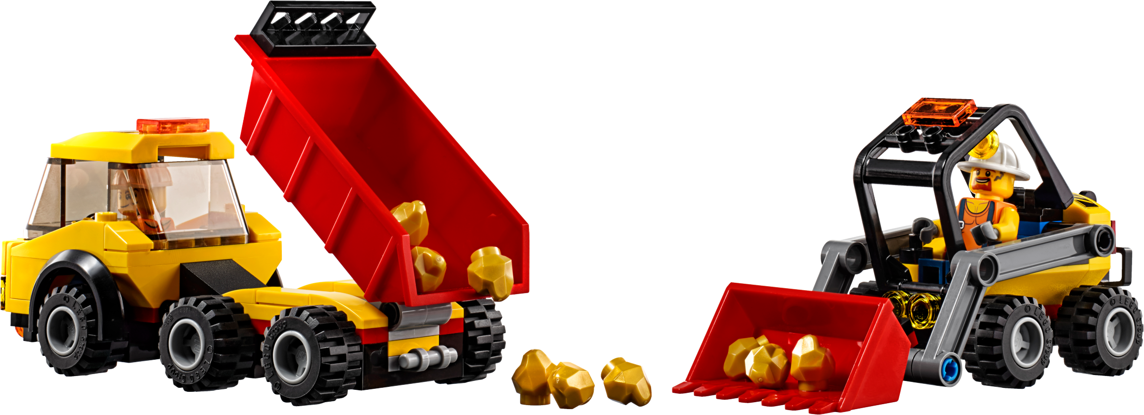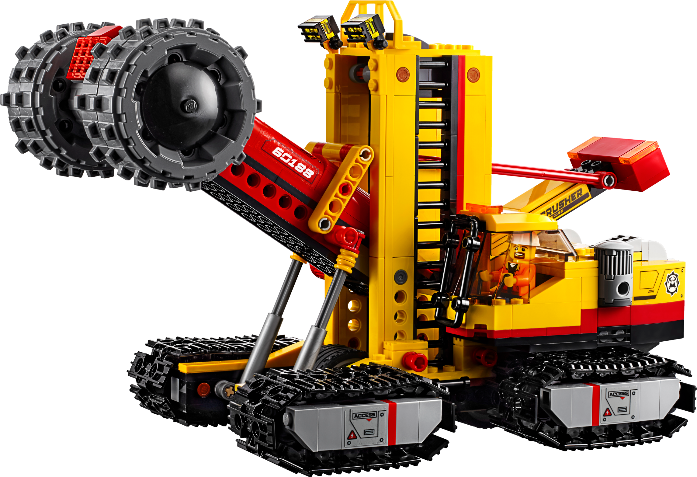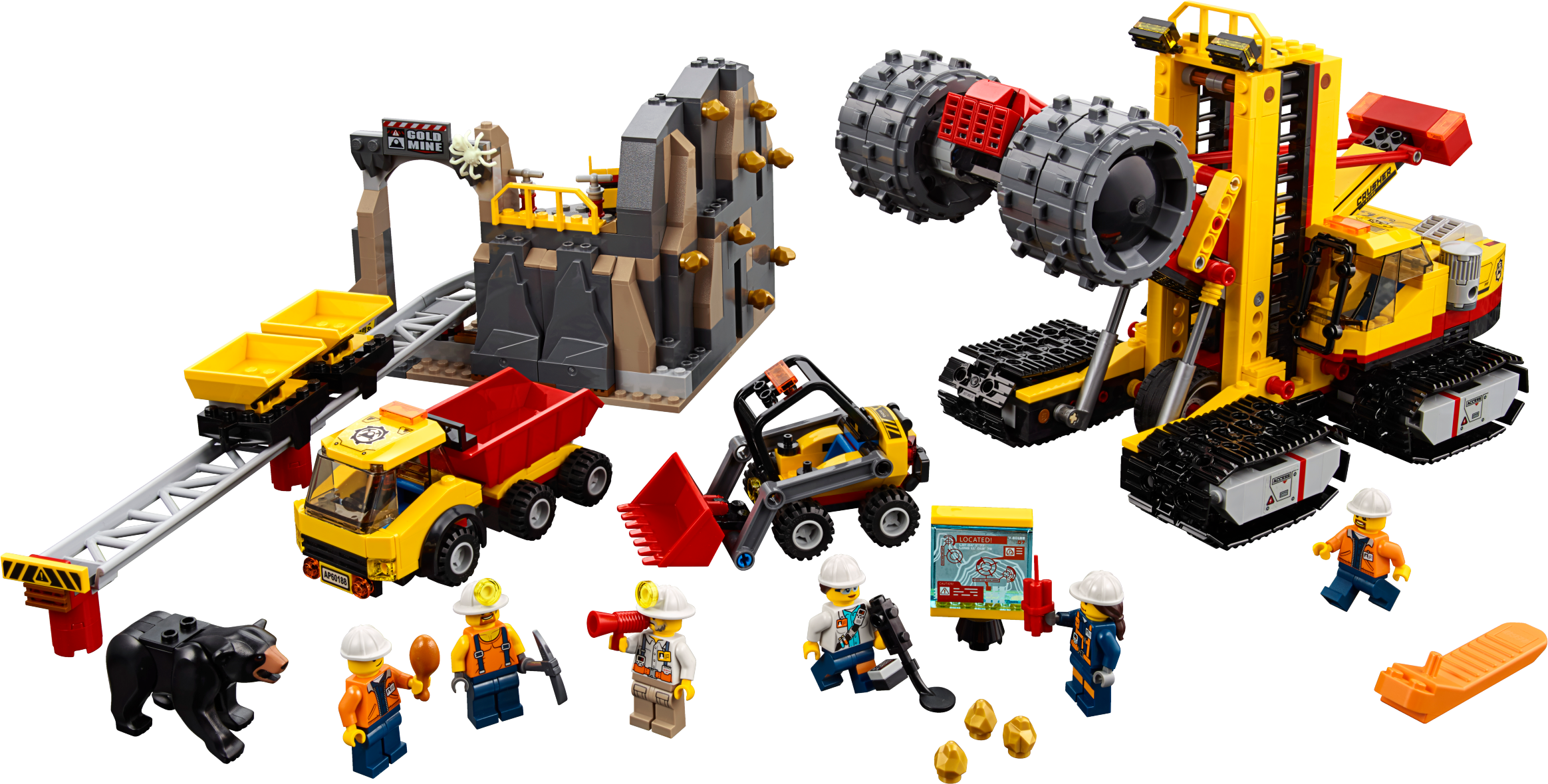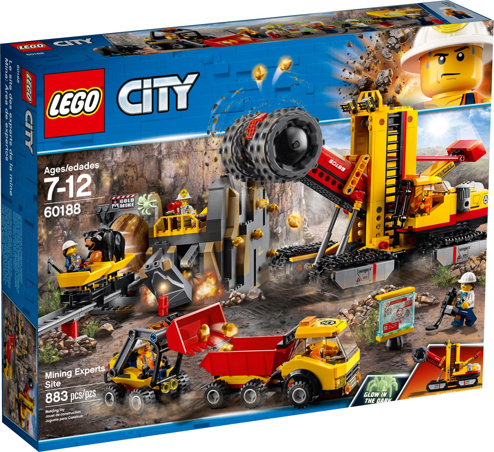 Grab your hard hat and head out to the LEGO® City Mining Experts Site to make new discoveries! This thrilling children's toy features a large grinder/crusher with minifigure cab and raising arm, a front loader with raising shovel and a dump truck with tilting bed. It also includes a large mine system with golden nugget elements, explode function, hidden golden nugget element and a chute and track system with rotating chute and 2 mine carts, plus a mobile lab. Includes 6 minifigures plus bear and glow-in-the-dark spider figures.