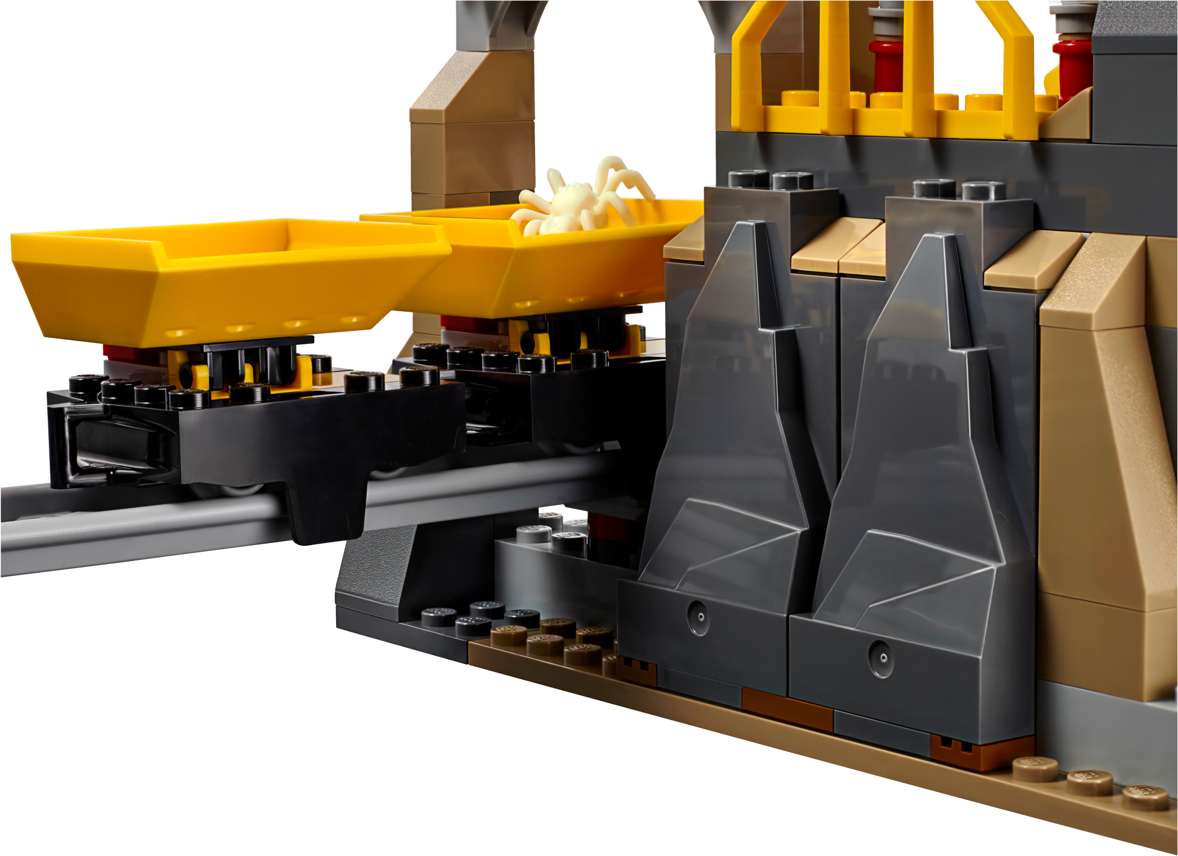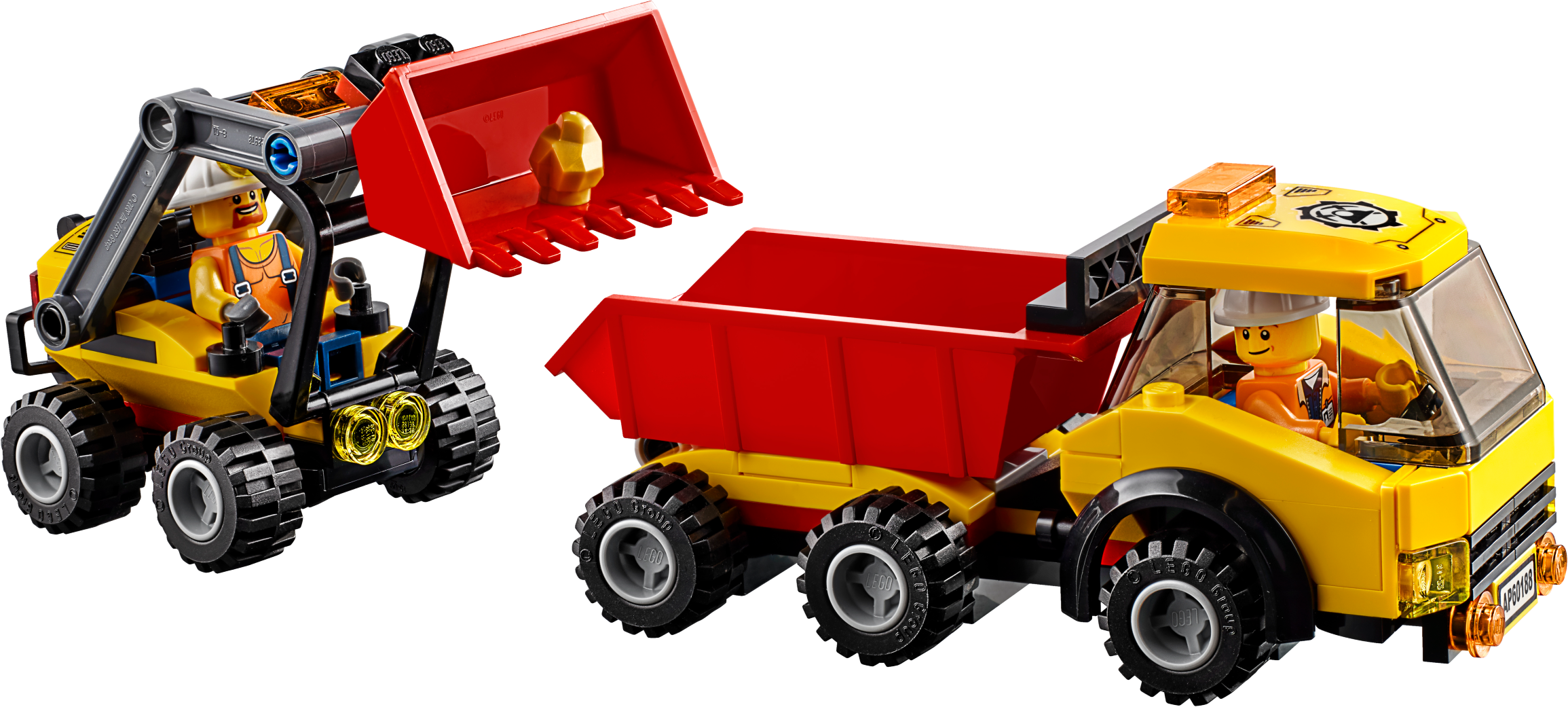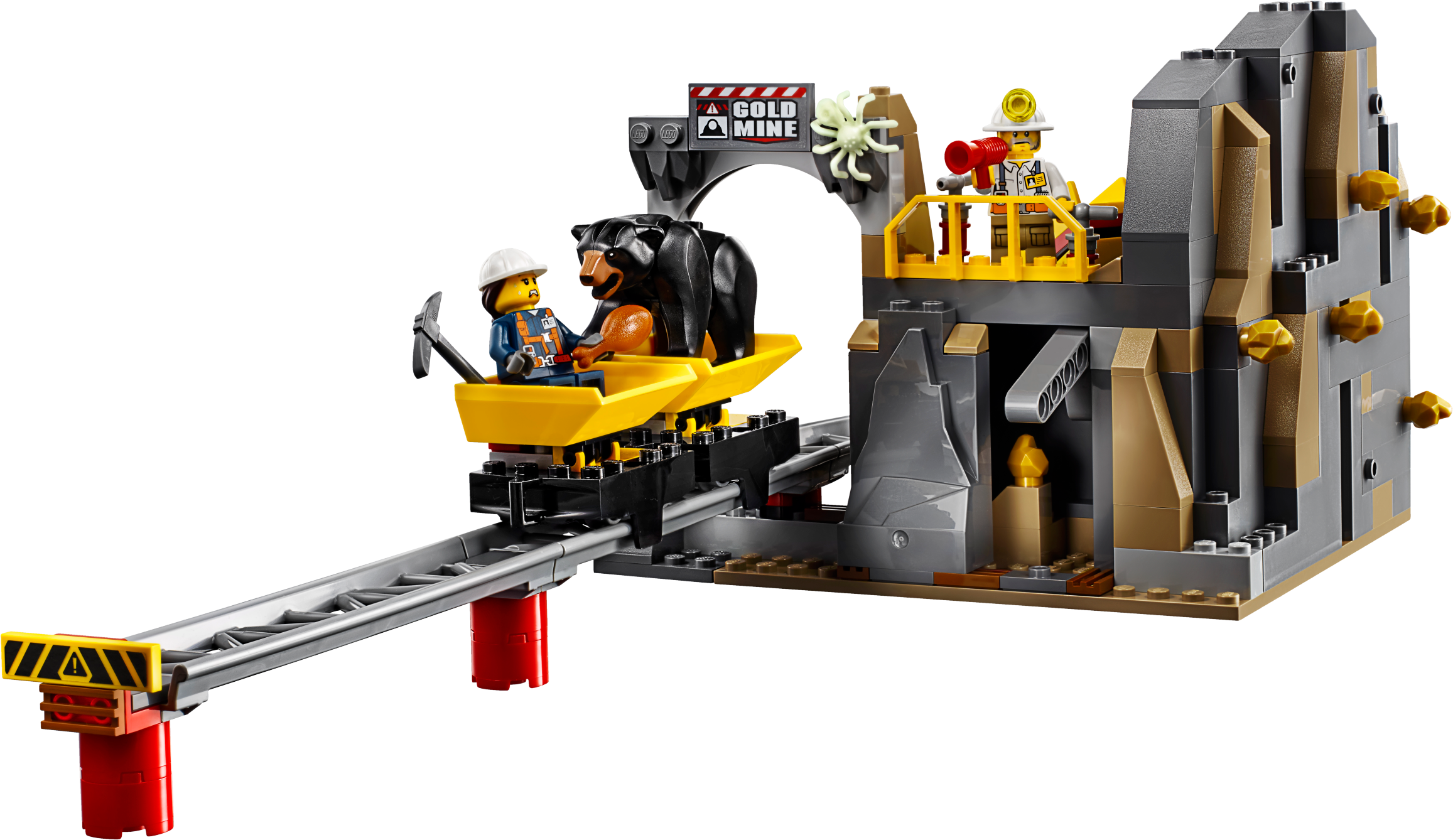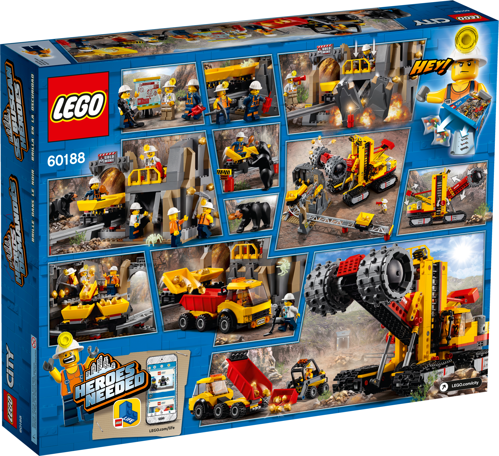 Grab your hard hat and head out to the LEGO® City Mining Experts Site to make new discoveries! This thrilling children's toy features a large grinder/crusher with minifigure cab and raising arm, a front loader with raising shovel and a dump truck with tilting bed. It also includes a large mine system with golden nugget elements, explode function, hidden golden nugget element and a chute and track system with rotating chute and 2 mine carts, plus a mobile lab. Includes 6 minifigures plus bear and glow-in-the-dark spider figures.