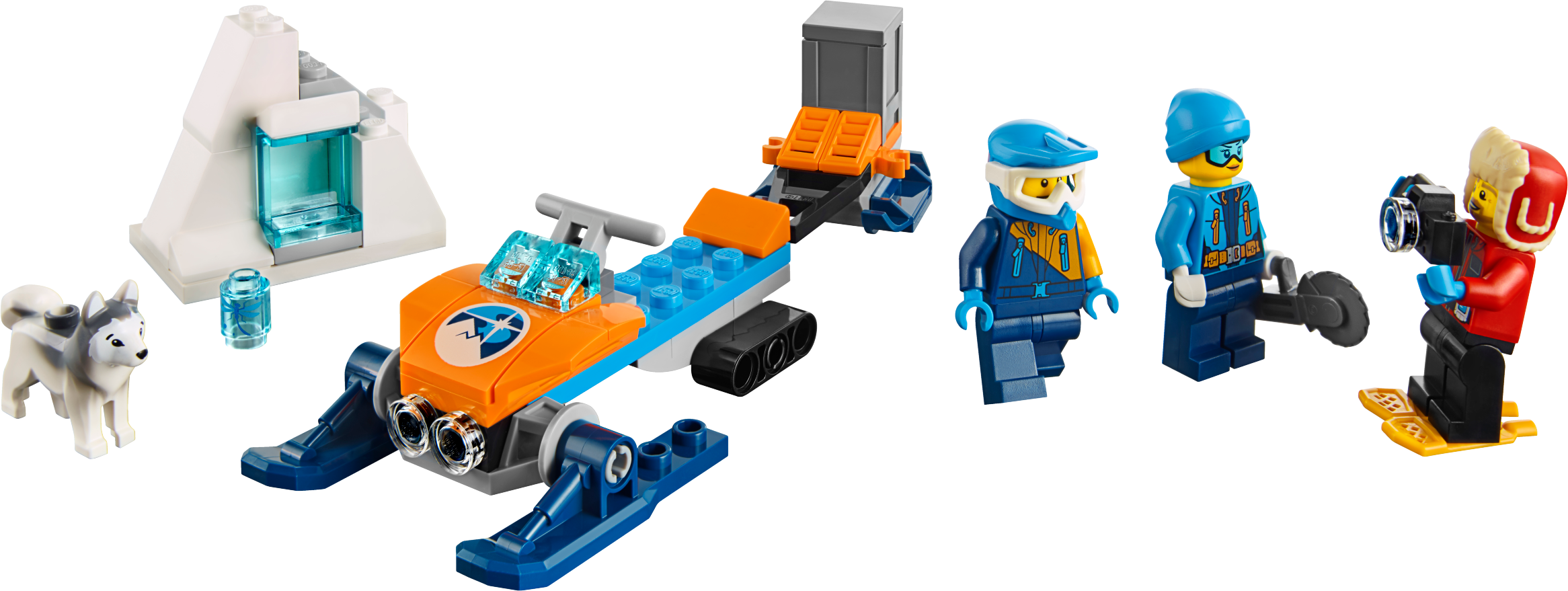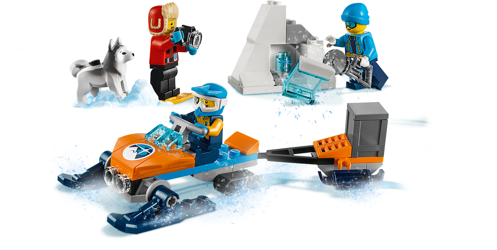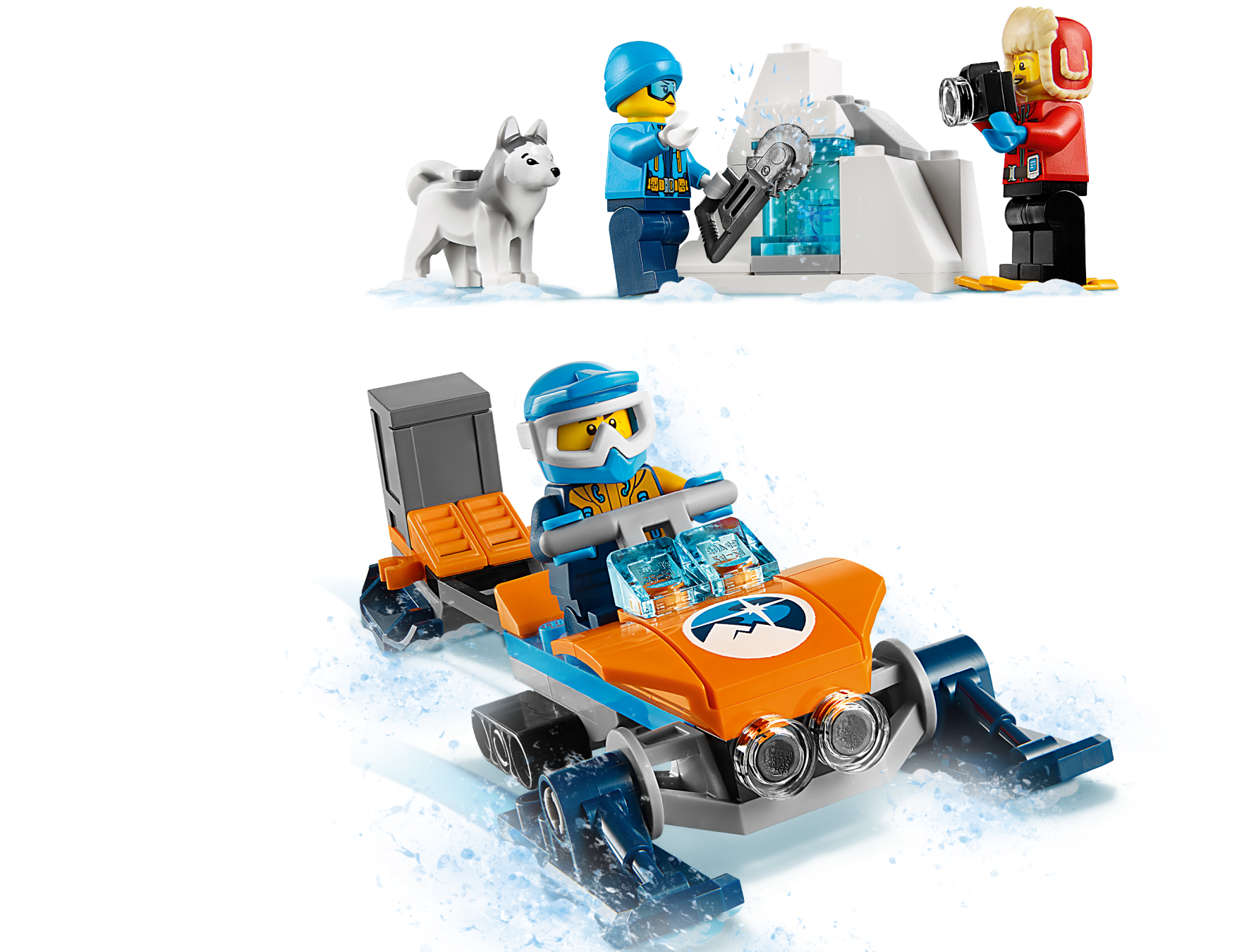 Includes 3 LEGO® minifigures: an arctic photographer, a snowmobile driver and an explorer, plus a husky dog figure.