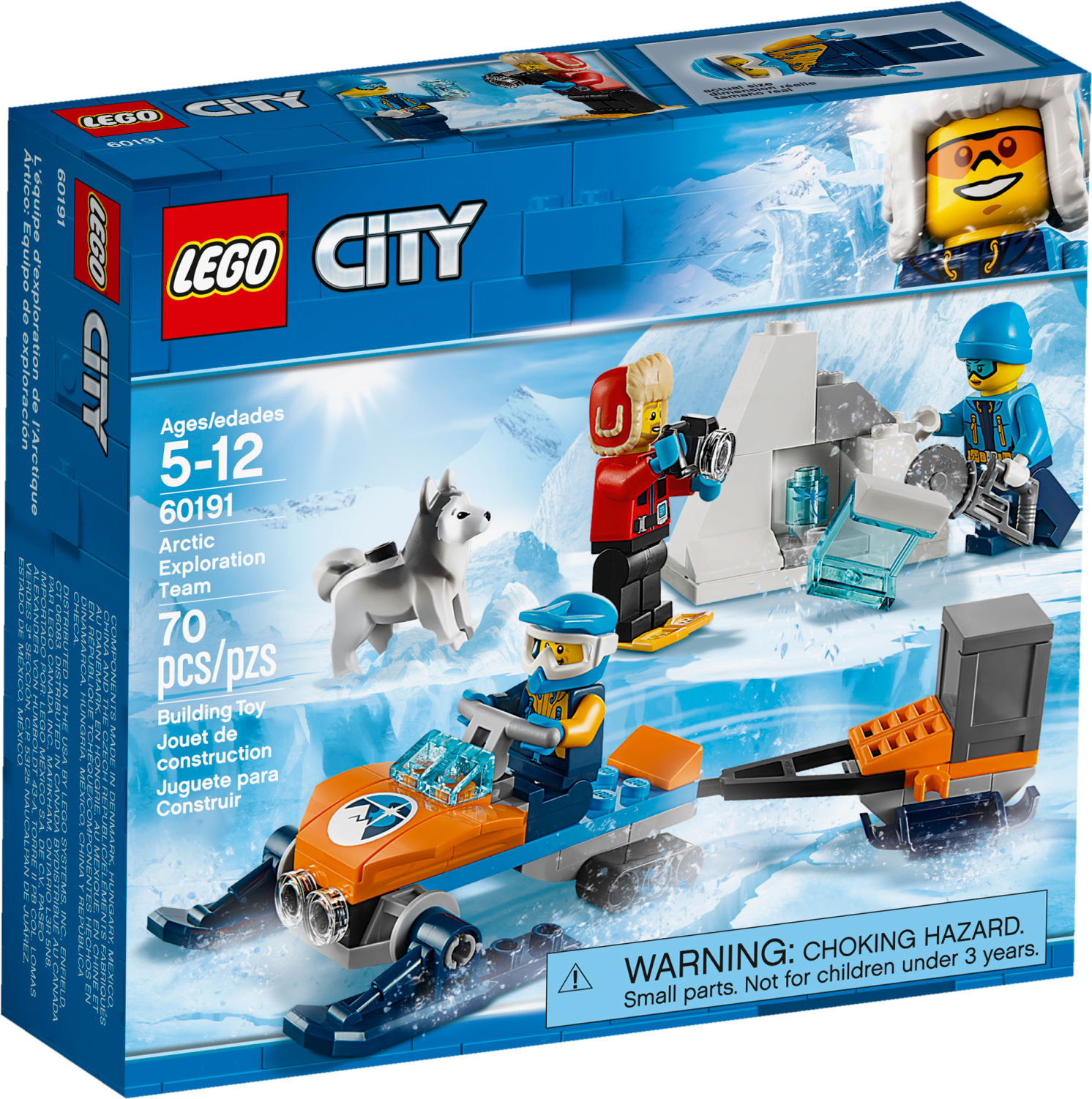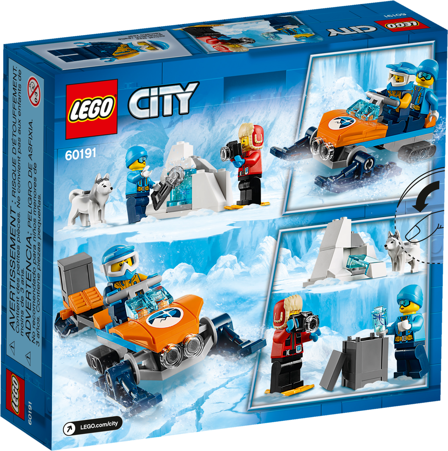 Discover incredible things with the LEGO® City 60191 Arctic Exploration Team set! This LEGO City Arctic Expedition set features a snowmobile with trailer hitch, trailer and storage box, plus an ice block element holding an insect encased in ice, saw, camera and a pair of snowshoes. Includes 3 LEGO minifigures and a LEGO husky dog figure.