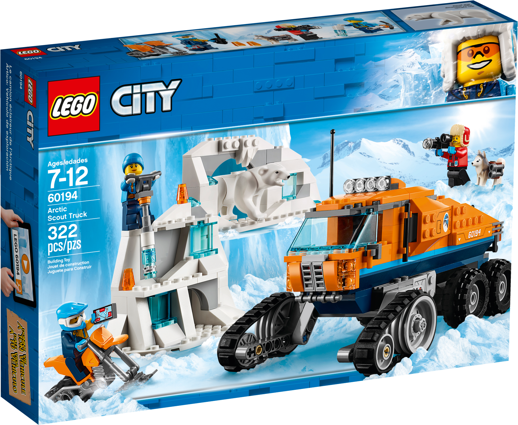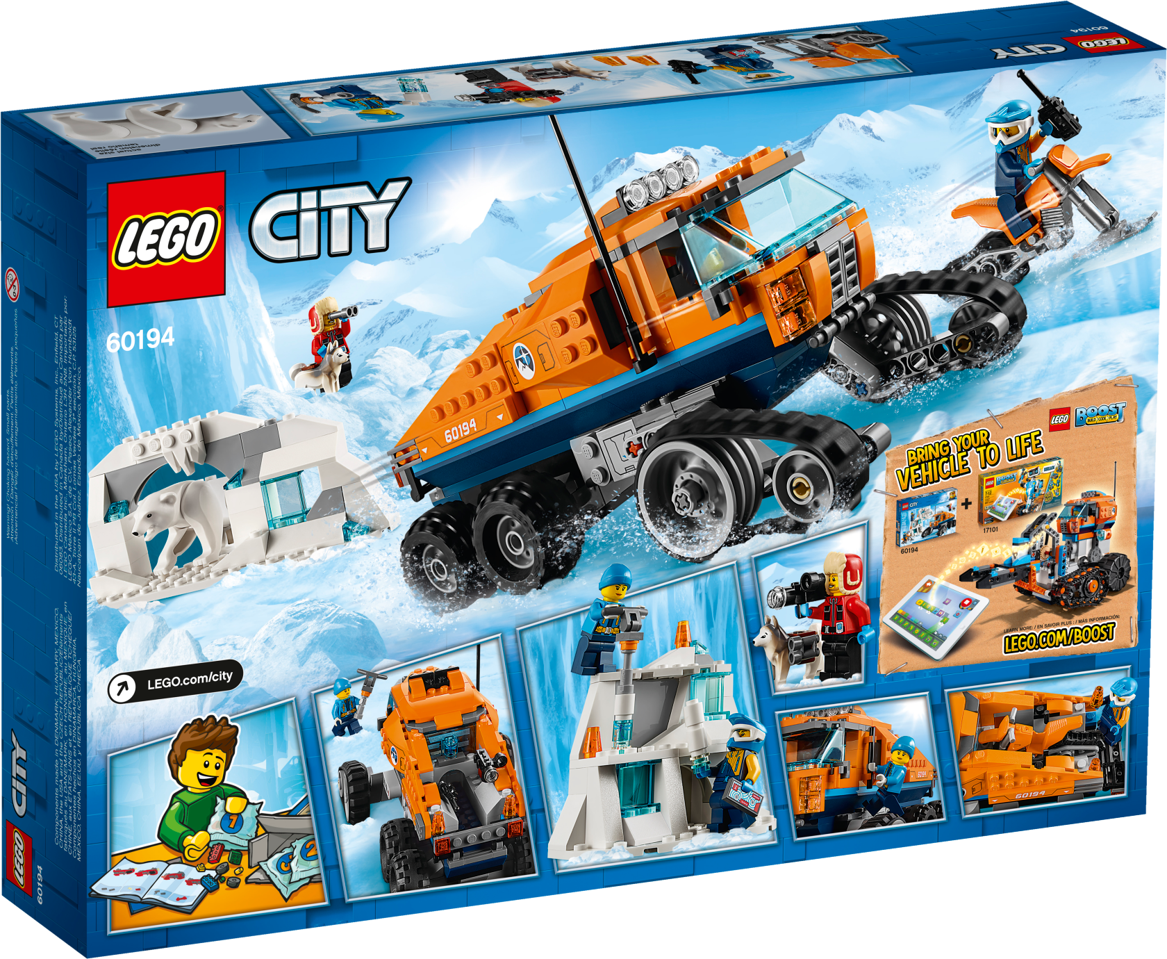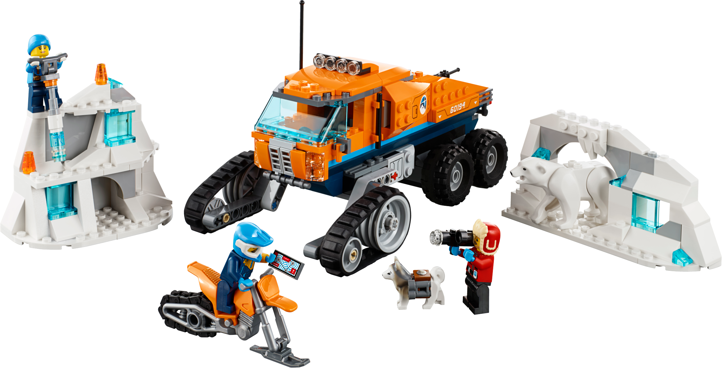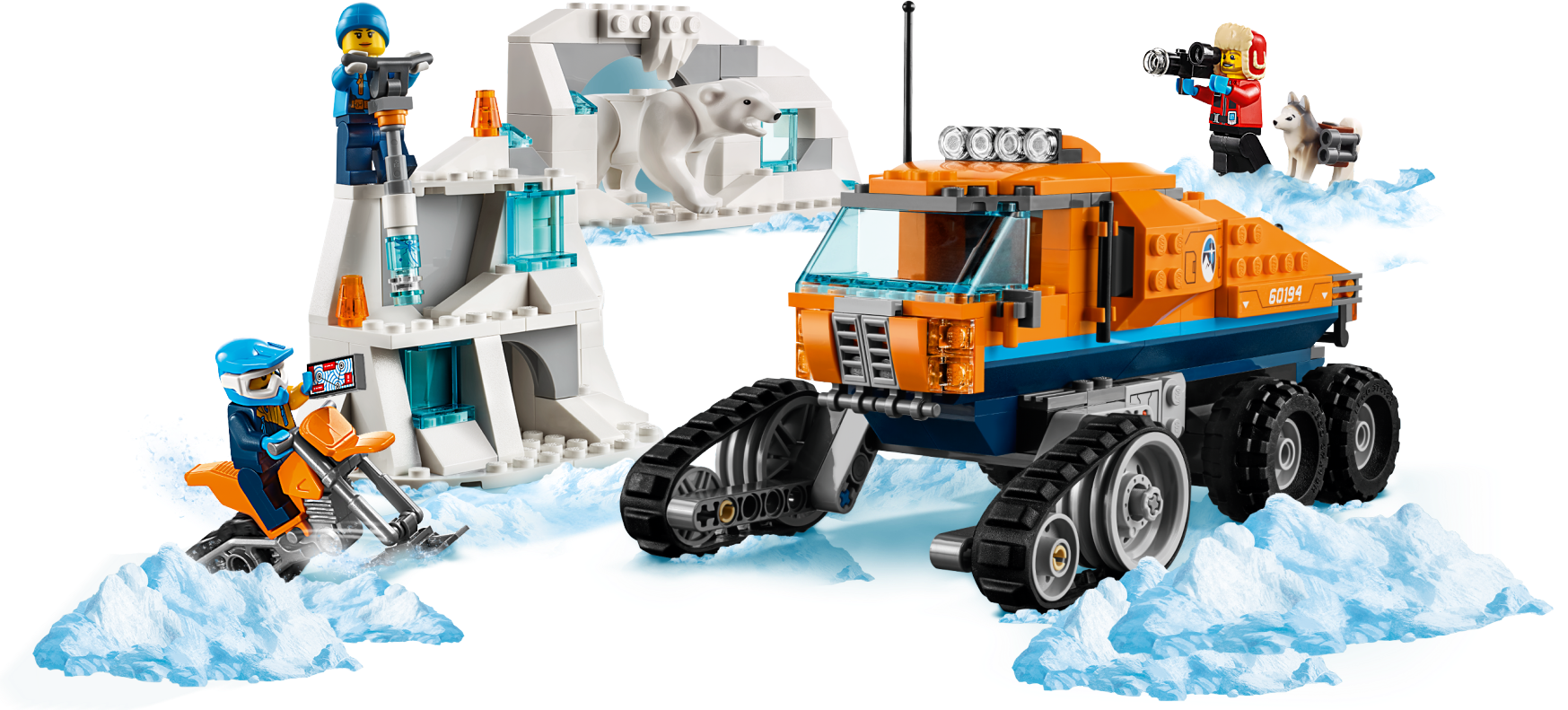 Explore the harsh terrain with the LEGO® City 60194 Arctic Scout Truck, with front tracks and 4 all-terrain wheels, antenna, lights, onboard analysis station, space for other equipment, and a loading bay for the snow bike with moving track. This fun set also includes an ice wall/arch with translucent blocks and sonar beacons, coring tool, plus an ice cave with translucent blocks and room for the polar bear figure. This LEGO City Arctic Expedition set also includes 3 LEGO explorer minifigures and a dog figure.