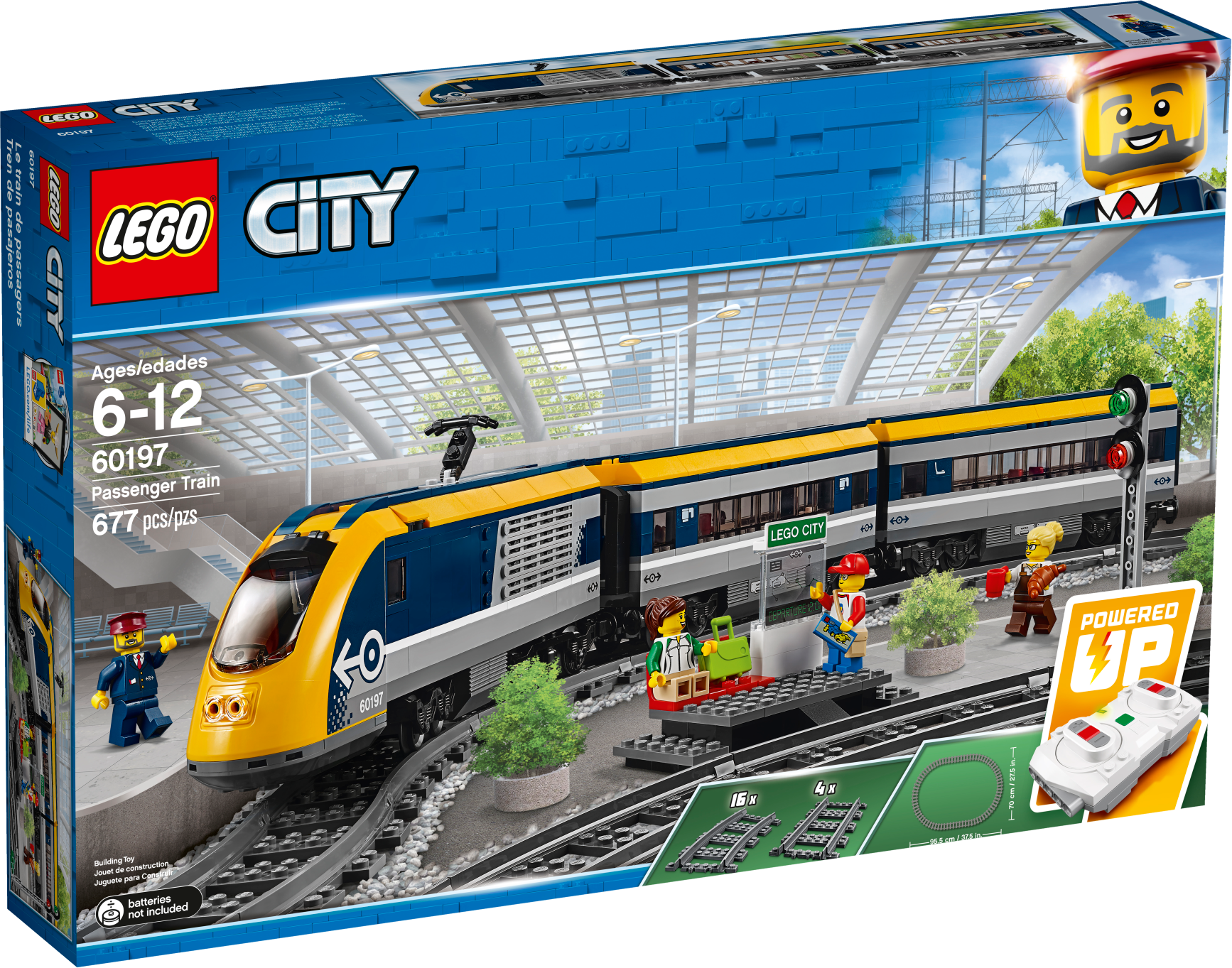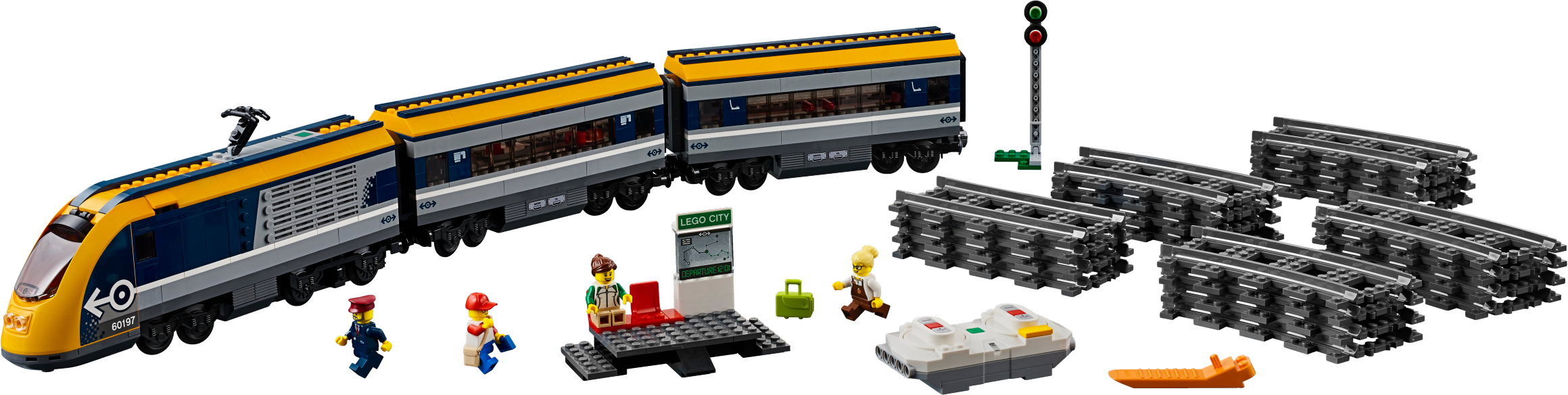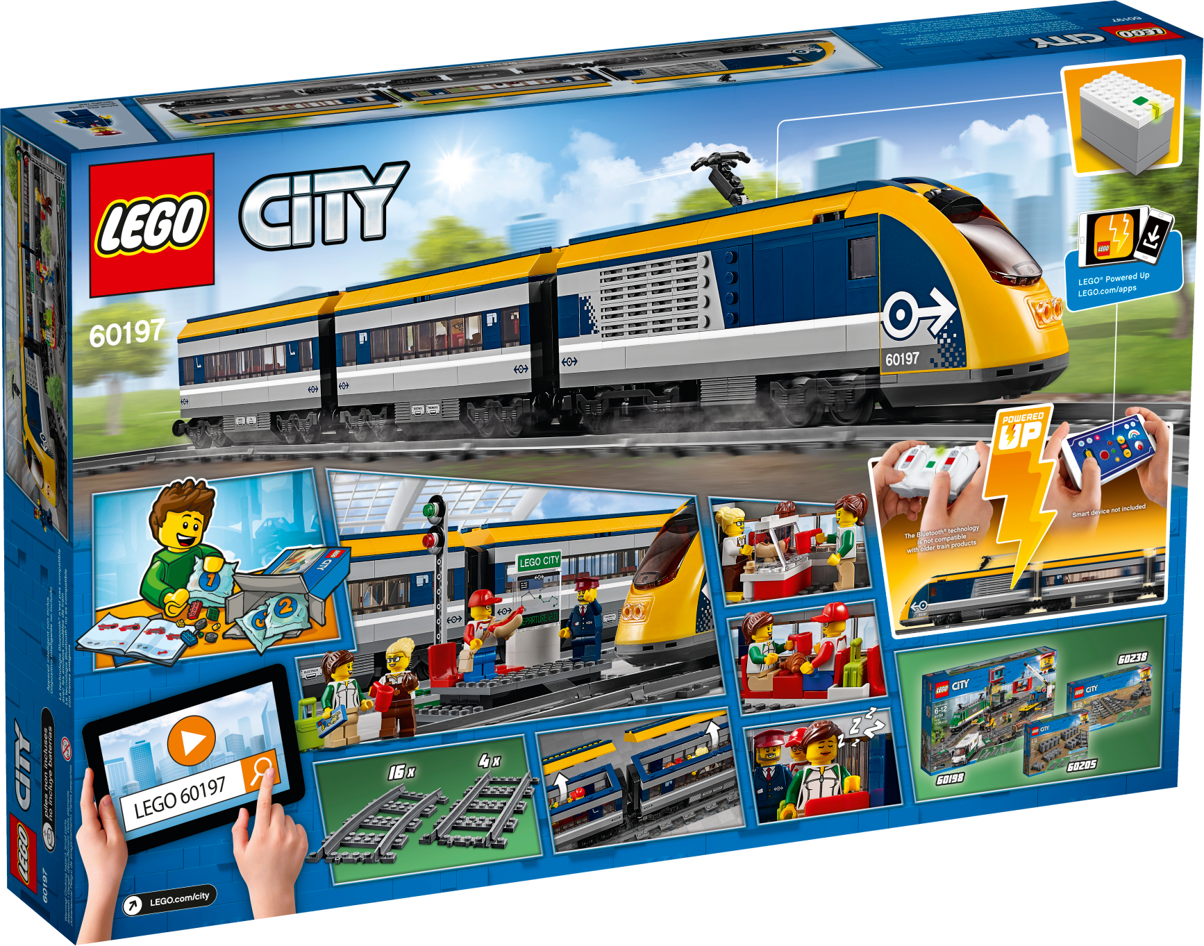 Climb aboard the LEGO® City 60197 Passenger Train! This fun set features a motorized engine with 10-speed Bluetooth remote control and opening nose cone, driver’s cabin with opening window, 2 cars with removable roofs, seats and tables, a full circular track with 16 curved and 4 straight rails, plus a buildable platform with 2 seats and train service map, train signal and 4 LEGO minifigures.