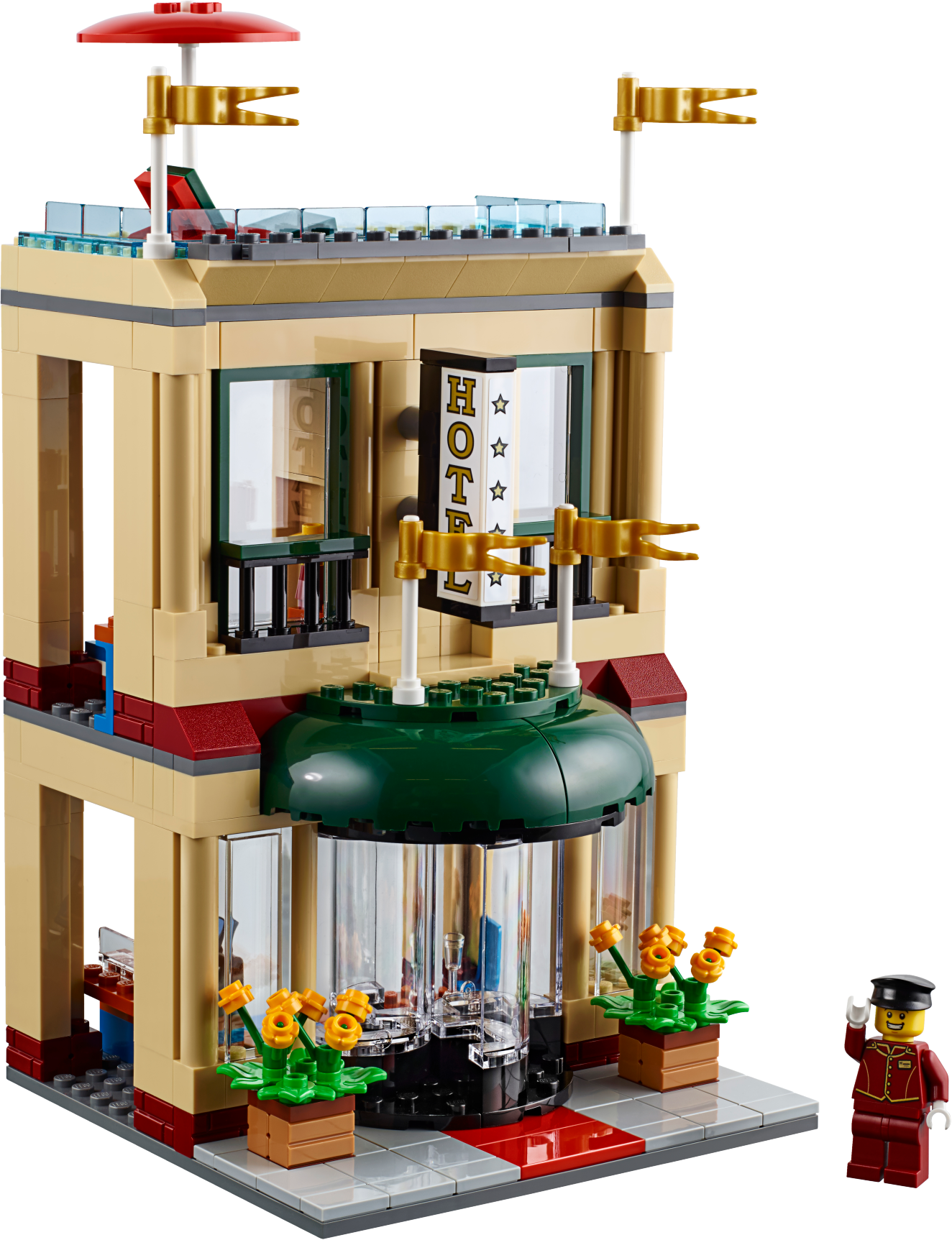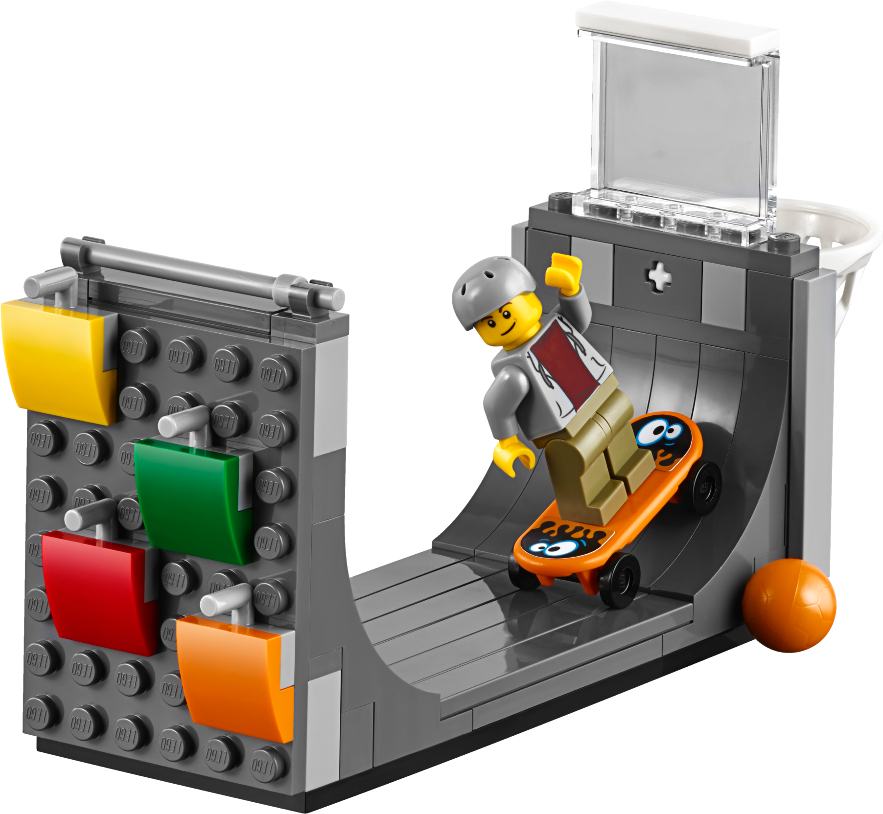Features a 2-story hotel with rooftop terrace, umbrella, lounge chair and opening doors, a museum construction site, an electric car charging station with plug, fast-food kiosk with seat, plus a skate ramp half-pipe with climbing wall and basketball hoop.