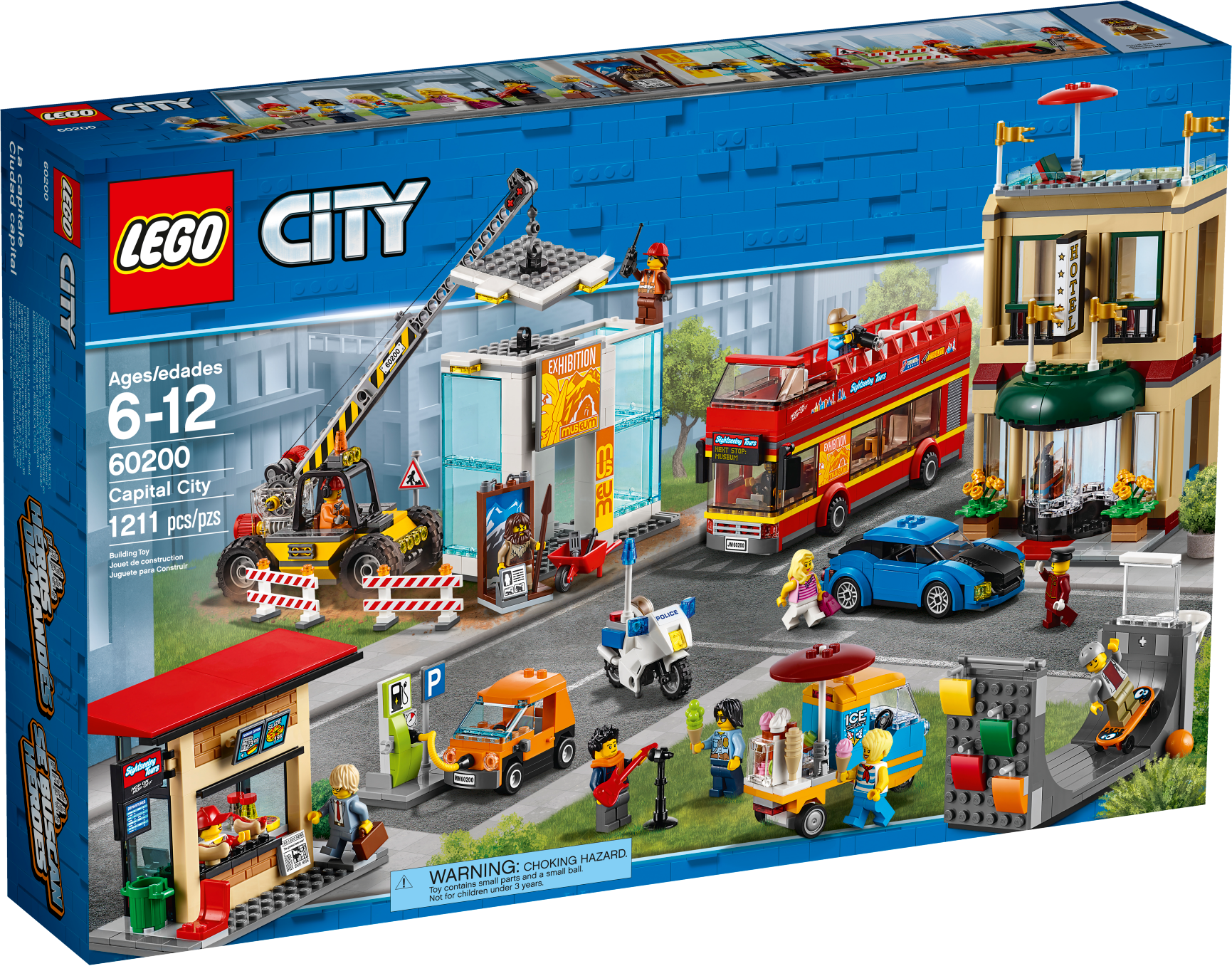 Check out the hustle and bustle of LEGO® City with the awesome downtown 60200 Capital City set! This cool life in the city set features a 2-story hotel with rooftop terrace, museum construction site, kiosk with seat, electric car charging stand and a skate ramp with basketball hoop and climbing wall. This super-fun set also includes a crane with moving arm, a double-decker tour bus, ice cream tuk-tuk, electric car, sports car and a police motorbike, plus 13 LEGO minifigures.