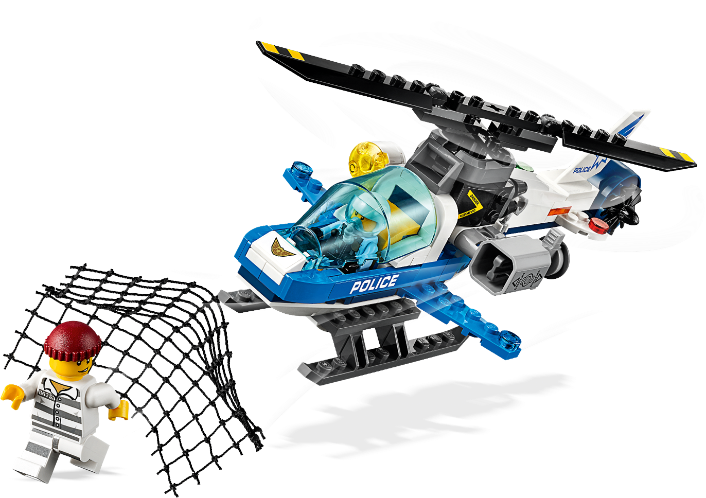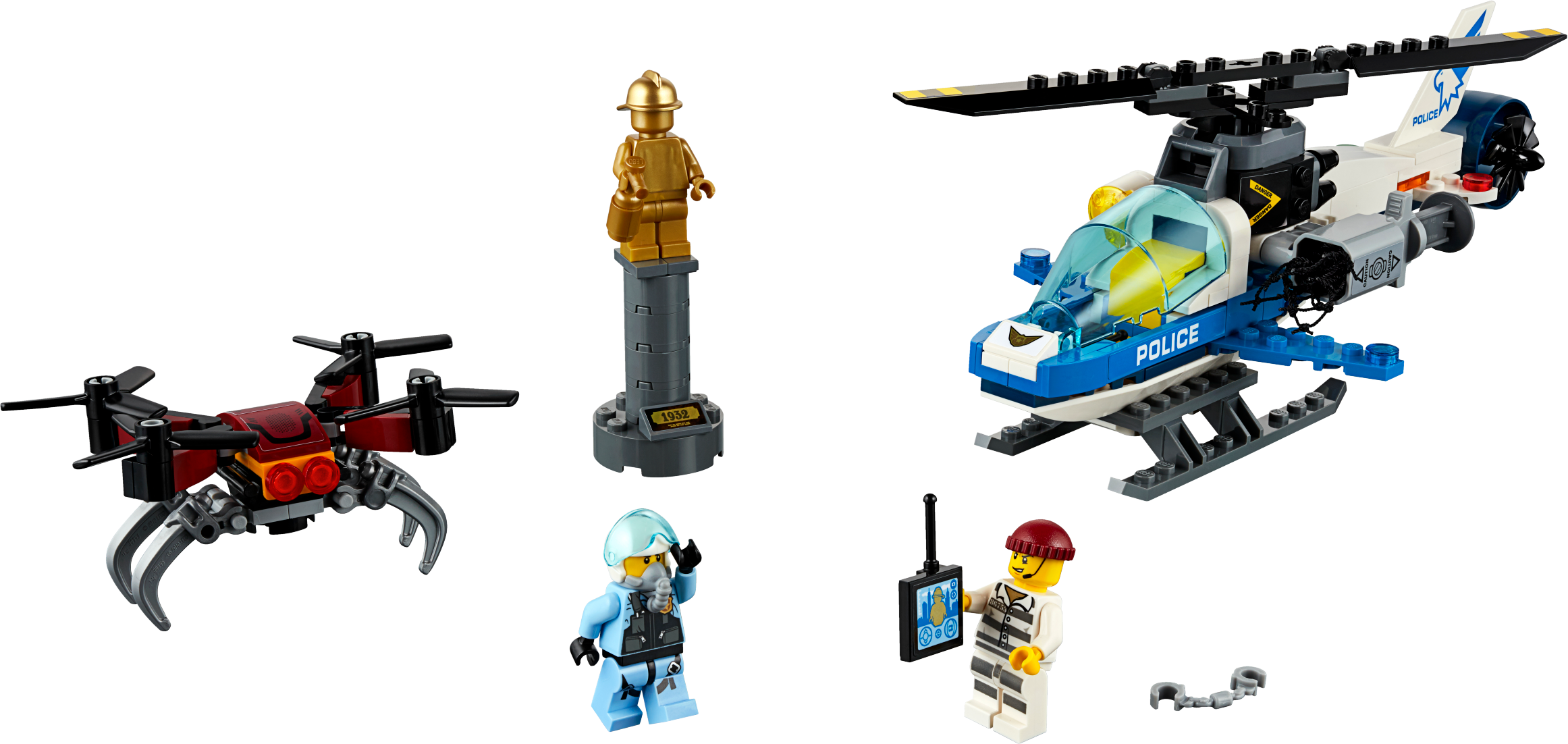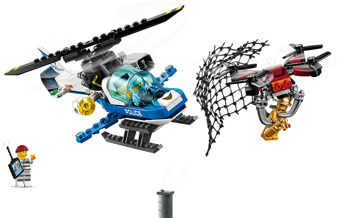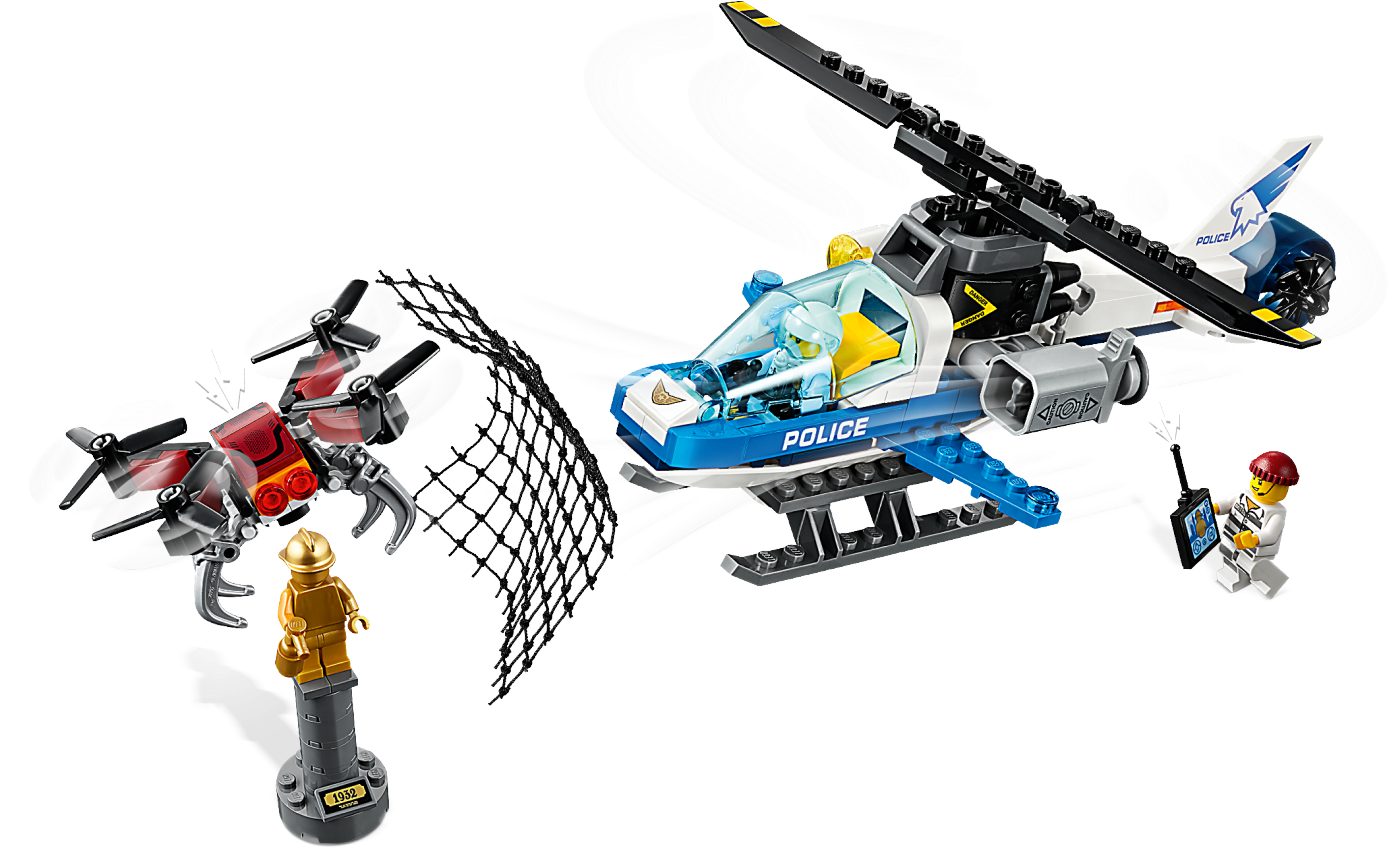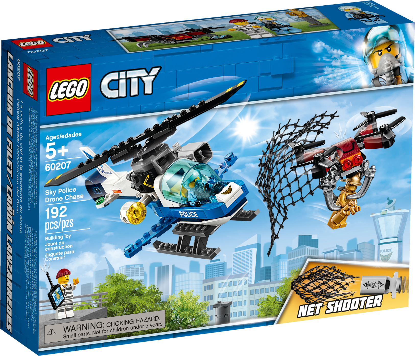 Patrol the LEGO® City streets from above with the exciting 60207 Sky Police Drone Chase set, featuring a police helicopter with opening minifigure cockpit, spinning rotor, searchlight and firing net shooter. This fun police play set also includes a buildable drone with spinning rotors and opening claws, a golden minifigure statue with pedestal, remote-control element, handcuffs and 2 minifigures. Includes 3 LEGO® City minifigures: a Sky Police officer and a crook, plus a golden minifigure statue. Features a Sky Police helicopter with opening cockpit, spinning top rotor, searchlight and a firing net shooter, plus a buildable drone with spinning rotors and opening claws. Accessory elements include a set of handcuffs, net, remote control and a helmet with opening visor and oxygen mask. Spin the rotor on the Sky Police helicopter and take off. Push the plunger to fire the net from the net shooter and capture the drone before it escapes with the golden statue! Sky Police helicopter measures over 3” (9cm) high, 8” (22cm) long and 4” (11cm) wide. Crook’s drone measures over 1” (3cm) high, 3” (9cm) long and 3” (9cm) wide. Golden minifigure statue and pedestal measures over 3” (9cm) high, 1” (3cm) wide and 1” (3cm) deep.