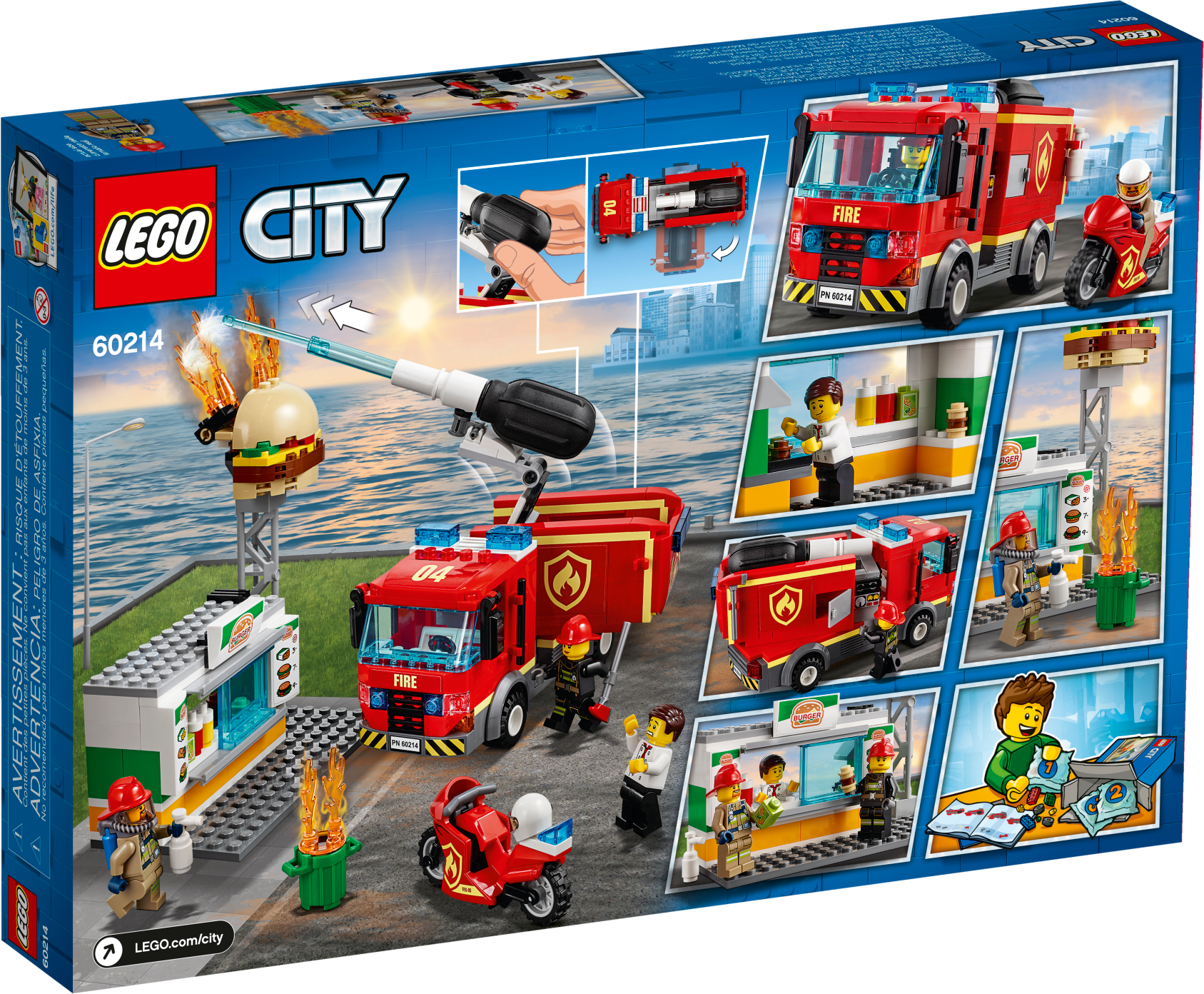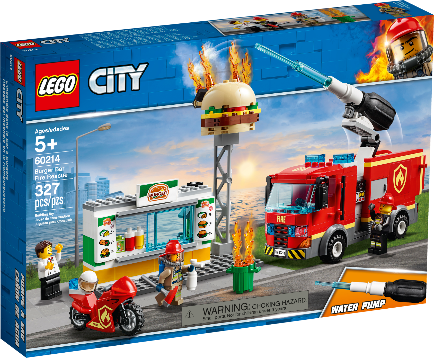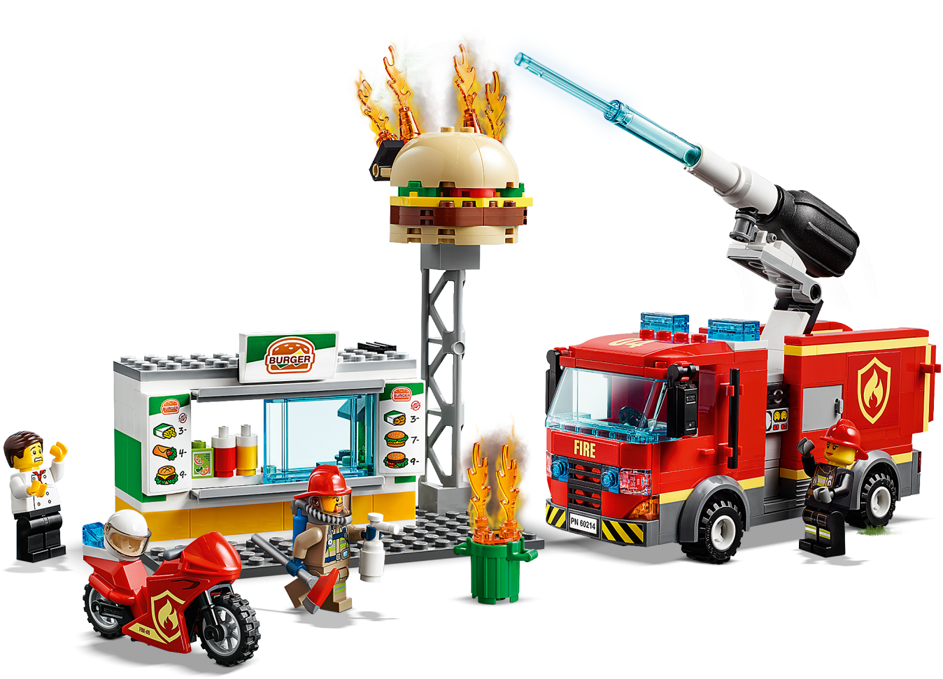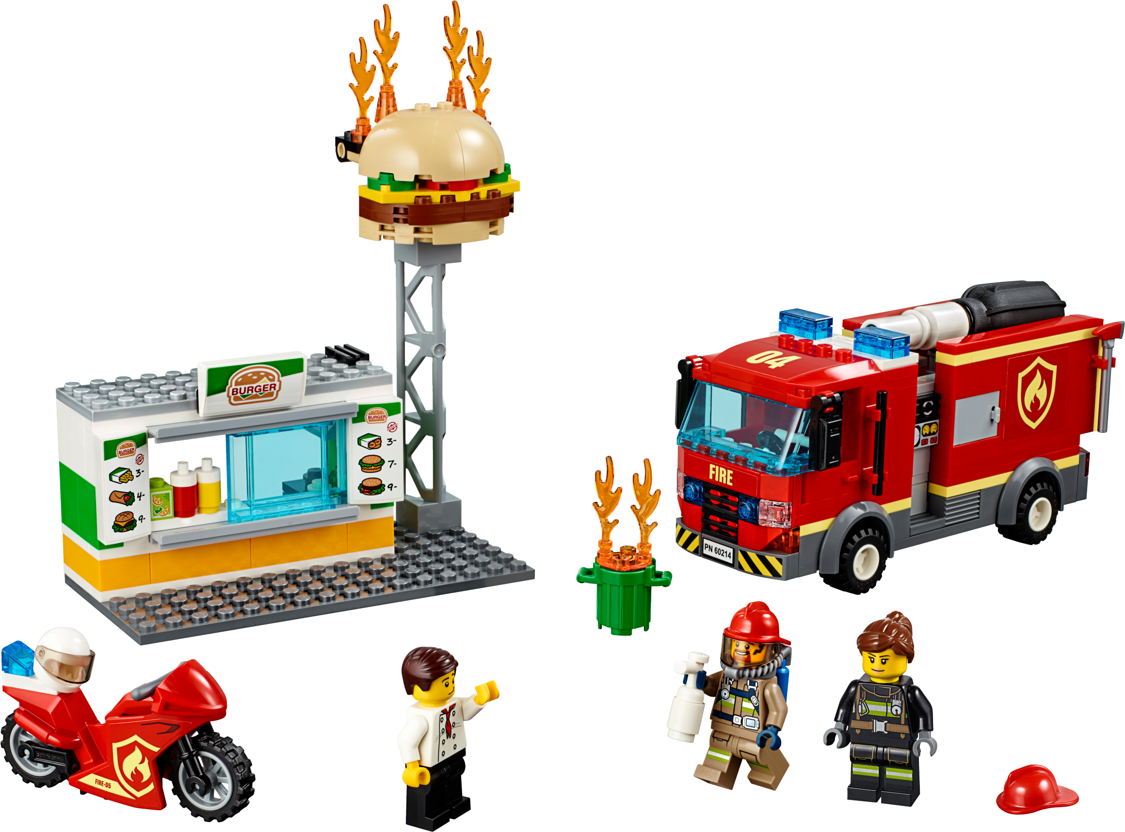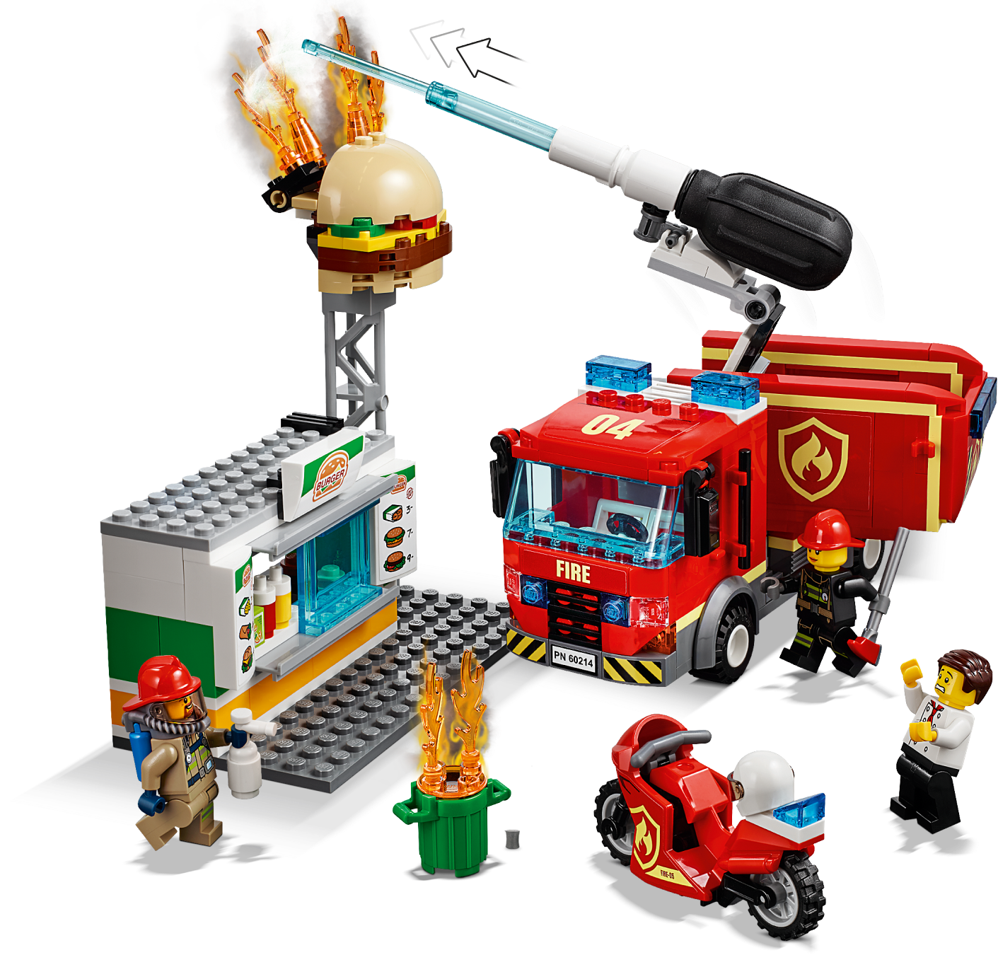 Defend the local burger shop with the awesome LEGO® City 60214 Burger Bar Fire Rescue set, featuring a burger bar with sign and toppling fire elements, sliding service window and trash can. This fun set also features a fire truck with minifigure cab, 2 storage compartments, rotating back end and new-for-January-2019 directional pump with ‘water jet' function. There's also a motorbike with room for a fire extinguisher, new-for-January-2019 fire axe and 3 minifigures.
