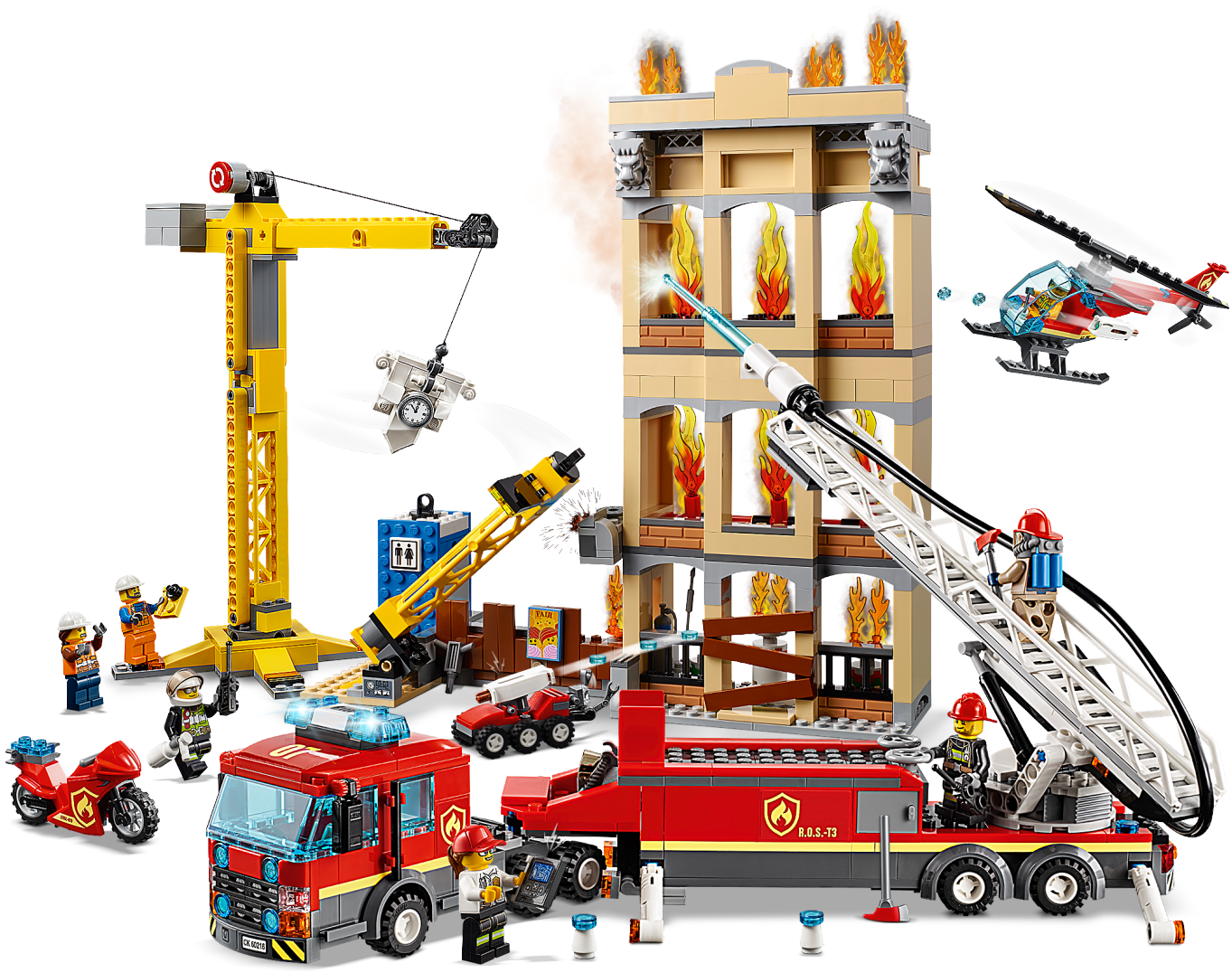 This great set also includes a fire rescue helicopter with opening cockpit, spinning rotors and new-for-January-2019 3-stud shooter, R.O.S.-T3 the remote-operated vehicle (ROV) with extending claws and new-for-January-2019 3-stud shooter, plus a fire motorbike.