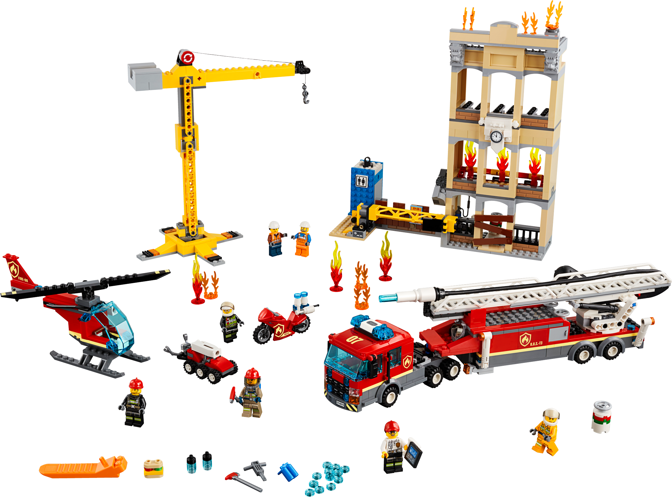 Accessory elements include 2 warning lights, a radio, 2 sets of smoke gear, 12 water elements, jackhammer, sandwich, 2 water bottles, remote-control element for the crane, 2 new-for-January-2019 fire axes and a remote-control element for R.O.S.-T3 the ROV, plus 9 toppling, buildable fire elements.