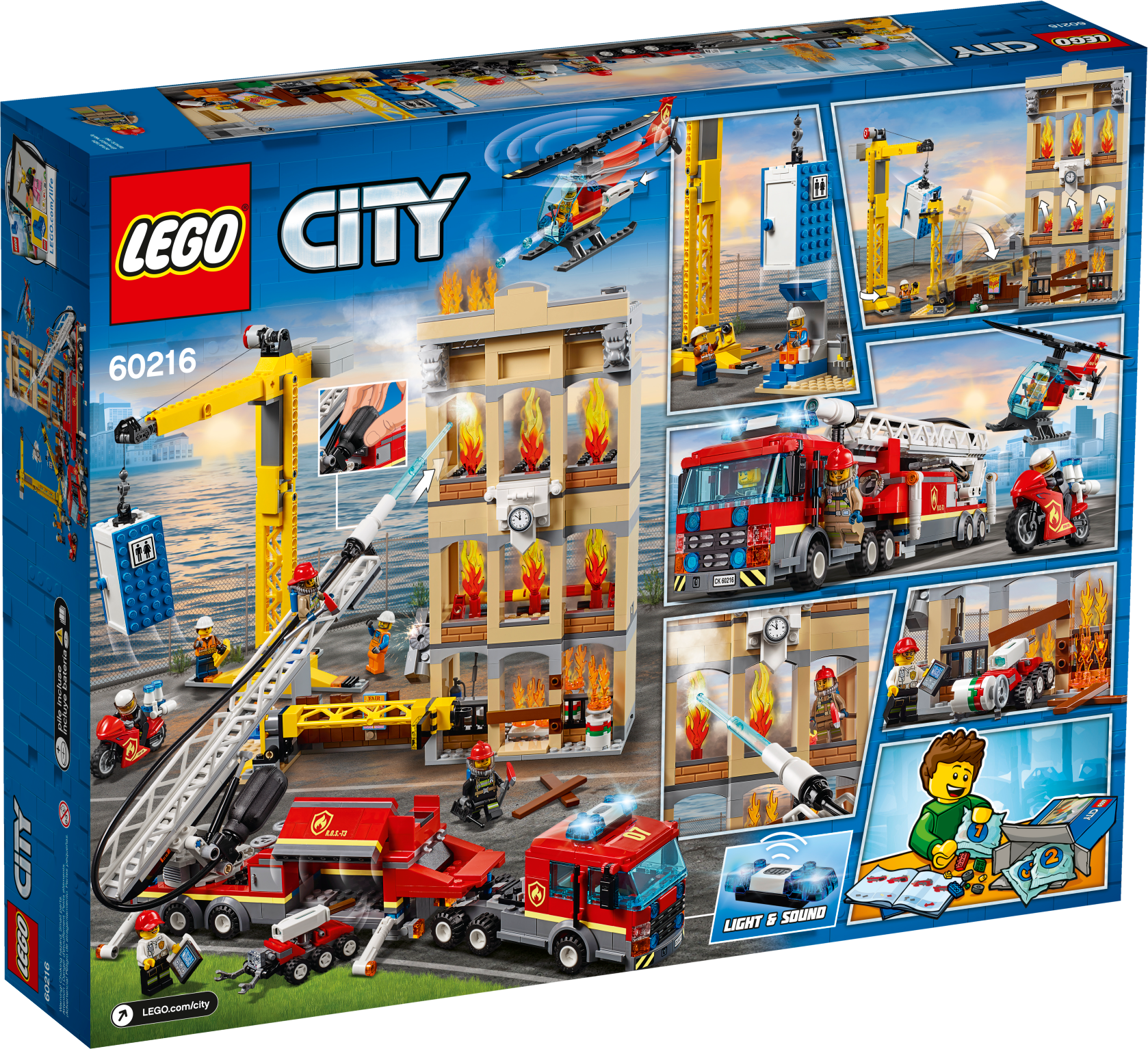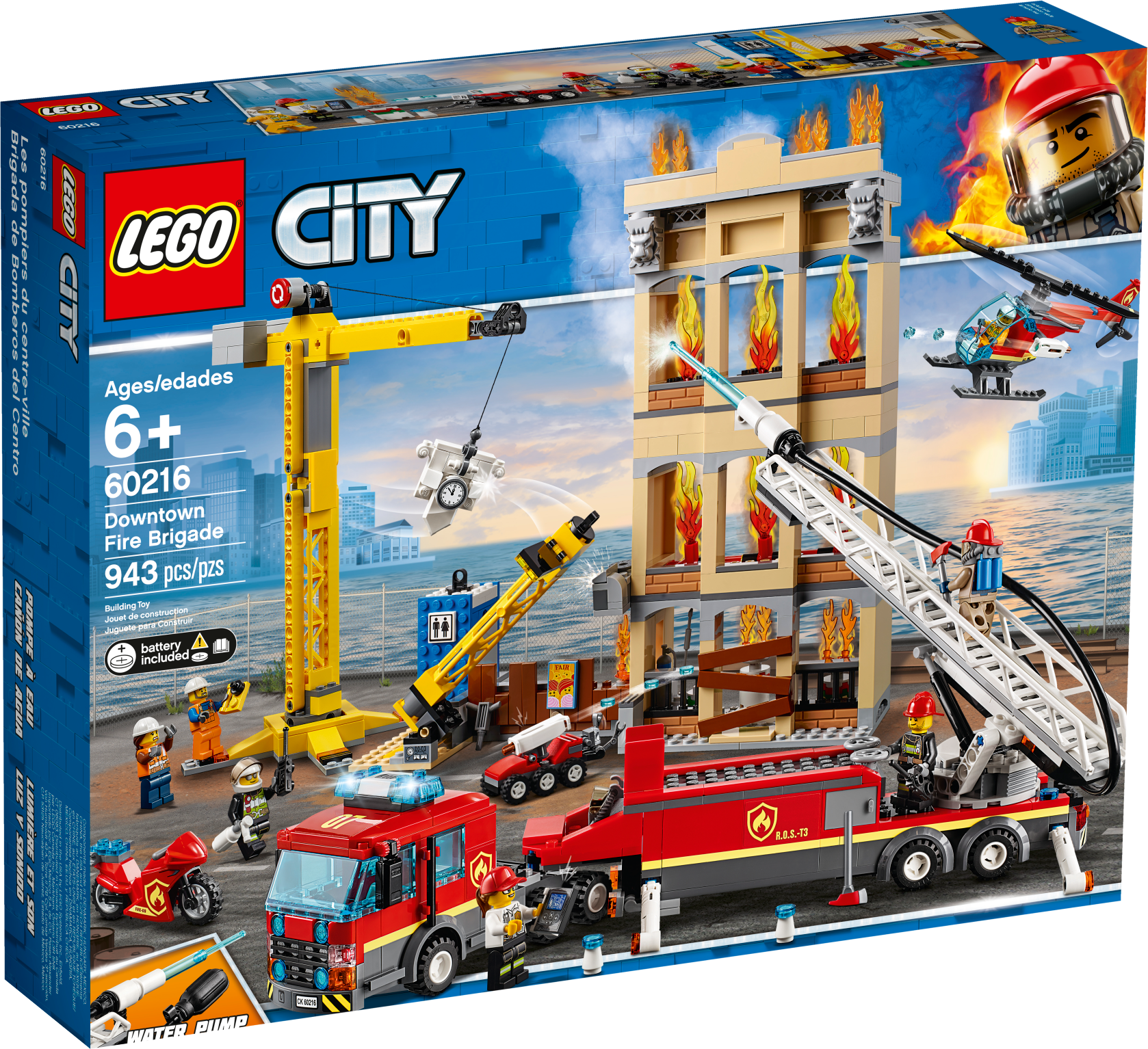 Protect the citizens of LEGO® City with the incredible 60216 Downtown Fire Brigade set, featuring a large fire ladder truck with new-for-January-2019 working light and sound brick, extending swivel ladder and fire hose with new-for-January-2019 pump with ‘water jet' function. This thrilling set also includes a 3-level building with roof, construction area with fence, falling lamppost and a porta-toilet with removable top and front, plus a free-standing crane with rotating arm and functioning winch. There’s also a fire helicopter with opening cockpit and R.O.S.-T3 the ROV, both with a new-for-January-2019 3-stud shooter, and a motorbike with space for warning lights, and 7 minifigures.