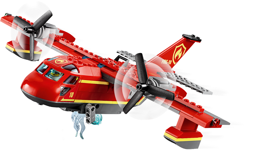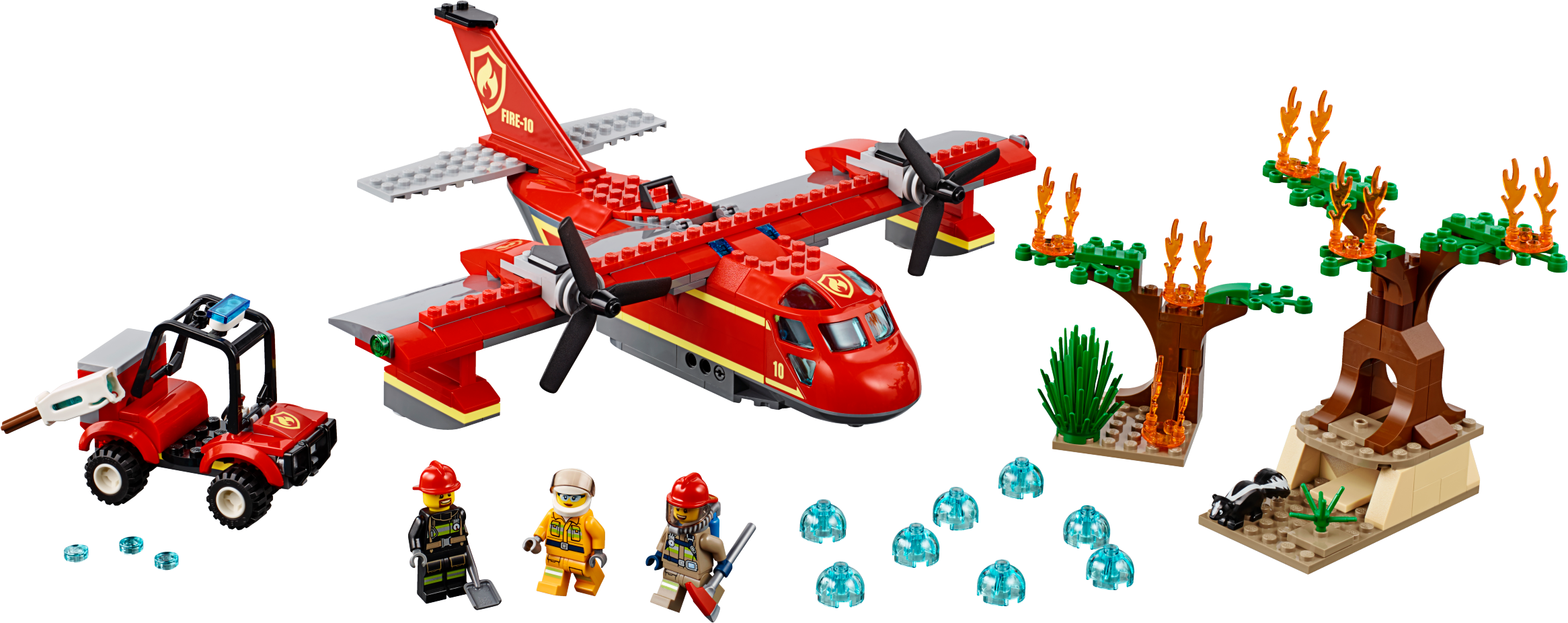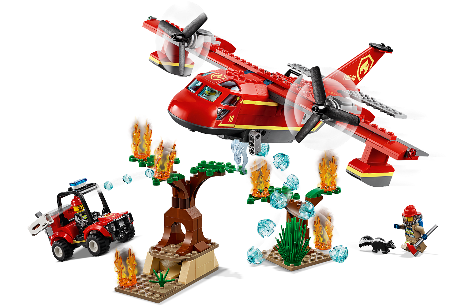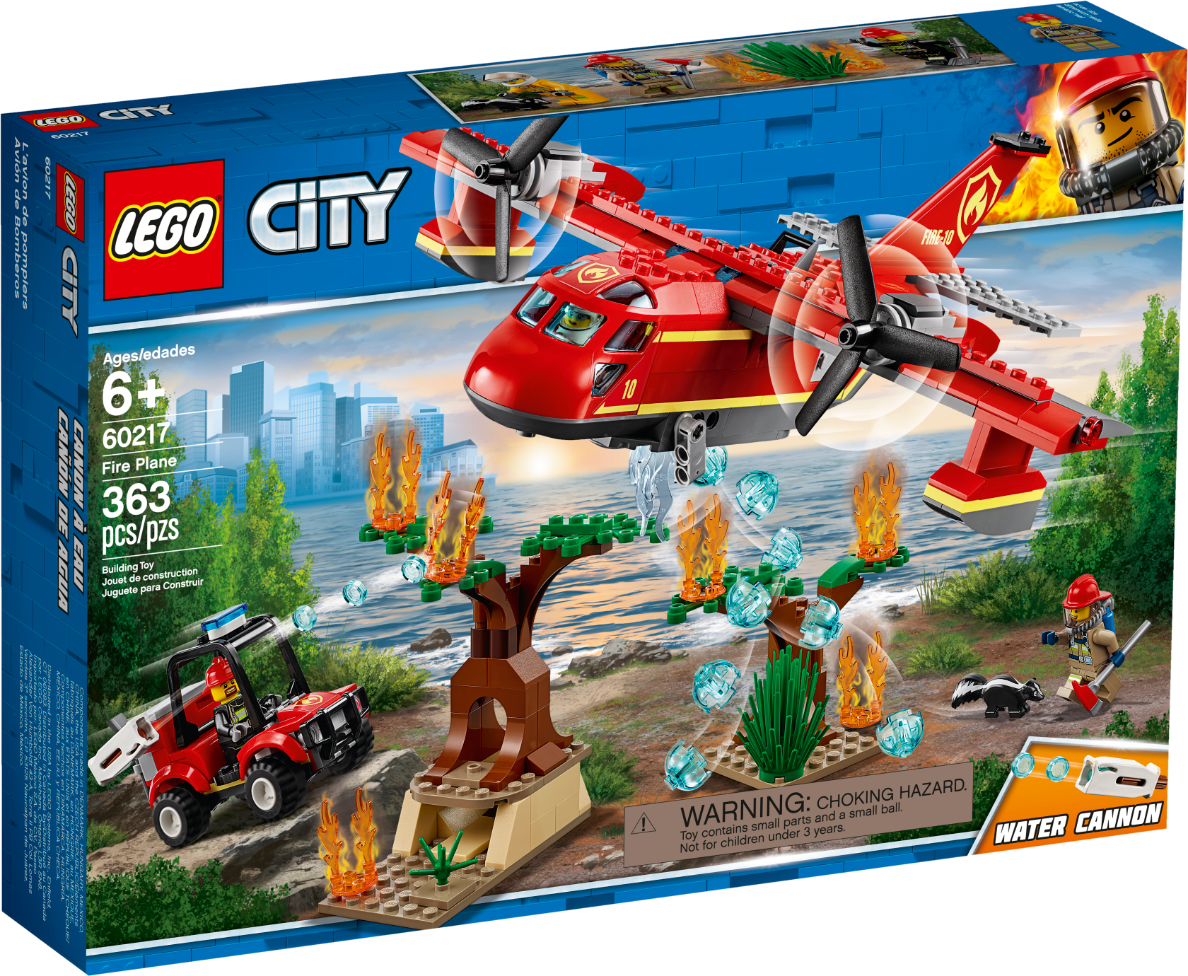 Help the firefighters protect the forest critters of LEGO® City with the exciting 60217 Fire Plane set, featuring a dual-propeller firefighting plane with pontoons, detachable minifigure cockpit, hatch on top to load the water elements and a lever to drop them. This rescue building toy set also includes a fire buggy with new-for-January-2019 3-shot stud shooter, plus 2 trees, 3 minifigures and a skunk figure. Includes 3 LEGO® City minifigures: a pilot and 2 firefighter minifigures, plus a skunk figure. This forest fire rescue set features a fire plane with opening and detachable minifigure cockpit, spinning propellers and opening top and bottom hatches, plus a fire buggy with new-for-January-2019 3-shot stud shooter and roll cage. Also includes 2 buildable burning trees, one with a burrow at the base for the skunk to hide in. Accessory elements include 14 water elements (6 small studs and 8 larger elements), 6 buildable fire elements, and new-for-January-2019 smoke gear set and fire axe. Open the top hatch and fill the plane with water elements. Spin the propellers to launch the plane and head to the fire. Load 3 water elements into the stud shooter and push the plunger to shoot them at the fire and knock it out. Push the lever and release the hatch at the bottom of the plane to drop the water elements on the flames and knock them down. Put on your smoke gear and head into the forest fire to rescue the skunk. Fire plane measures over 3” (10cm) high, 11” (28cm) long and 12” (33cm) wide. Fire buggy measures over 2” (7cm) high, 4” (11cm) long and 1” (5cm) wide. Tree with skunk burrow measures over 3” (10cm) high, 4” (12cm) wide and 3” (9cm) deep.