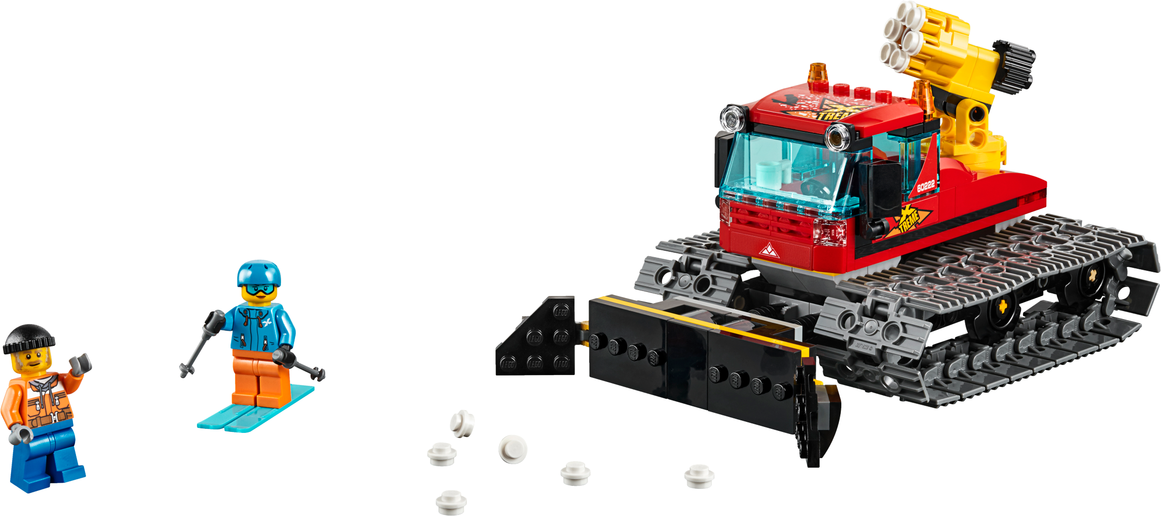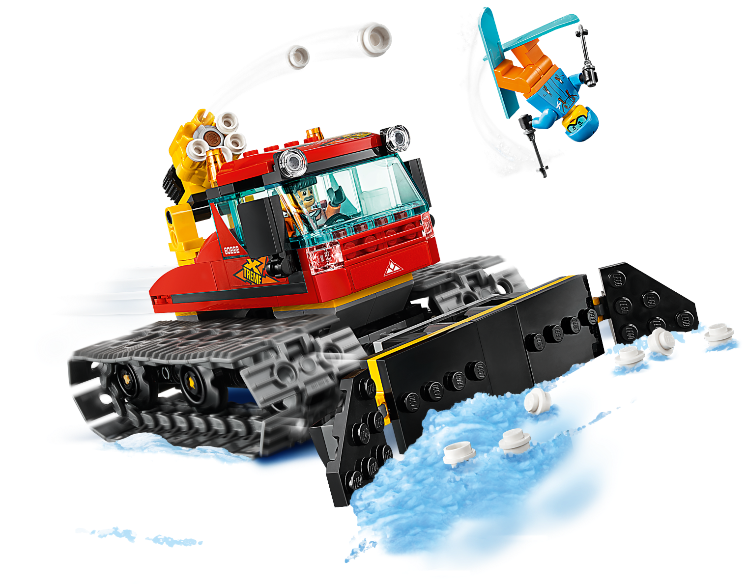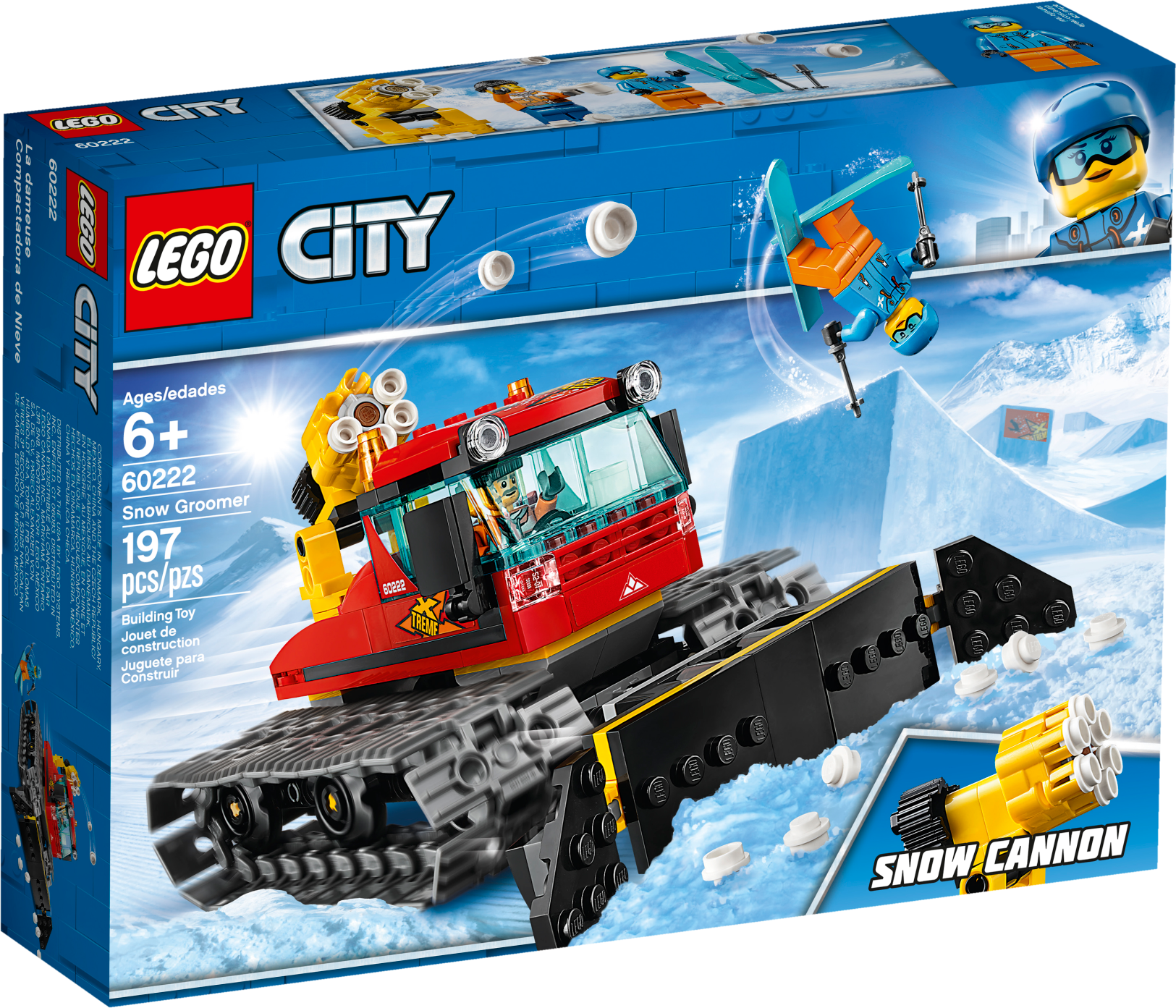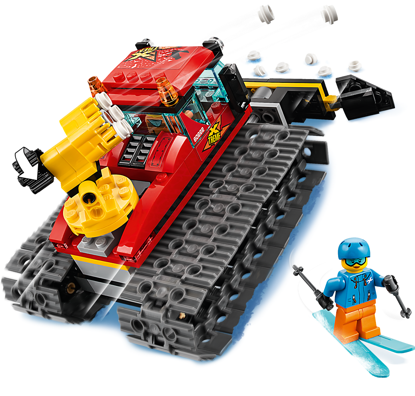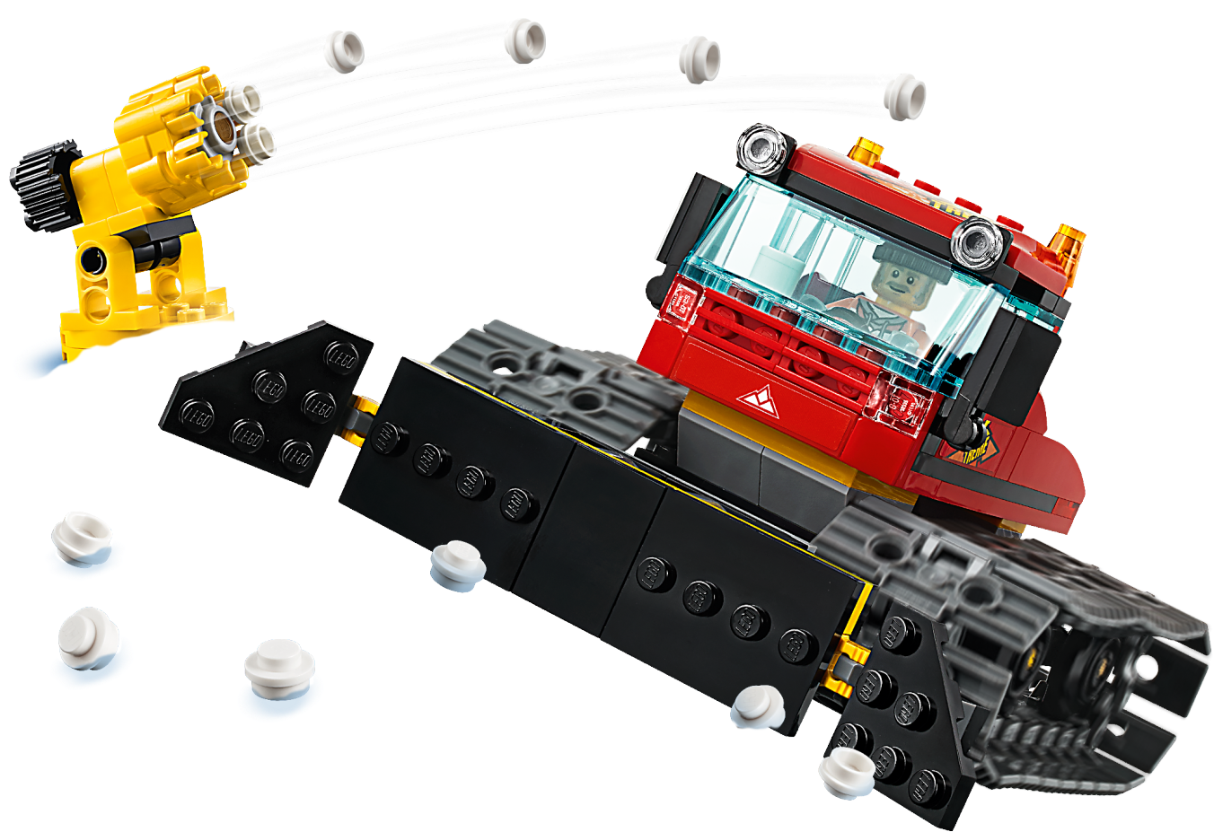 Features a detailed Snow Groomer with a minifigure cab, opening roof, sturdy segmented tracks and a large front plow blade, plus swiveling 6-stud rapid shooter snow cannon.