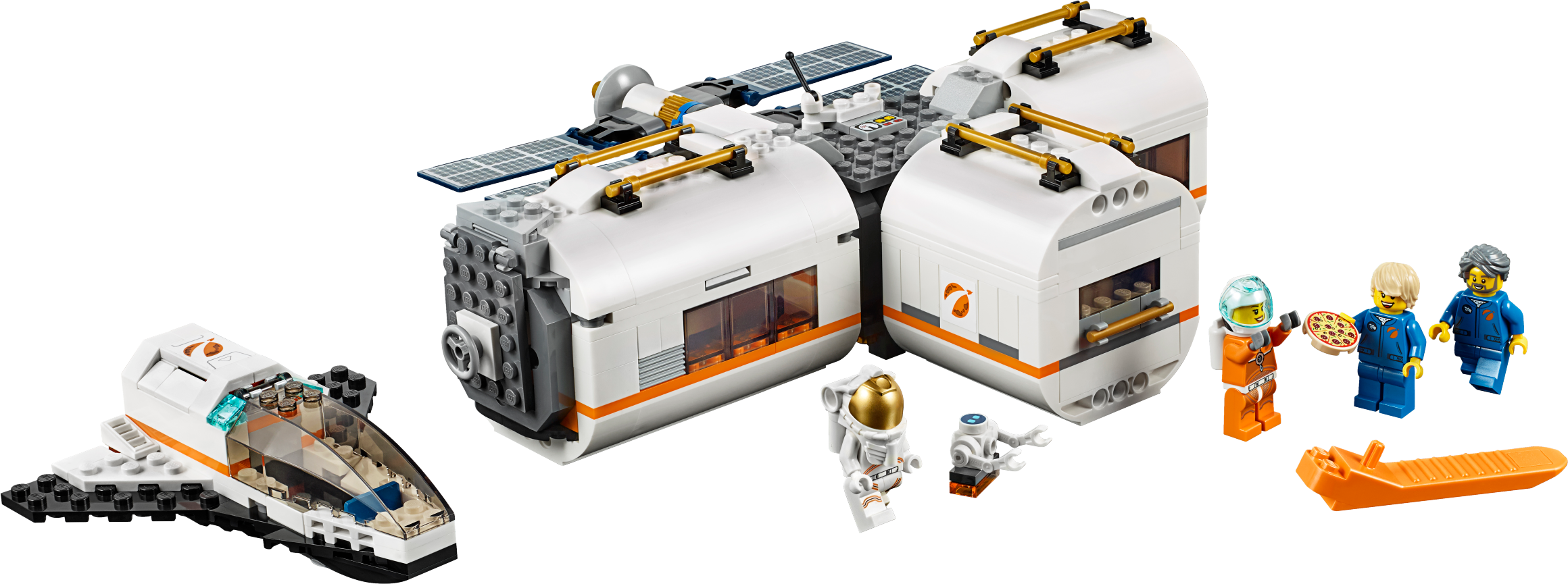 This space station toy set features 3 detachable modules with removable roofs: a living module with a treadmill, anti-gravity bed and TV screen, lab module with light brick and research tools, kitchen module with plants and a pizza oven, plus a central airlock compartment. The modules can be put together in different ways around and on the central airlock compartment.