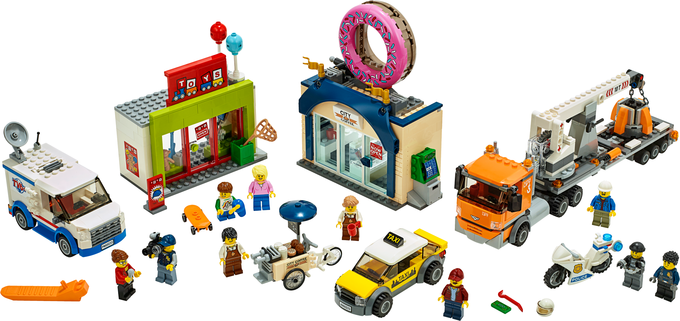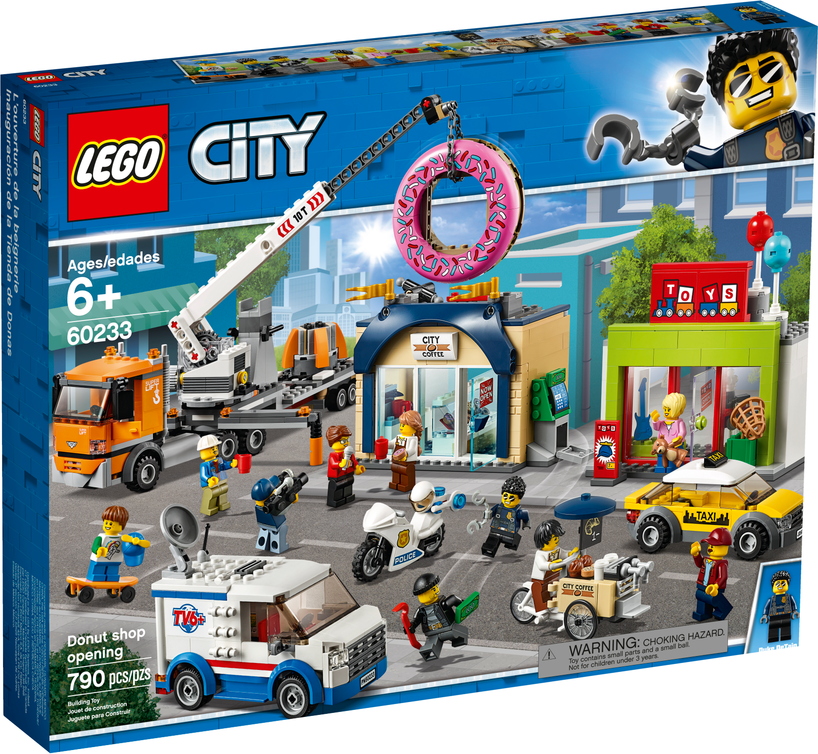 Give young urban explorers a treat with an action-filled set inspired by the LEGO® City animated TV series. This cool 60233 Donut Shop Opening toy town playset features a truck and crane trailer with an extending boom arm, platform and extendable stabilizing legs, news van with opening roof and satellite dish, taxi, police motorbike and a new-for-June-2019 coffee cargo bike. This fun set also includes a toy shop and a donut shop with ATM and release trigger to launch the giant donut from the top of the building. Give any LEGO builder an amazing building experience with Instructions PLUS, available in the LEGO Life app for smartphones and tablets. The easy-to-use, intuitive building instructions let them zoom, rotate and visualize their creation using the special ghost mode as they go. Instructions PLUS is also great for younger builders, guiding them through the building process for a greater sense of independence and achievement. This cool construction playset toy includes 10 minifigures.