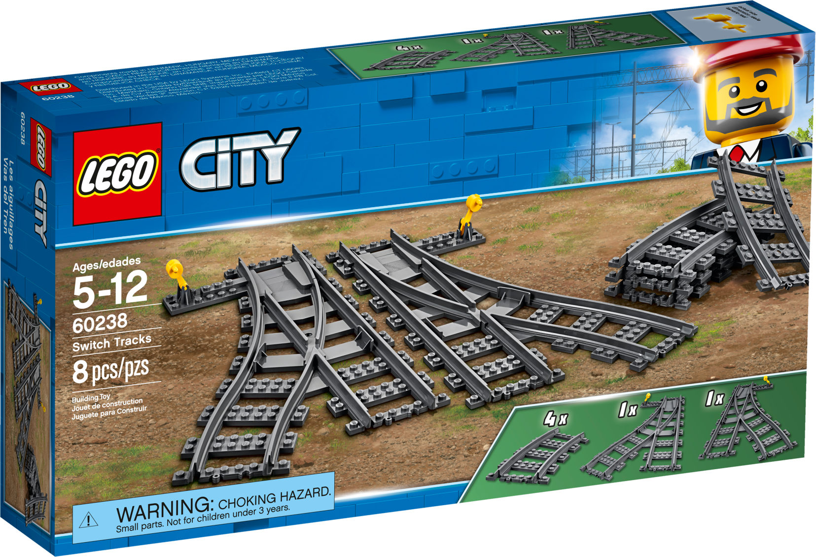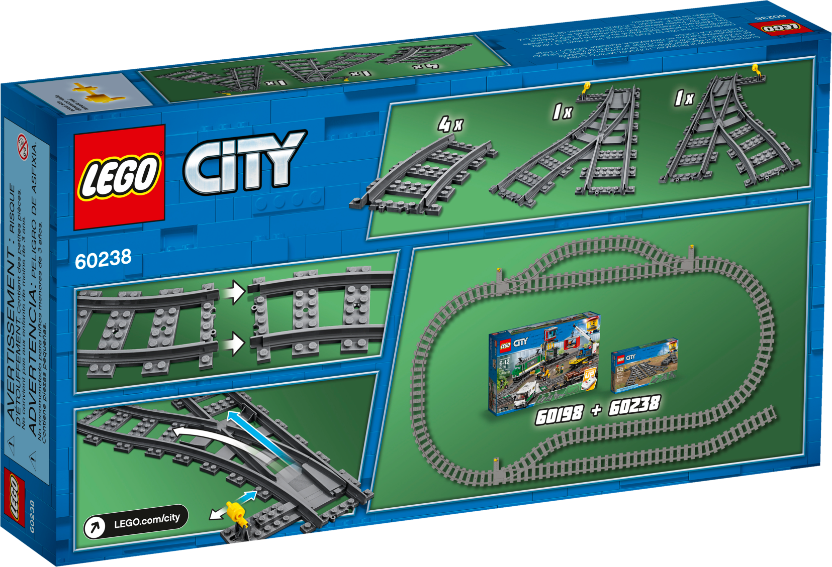 Build up your cargo train tracks with the LEGO® City 60238 Switch Tracks set, to help make hauling or carrying passengers even more exciting. This set, comprised of 4 curved tracks, a right-facing switch track and a left-facing switch track, is compatible with your existing train sets.