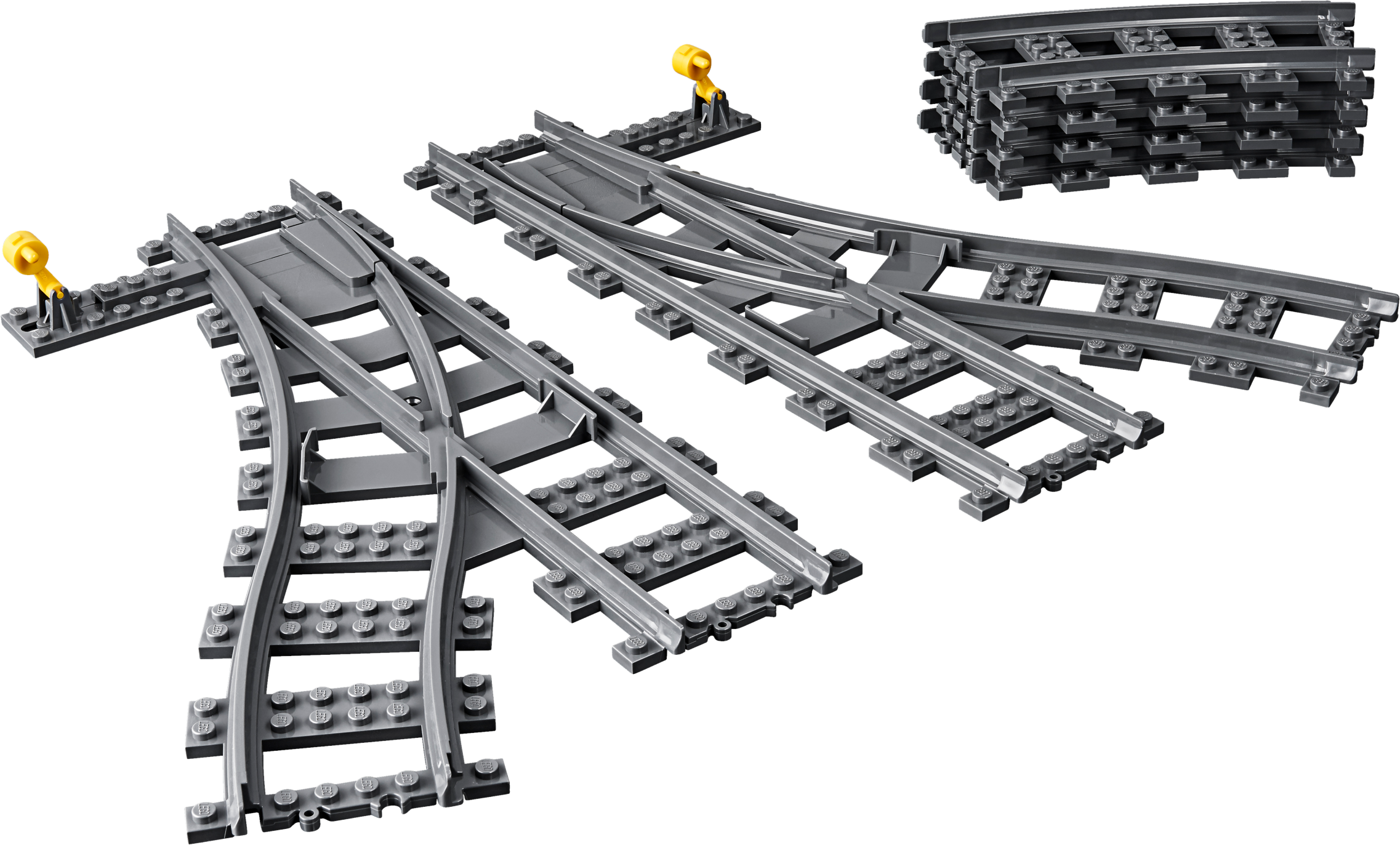 Features 4 curved tracks, 1 right switch track and 1 left switch track.