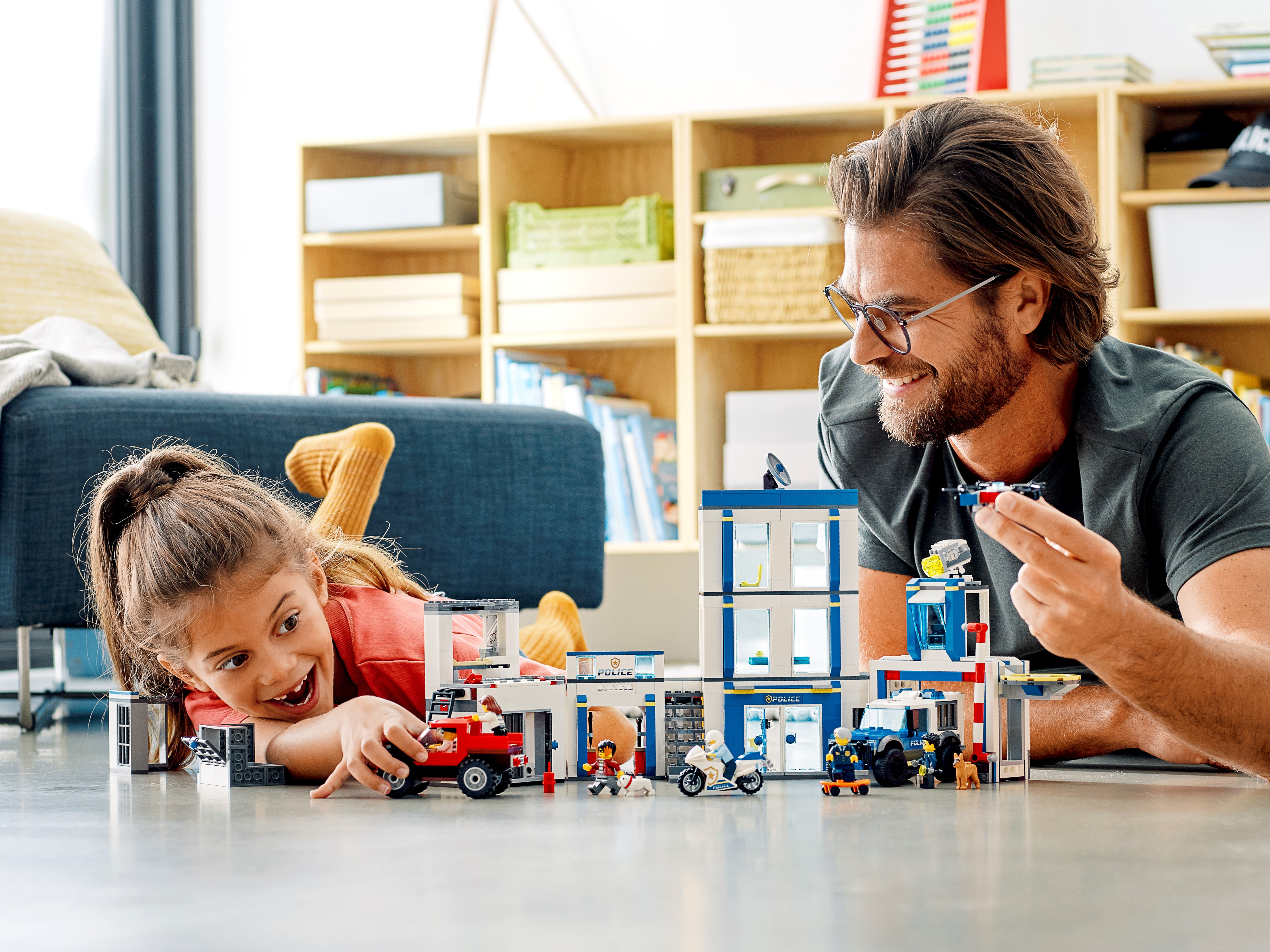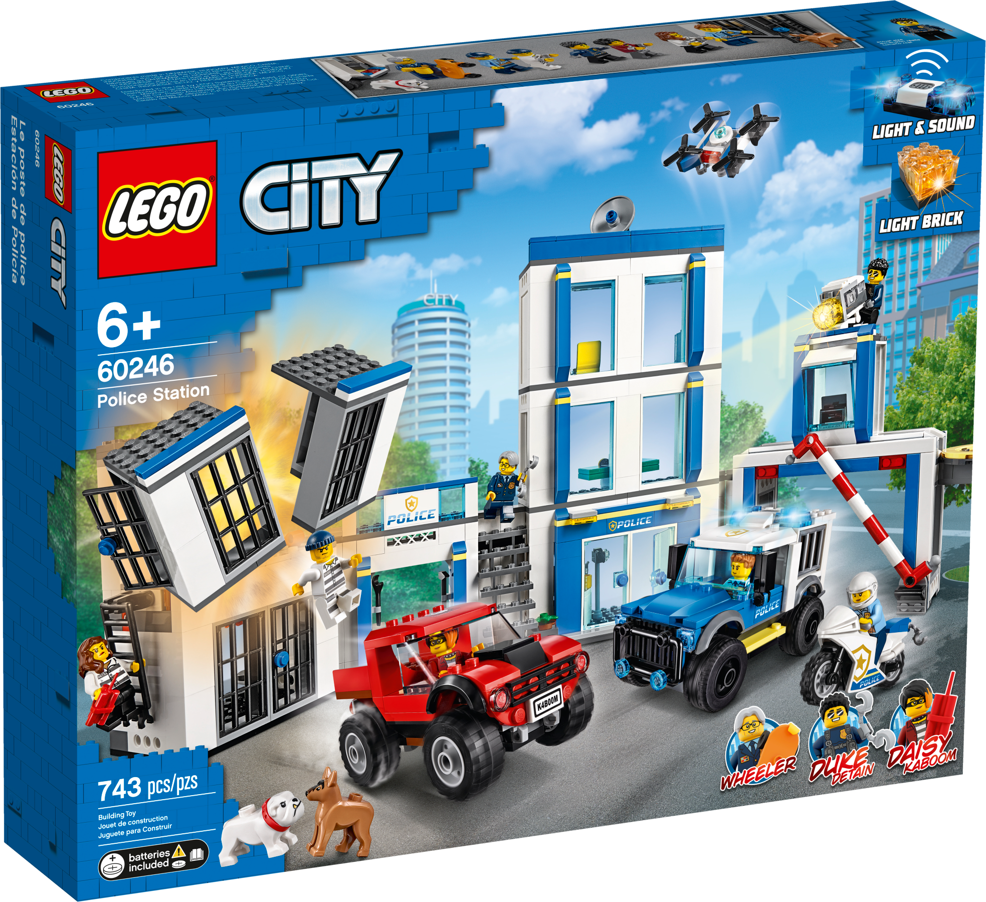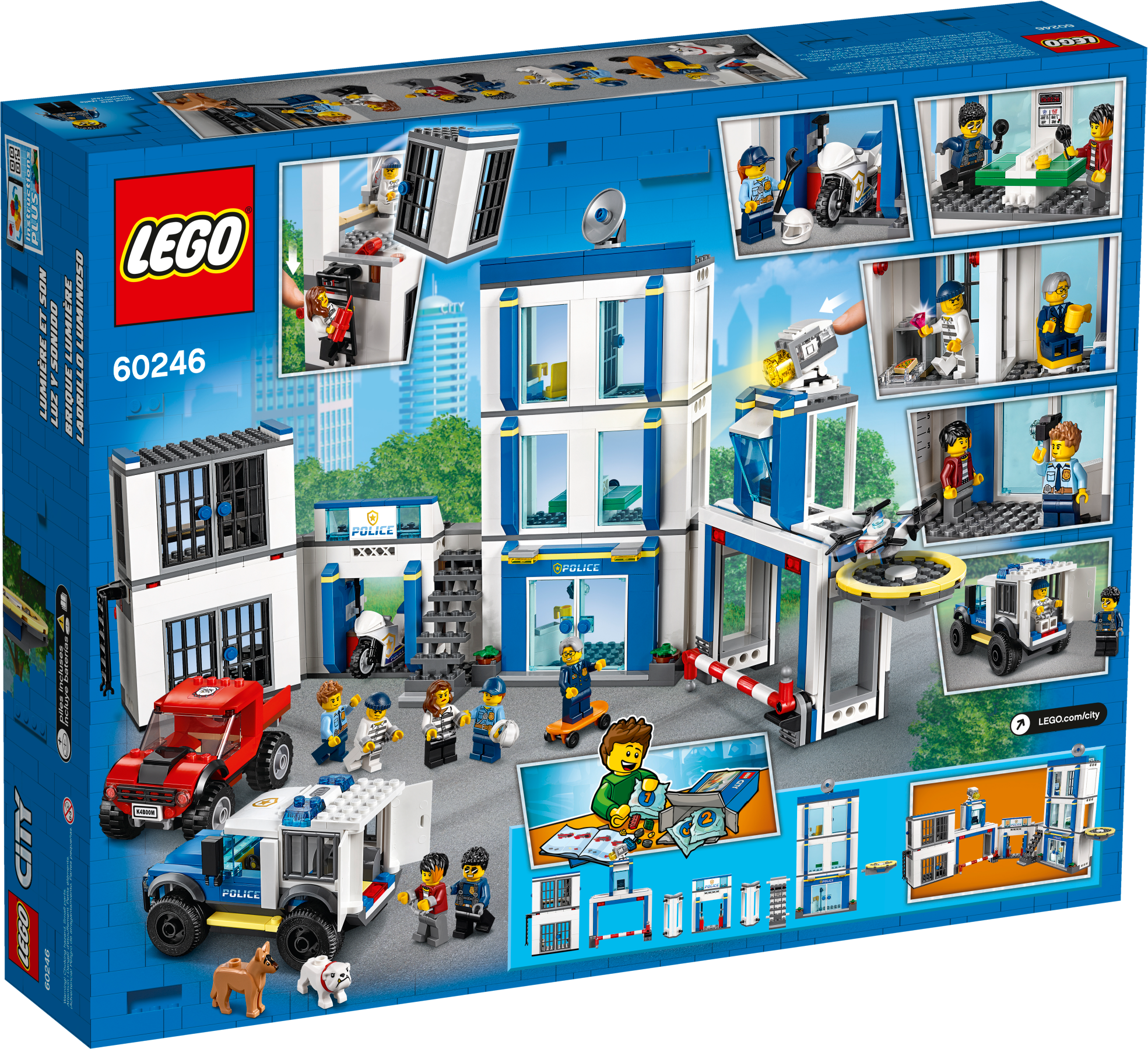 Everything is awesome about the LEGO® City Police Station (60246) playset. Little law enforcers and fans of the LEGO City TV series will love creating stories with a host of fun characters, including Duke DeTain, Chief Wheeler and Daisy Kaboom. This exciting set includes a police station with a light-brick searchlight and a police car with sound-brick siren, plus a cool truck, motorcycle and surveillance drone.A building toy with a little extraWith this toy playset you get a simple building guide and Instructions PLUS! Part of the free LEGO Life app for smartphones and tablets, this interactive building guide features zoom and rotate viewing tools that help budding LEGO builders become master builders.LEGO City – Cool toys for kidsLEGO City police playsets deliver an exciting build-and-play experience. With realistic vehicles, detailed buildings and fun characters, kids can create stories and scenarios that depict real city life in a fun and imaginative way. Here’s a great building set for kids who love action-packed building toys. This LEGO® City Police Station (60246) playset has an exploding cell, cool vehicles and fun characters. The fun starts the moment you open the box. What’s in the box? A toy police station, 2 trucks, a motorcycle and a drone. You also get 6 minifigures, including Duke DeTain, Chief Wheeler and Daisy Kaboom from the LEGO® City TV series, plus 2 dog figures. Children can have fun with the feature-rich police headquarters model with jailbreak explosion function and light-brick searchlight, plus a police car with a sound-brick siren – a delight for LEGO® City police fans. This LEGO® City Police Station playset is ideal for children aged 5 and up. It makes a great Christmas, birthday or any-other-day gift for kids who love role-play toys, model vehicles and action toys. When built, the toy police station building measures over 9” (24cm) high, 18” (48cm) wide, and 5” (15cm) deep, while the police truck measures over 2" (6cm) high, 4" (12cm) long and 2" (7cm) wide. Both the sound brick and light brick in this playset require a 1xCR1216 coin cell battery. The good news? They’re included! So the sound and light play can start right away. You’ll find a simple building guide in the box. Or you can download Instructions PLUS – part of the free LEGO® Life app. This interactive building guide with zoom-and-rotate viewing tools makes building child's play! LEGO® City police sets nurture kids' physical skills and confidence with feature-rich buildings, realistic vehicles and fun characters that inspire open-ended creative play. LEGO® building bricks meet the highest industry standards as well as The LEGO Group's rigorous quality criteria, so they're consistent, compatible and easily click together and apart – every time. At The LEGO Group, we drop, squash, twist, heat, bite, bend, scratch and stretch LEGO® bricks and pieces to make sure every playset meets the highest global safety and quality standards.