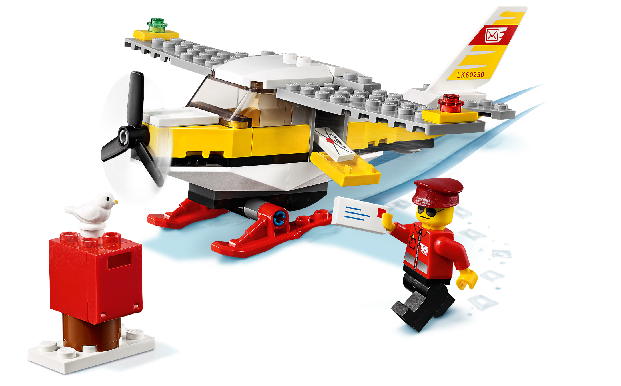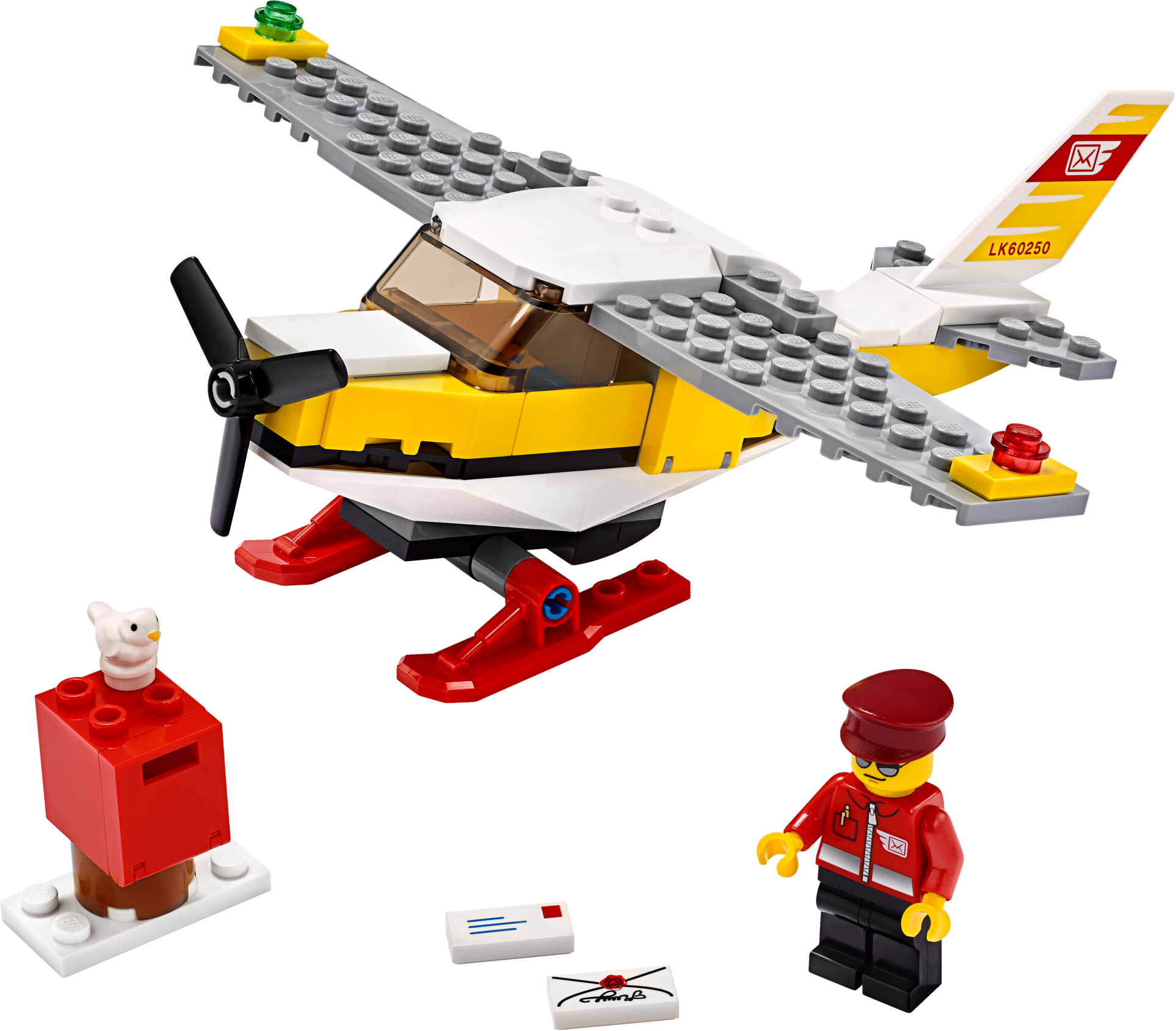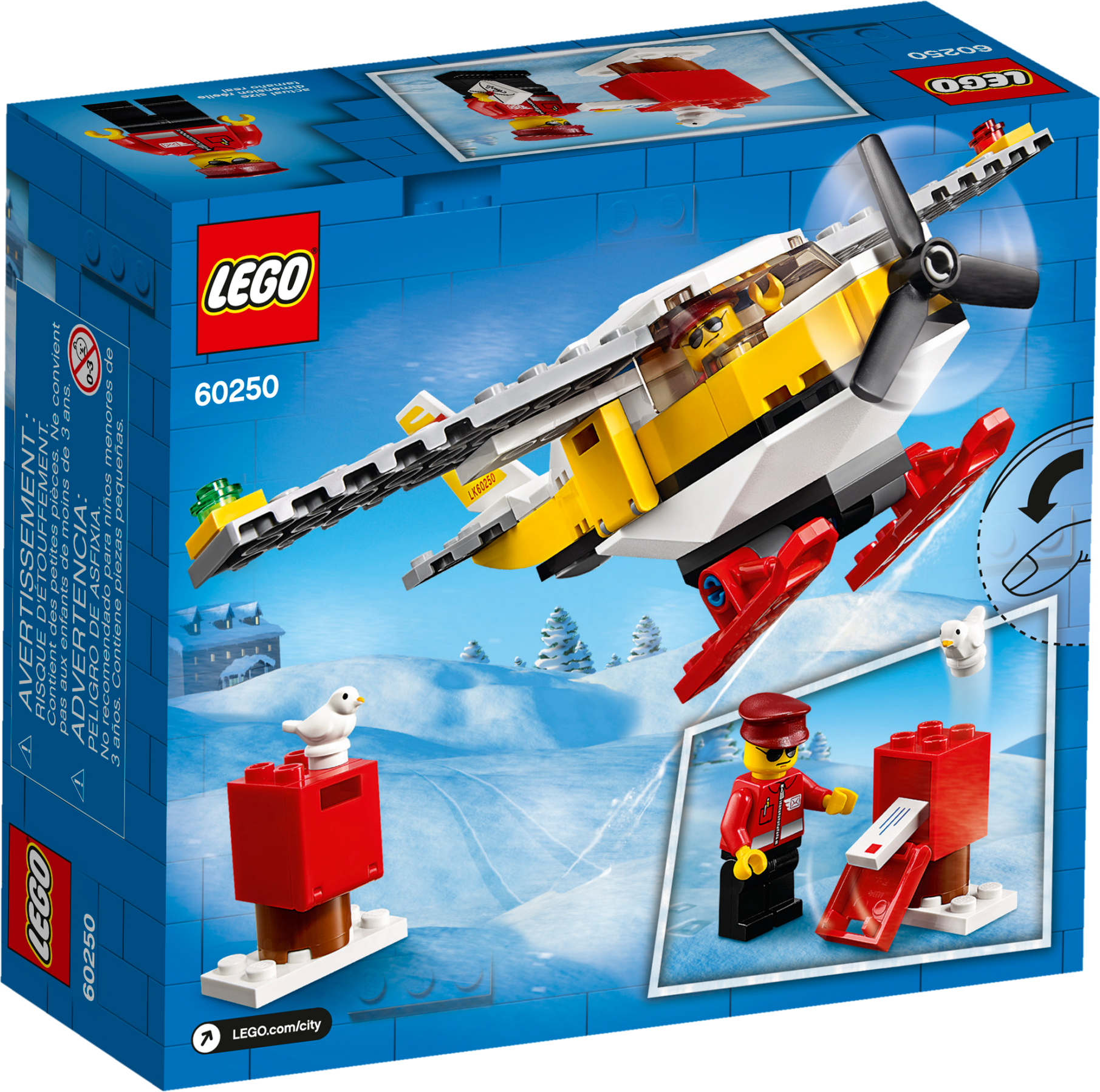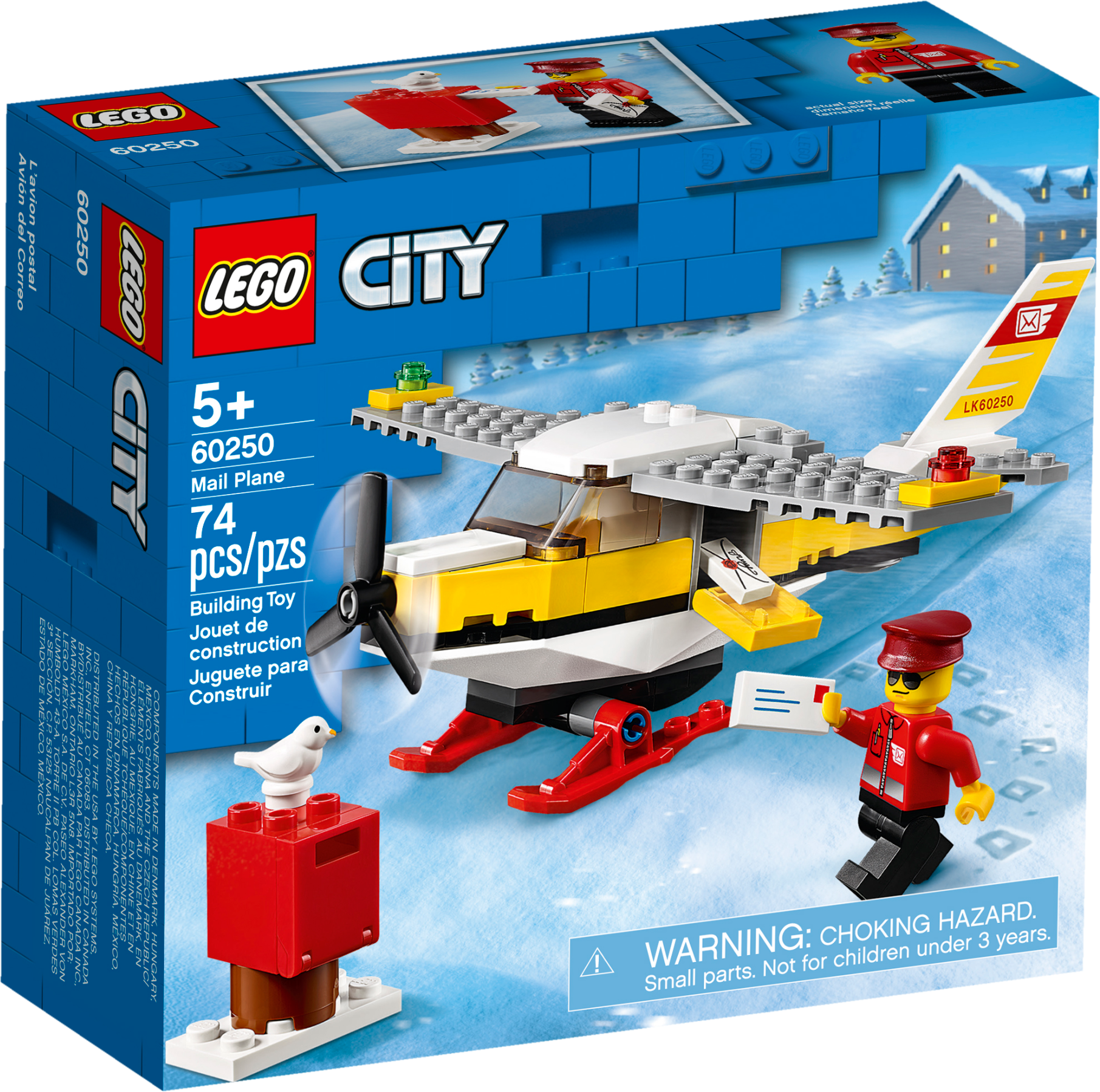 Kids’ imaginations are free to soar with this LEGO® City Mail Plane (60250) building toy. Youngsters can become everyday heroes, delivering mail to snow-covered landscapes where perfect piloting skills are a must. This cool little airplane comes with a spinning propeller, snow skis and a postal pilot minifigure.Fun airplane building set for kidsThis airmail playset toy comes with easy-to-follow building instructions that provide budding LEGO builders with a satisfying, independent build and play experience – so your little postal pilot will be up and flying in no time!LEGO City Great Vehicles – Cool toys for kidsKids grow up surrounded by amazing vehicles and machines on land, air and water. That’s why LEGO City Great Vehicles sets make great gifts for kids. With these fun building sets, kids get to explore their favorite vehicles up close. The feature-rich models inspire open-ended, imaginative play that reflects real life in a fun and exciting manner.Treat youngsters to the excitement of LEGO® City with this cool Great Vehicles mail plane building set – designed to inspire open-ended, imaginative role-play based on real-life scenarios.What's in the box? A cool LEGO® City Mail Plane toy with room in the cockpit for the postal pilot minifigure, plus a mailbox and letter and a toy bird figure. Everything a child needs for fun, independent play.This mail plane toy has a spinning propeller, open minifigure-cockpit, snow skis and cool decoration on the tail. Kids can also combine this set with other original LEGO® playsets for fun play and cool displays.This LEGO® City (60250) playset makes a great Christmas, birthday or any-other-day gift for kids aged 5 and up and for boys and girls who love model airplane kits. Requires only very basic building skills.This action-packed construction toy makes a great any-day or birthday gift for boys and girls aged 5 and up who love imaginative play. Requires only very basic building skills.When built, the LEGO® City Mail Plane measures over 1" (5cm) high, 6" (16cm) long and 6" (17cm) wide.No need for batteries! This cool airplane toy is powered by kids’ imaginations – so play can start right away!This toy airplane set comes with a printed building guide that will have your little postal pilot up and flying in no time!LEGO® City Great Vehicles sets inspire open-ended, imaginative play, where children can explore all kinds of vehicles and create play scenarios that reflect real-life in a fun and exciting way.All LEGO® City Great Vehicles playsets meet the highest industry standards, ensuring these fun kids’ toys continue to connect and pull apart easily.At The LEGO Group, we drop, squash, twist, heat, scratch and stretch LEGO® City building toys to make sure every playset meets the highest global safety and quality standards.