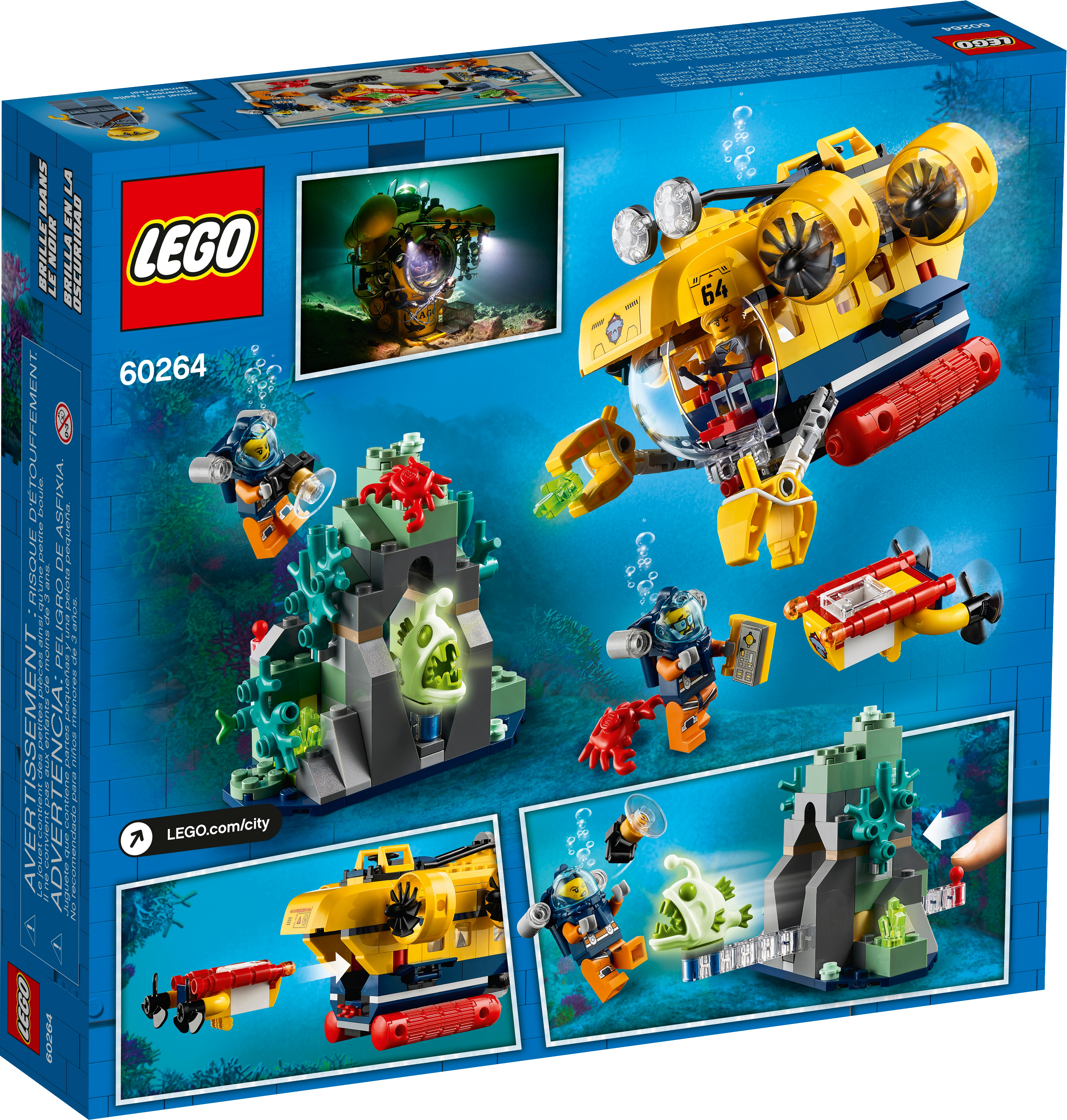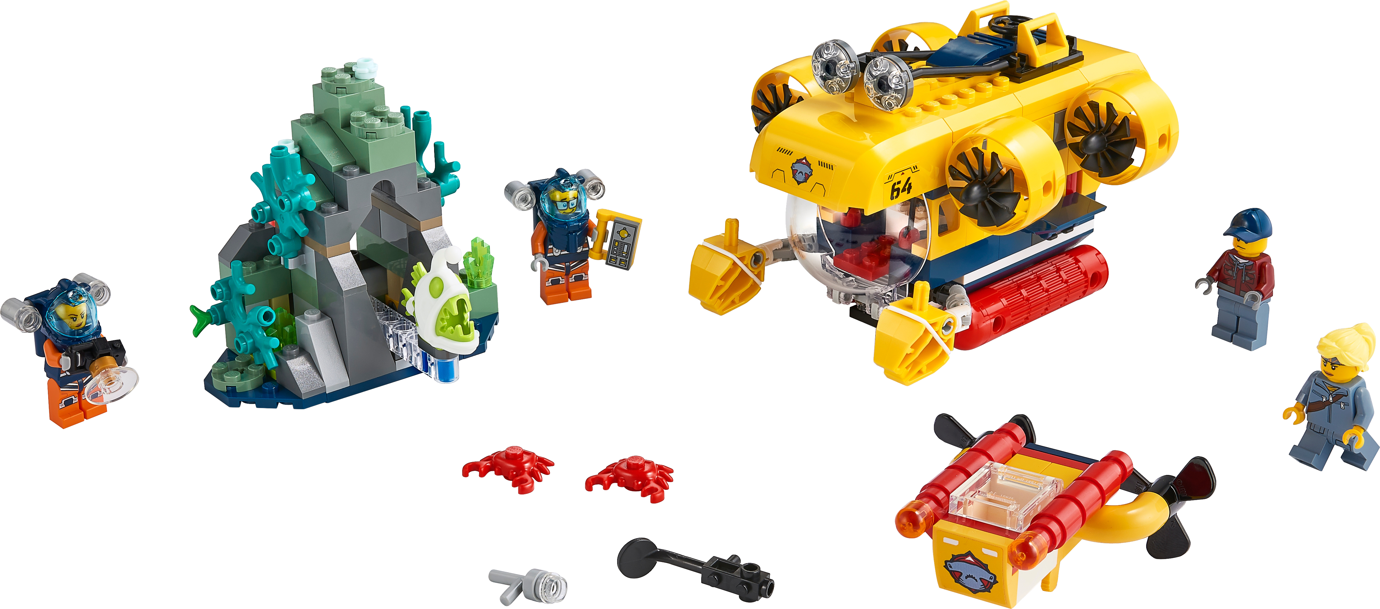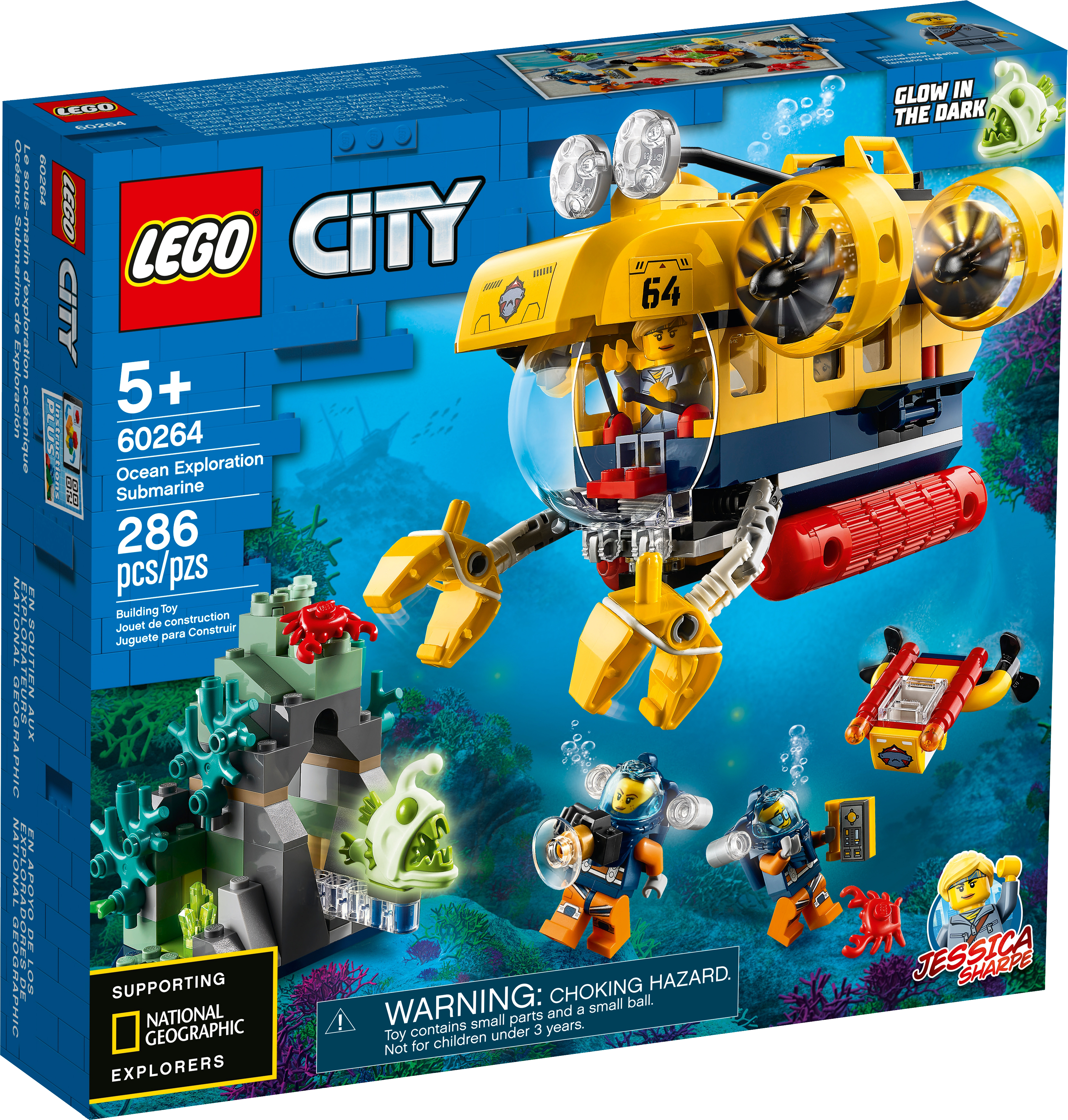 Kids can play out exciting sea exploration adventures with this LEGO City Ocean Exploration Submarine (60264) playset, featuring an awesome toy submarine, underwater drone and a seabed-cave setting. And with 4 explorer minifigures, including Jessica Sharpe from the popular LEGO City Adventures TV series, a glowing anglerfish and hidden treasure, the scene is set for endless fun and adventure!Great building set for kidsThis building set comes with simple building instructions and Instructions PLUS – part of the free LEGO Building Instructions app for smartphones and tablets. This interactive building guide, with amazing zoom and rotate viewing tools, quickly helps budding LEGO builders become master builders.Cool toys for kidsLEGO City is proud to support the work of National Geographic Explorers. Our Ocean playsets bring an exciting and open-ended world of undersea exploration and adventure, where kids get to enjoy lifelike role-play scenarios with realistic ocean vehicles, lifelike settings and fun characters.Here’s a great toy for boys and girls who love the ocean and its wildlife. This LEGO® City Ocean Exploration Submarine (60263) playset has all kids need for imaginative underwater adventures.What's in the box? A toy submarine, underwater drone and a coral-covered seabed setting, plus 4 minifigures, including LEGO® City TV's Jessica Sharpe and 2 divers with cool accessories, and a glowing anglerfish figure.Kids can combine the vehicles and characters included in this set with other original LEGO® toy playsets for even more creative play or to make awesome display pieces.This LEGO® City Ocean Exploration Submarine playset makes a great Christmas, birthday or any-other-day gift for kids aged 5 and up. Requires only very basic building skills.When built, the LEGO® Ocean Toy Exploration Submarine measures over 3" (9cm) high, 5" (14cm) long and 4" (11cm) wide, while the ROV sub measures in at over 2" (6cm) long and 1" (4cm) wide.No need for batteries – this exciting ocean exploration toy is powered by kids with big imaginations!This kids’ toy comes with an easy-to-follow printed building guide and Instructions PLUS – a digital construction guide for young builders. Available as part of the free LEGO® Building Instructions app for smart devices.LEGO® City is proud to support the groundbreaking work of National Geographic Explorers, who help build a better world for us all. LEGO City Ocean playsets introduce kids to the exciting world of underwater exploration.LEGO® City Ocean playsets are designed to the highest industry standards and criteria. This ensures that the LEGO bricks and pieces are consistent, compatible and connect and pull apart easily every time.All LEGO® City bricks and pieces are tested to the extreme to create toy building sets that meet the highest global safety and quality standards.