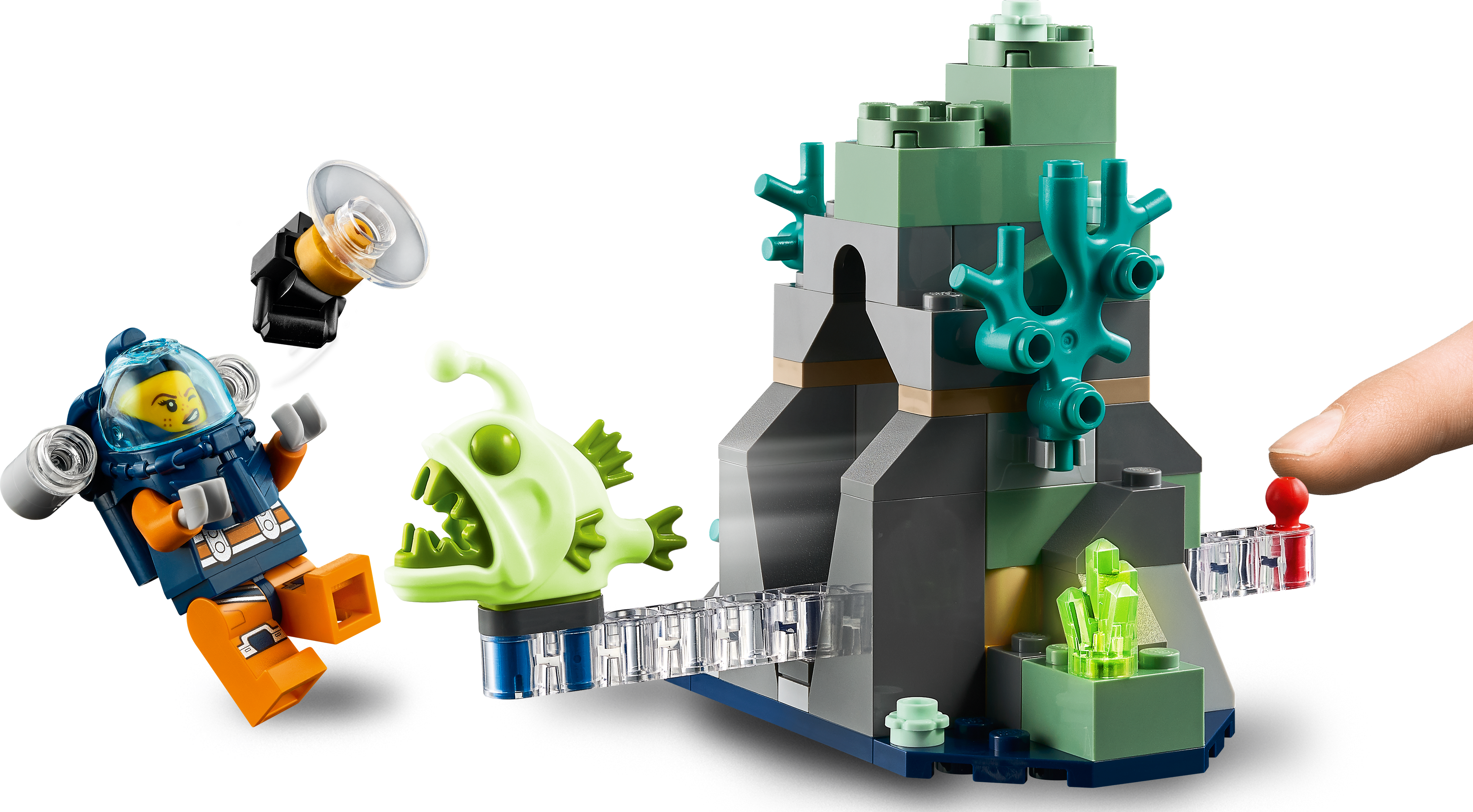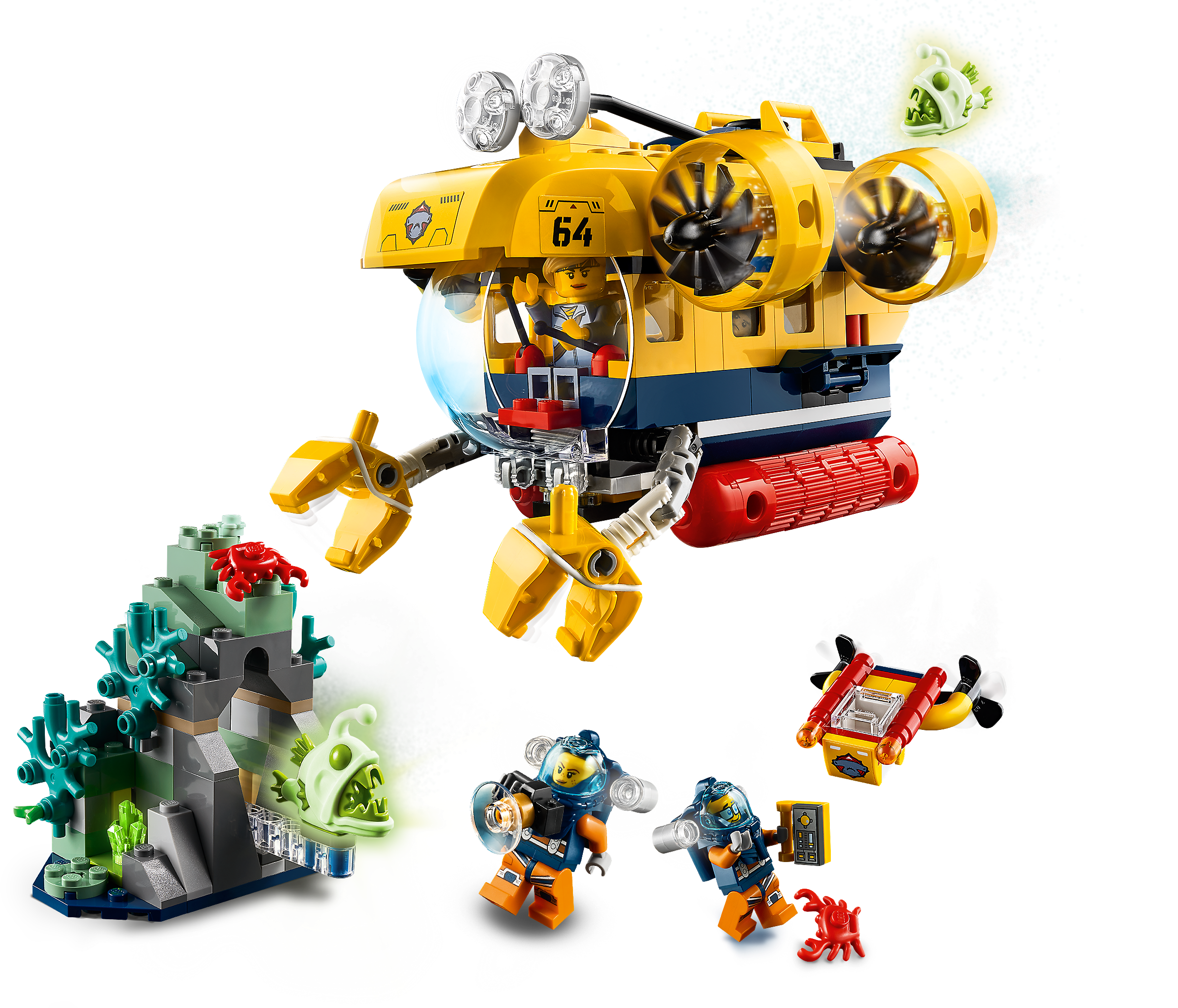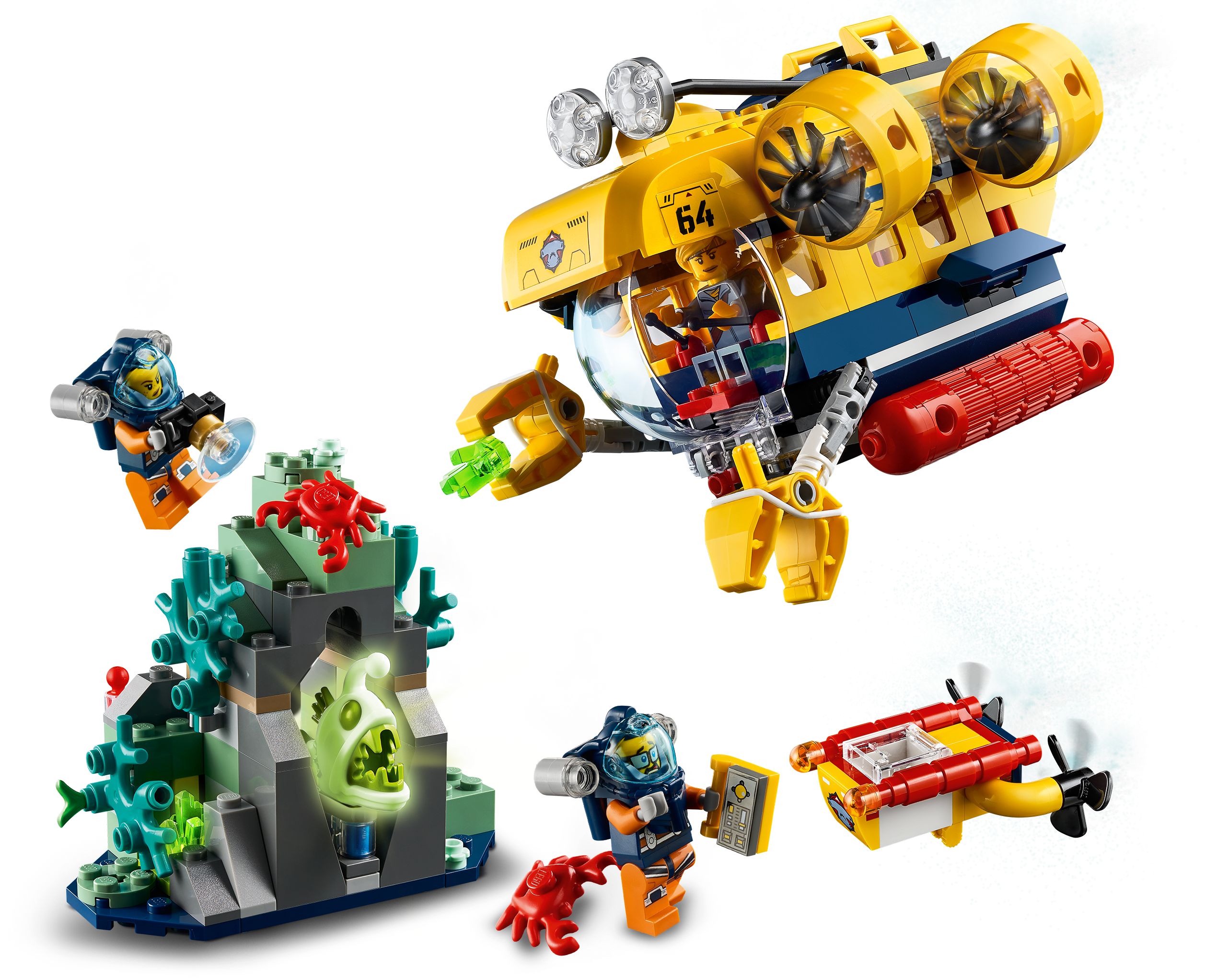 Kids can play out exciting sea exploration adventures with this LEGO City Ocean Exploration Submarine (60264) playset, featuring an awesome toy submarine, underwater drone and a seabed-cave setting. And with 4 explorer minifigures, including Jessica Sharpe from the popular LEGO City Adventures TV series, a glowing anglerfish and hidden treasure, the scene is set for endless fun and adventure!Great building set for kidsThis building set comes with simple building instructions and Instructions PLUS – part of the free LEGO Building Instructions app for smartphones and tablets. This interactive building guide, with amazing zoom and rotate viewing tools, quickly helps budding LEGO builders become master builders.Cool toys for kidsLEGO City is proud to support the work of National Geographic Explorers. Our Ocean playsets bring an exciting and open-ended world of undersea exploration and adventure, where kids get to enjoy lifelike role-play scenarios with realistic ocean vehicles, lifelike settings and fun characters.Here’s a great toy for boys and girls who love the ocean and its wildlife. This LEGO® City Ocean Exploration Submarine (60263) playset has all kids need for imaginative underwater adventures.What's in the box? A toy submarine, underwater drone and a coral-covered seabed setting, plus 4 minifigures, including LEGO® City TV's Jessica Sharpe and 2 divers with cool accessories, and a glowing anglerfish figure.Kids can combine the vehicles and characters included in this set with other original LEGO® toy playsets for even more creative play or to make awesome display pieces.This LEGO® City Ocean Exploration Submarine playset makes a great Christmas, birthday or any-other-day gift for kids aged 5 and up. Requires only very basic building skills.When built, the LEGO® Ocean Toy Exploration Submarine measures over 3" (9cm) high, 5" (14cm) long and 4" (11cm) wide, while the ROV sub measures in at over 2" (6cm) long and 1" (4cm) wide.No need for batteries – this exciting ocean exploration toy is powered by kids with big imaginations!This kids’ toy comes with an easy-to-follow printed building guide and Instructions PLUS – a digital construction guide for young builders. Available as part of the free LEGO® Building Instructions app for smart devices.LEGO® City is proud to support the groundbreaking work of National Geographic Explorers, who help build a better world for us all. LEGO City Ocean playsets introduce kids to the exciting world of underwater exploration.LEGO® City Ocean playsets are designed to the highest industry standards and criteria. This ensures that the LEGO bricks and pieces are consistent, compatible and connect and pull apart easily every time.All LEGO® City bricks and pieces are tested to the extreme to create toy building sets that meet the highest global safety and quality standards.
