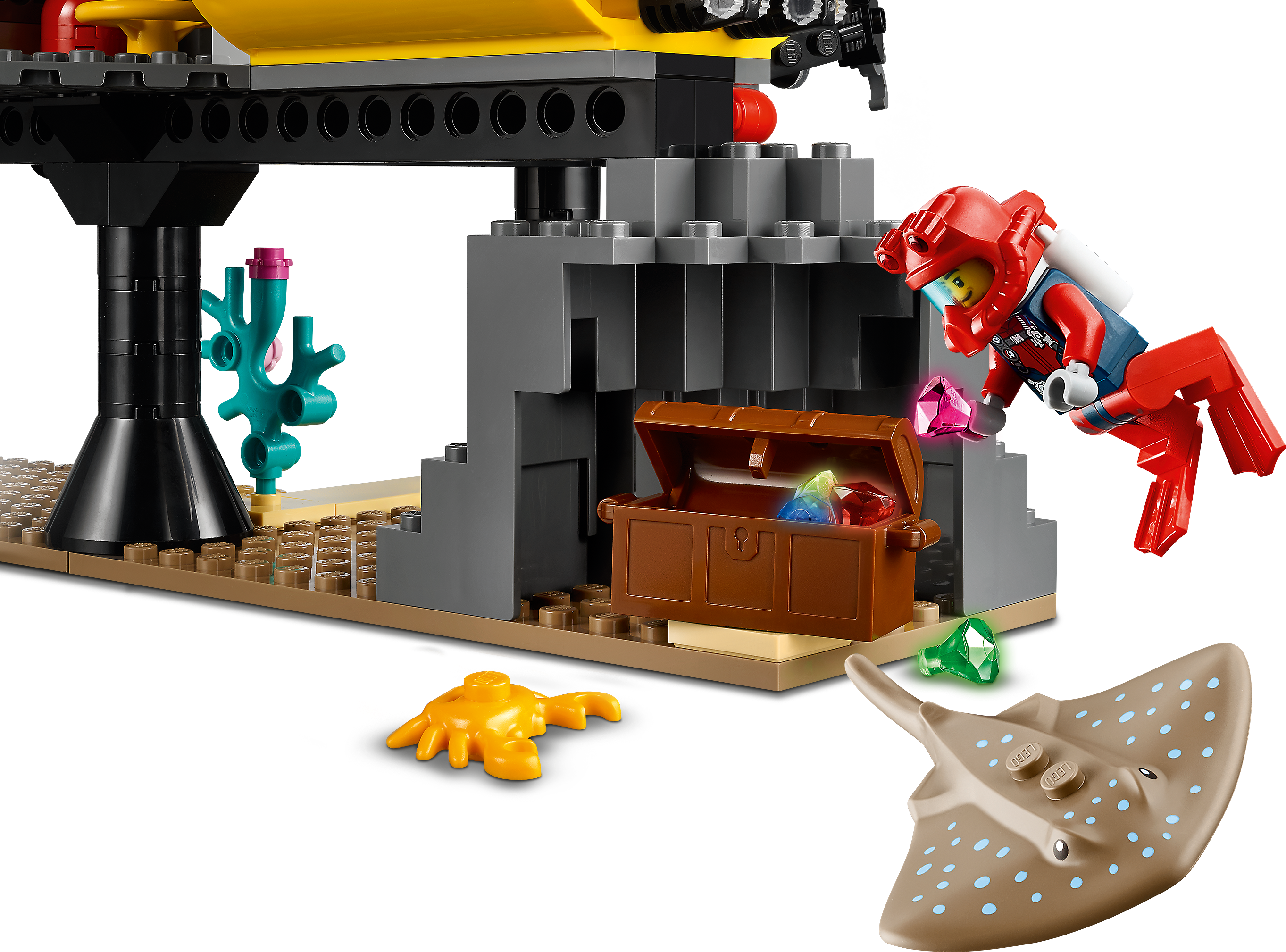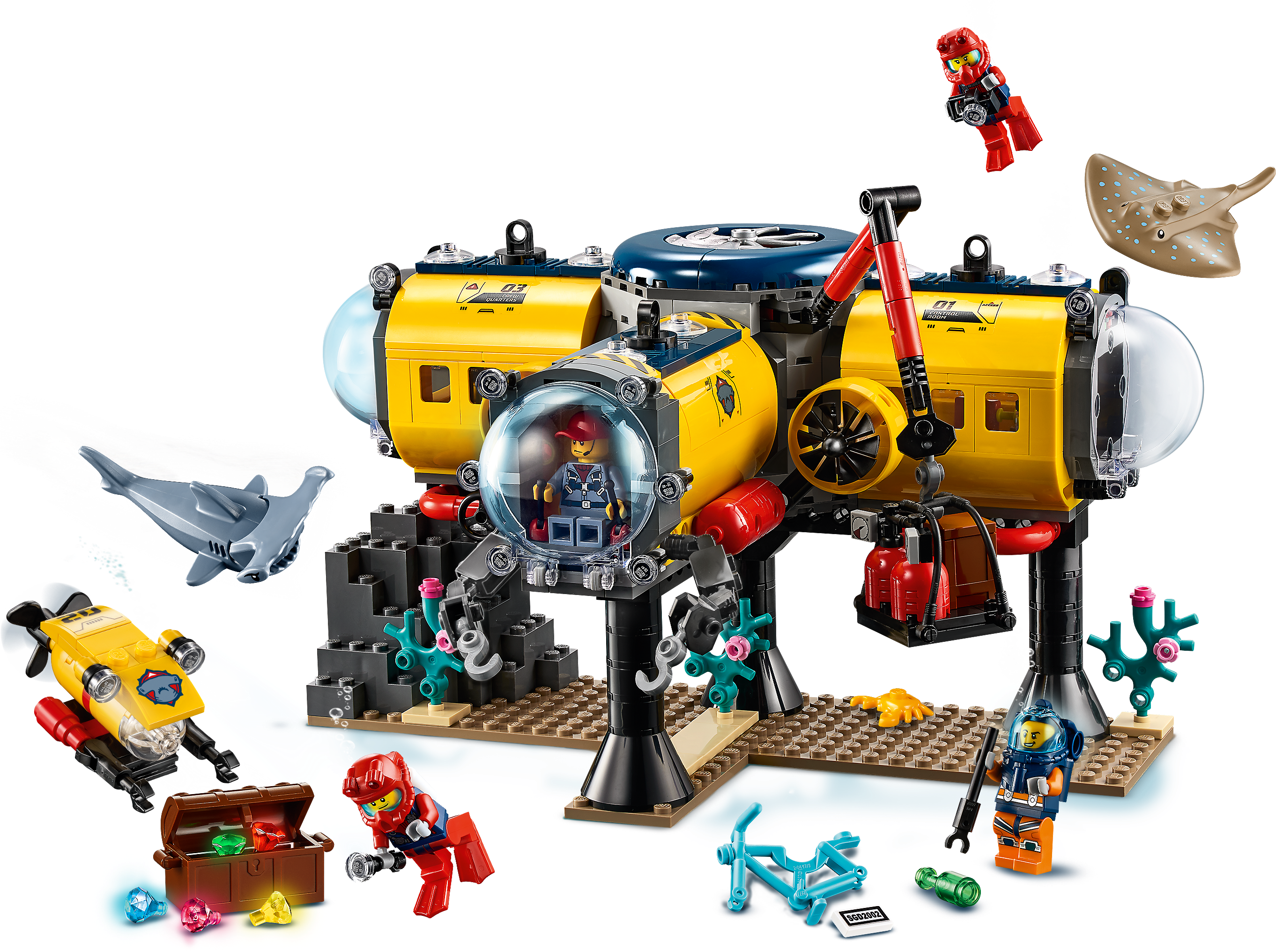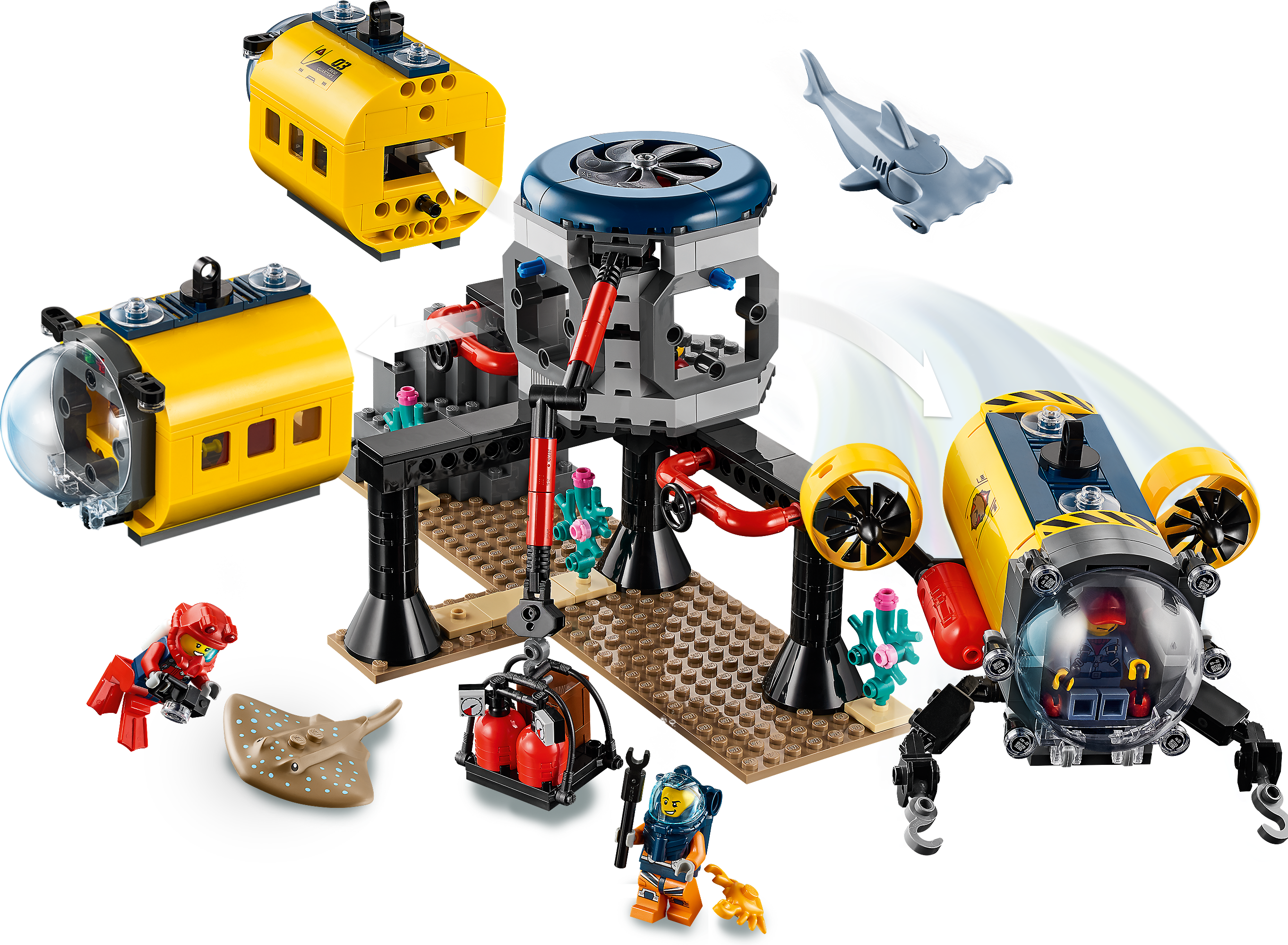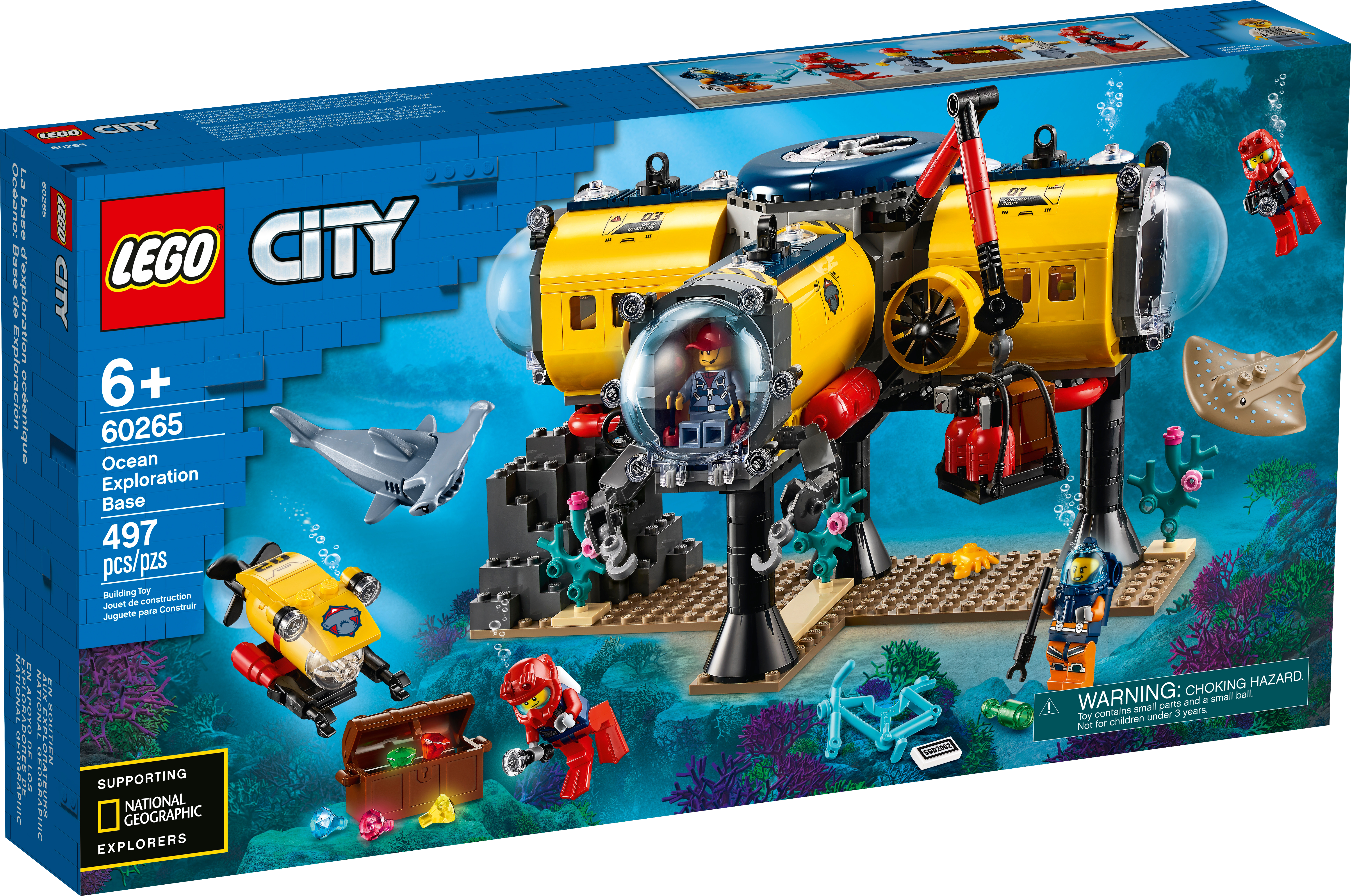 Kids who love the sea and its wildlife will love this LEGO® City Ocean Exploration Base (60265) playset. There’s lots of fun to be had exploring the coral-covered ocean or chilling out inside the base with its interchangeable living and research modules. And with a cool toy crane, docking submarine and underwater drone, plus shark and stingray figures and a 5 strong team of explorer minifigures, there's plenty of excitement for kids to discover!An immersive building experienceYou'll find easy to follow building instructions for this 5+ LEGO® City toy in the box. Or you hop online and download Instructions PLUS, part of the LEGO Building Instructions app for smartphones and tablets. This interactive building guide, with amazing zoom and rotate viewing tools, quickly turns budding LEGO builders into master builders!Cool exploration toy for kidsLEGO City is proud to support the work of National Geographic Explorers. And with feature-rich buildings, cool vehicles and fun characters our Ocean playsets inspire realistic play scenarios for budding explorers.Kids can dive deep into imaginative underwater adventures with this amazing LEGO® City (60265) Ocean Exploration Base playset. It has all kids need for a fun and rewarding play experience.What’s In the box? A toy ocean exploration base with interchangeable living and research modules, plus a docking submarine, underwater drone, 5 researcher minifigures and shark and stingray figures.The LEGO® City Ocean Exploration Base features interchangeable living and research modules and a docking submarine with movable inspection arms, spinning propeller and opening cockpit with room for two minifigures.Looking for cool toys for kids aged 5+? This playset makes a great Christmas, birthday or any-other-day present for LEGO® City fans and kids who love to role-play. Requires only very basic building skills.When built, the exploration base measures over 7” (20cm) high, 10” (27cm) wide and 5” (15cm) deep, while the underwater drone measures over 1" (3cm) high, 2" (6cm) long and 1" (3cm) wide.Does it need batteries? No, this construction set is powered by small kids with big imaginations – simply open the bags of LEGO® bricks and the play can start right away!This building set comes with a printed building guide and Instructions PLUS – an interactive construction guide for budding builders. Available as part of the free LEGO® Building Instructions app for smart devices.LEGO® City is proud to support the groundbreaking work of National Geographic Explorers, who help build a better world for us all. LEGO City Ocean playsets introduce kids to the exciting world of underwater exploration.Every LEGO® City Ocean playset is designed to the highest industry standards and criteria. This ensures that the LEGO bricks and pieces are consistent, compatible and connect and pull apart easily every time.LEGO® bricks and pieces are dropped, heated, crushed, twisted and analyzed to make sure every kid's building set meets the highest global safety and quality standards.