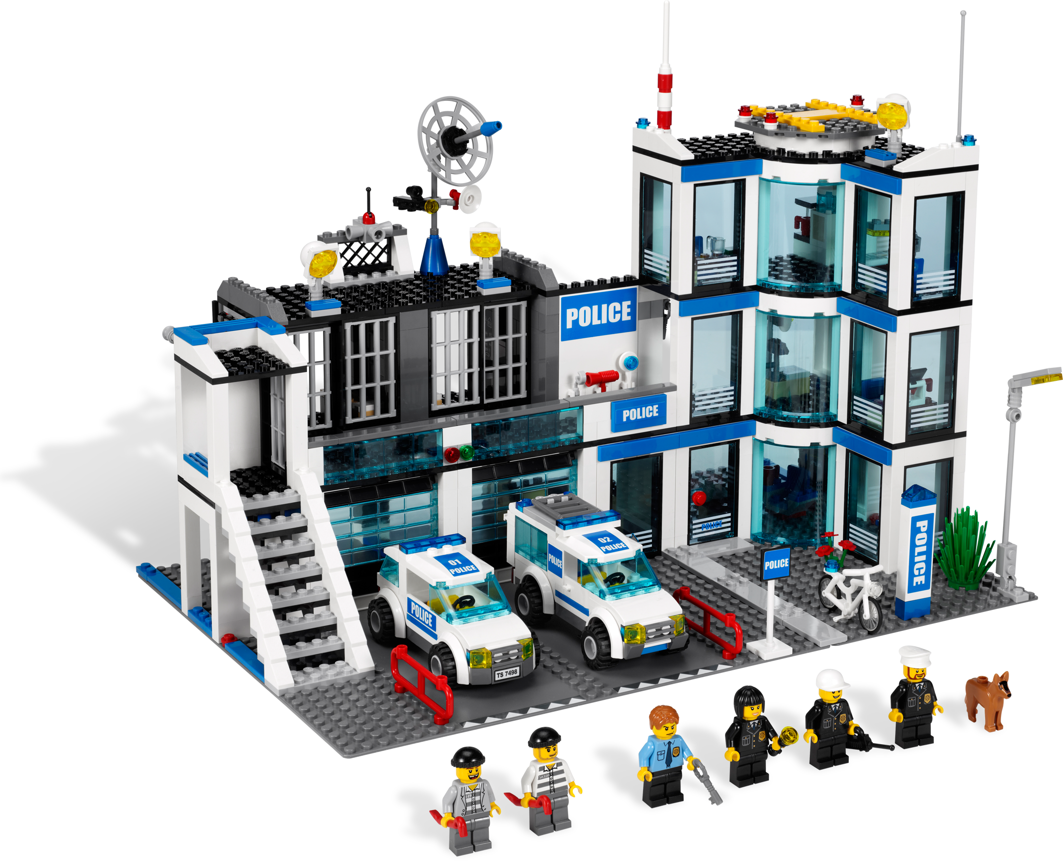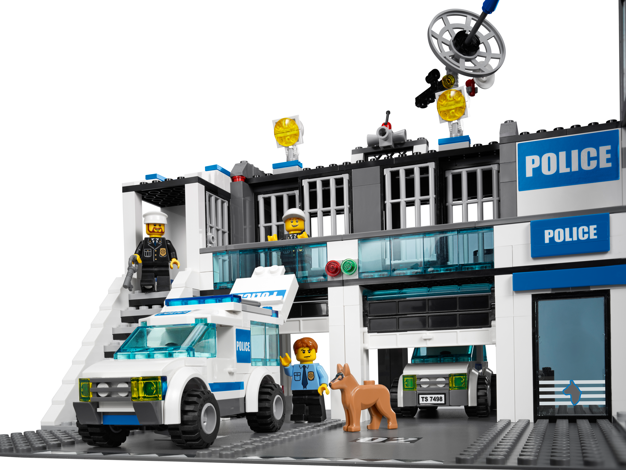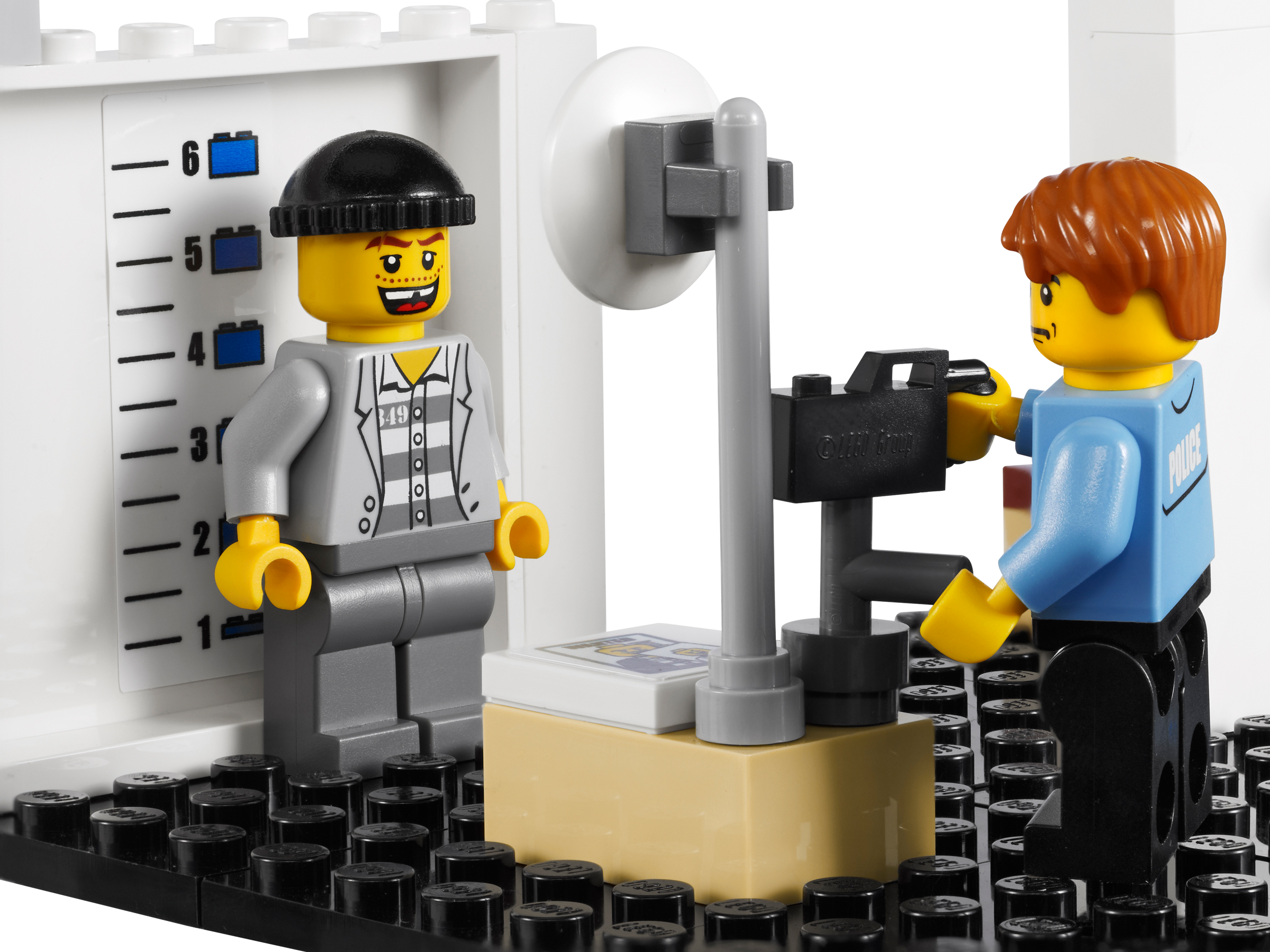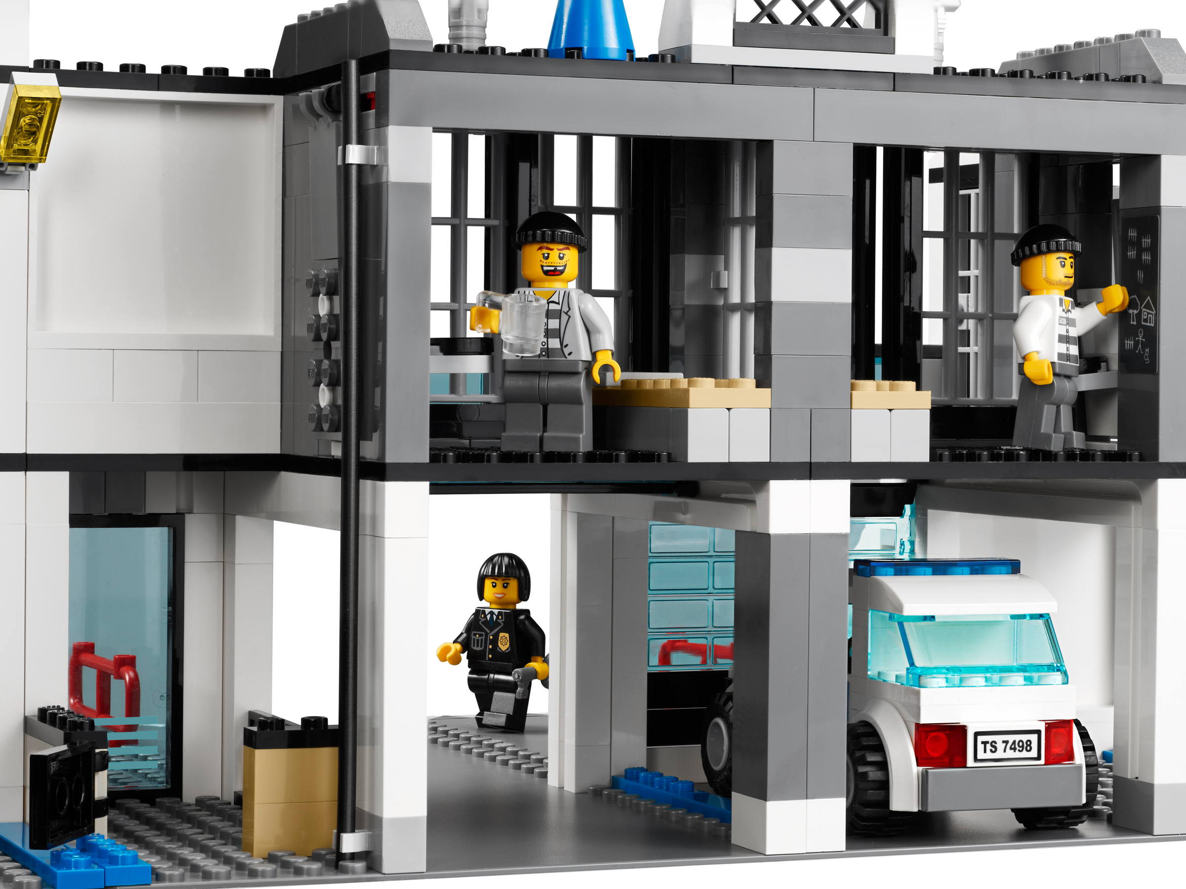 Crack down on crime in LEGO® City! Stop the prisoners from escaping the police station through the pipe drain! They won’t get far on foot! Use the police car to chase them back to prison in the police van. Lock criminals up in two jail cells! Pull police vehicles into the garage! Land a helicopter on the roof! Restore the law and order in LEGO® City with this feature-packed set including evidence room, mug shot area and secret compartment. Includes 6 minifigures: 4 police officers, 2 robbers and police dog Features 3 vehicles: police car, prisoner transport van and bicycle Accessories include handcuffs, crowbar and “wanted” poster Features include dog kennel, evidence room, mug shot area and secret compartment Recover stolen goods to put in the evidence room! Escape through the drainpipe! Pull vehicles into the garage! Police Station measures 10” (25cm) tall and 15” (38cm) wide.
