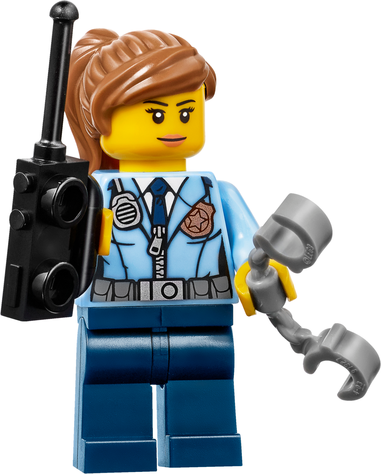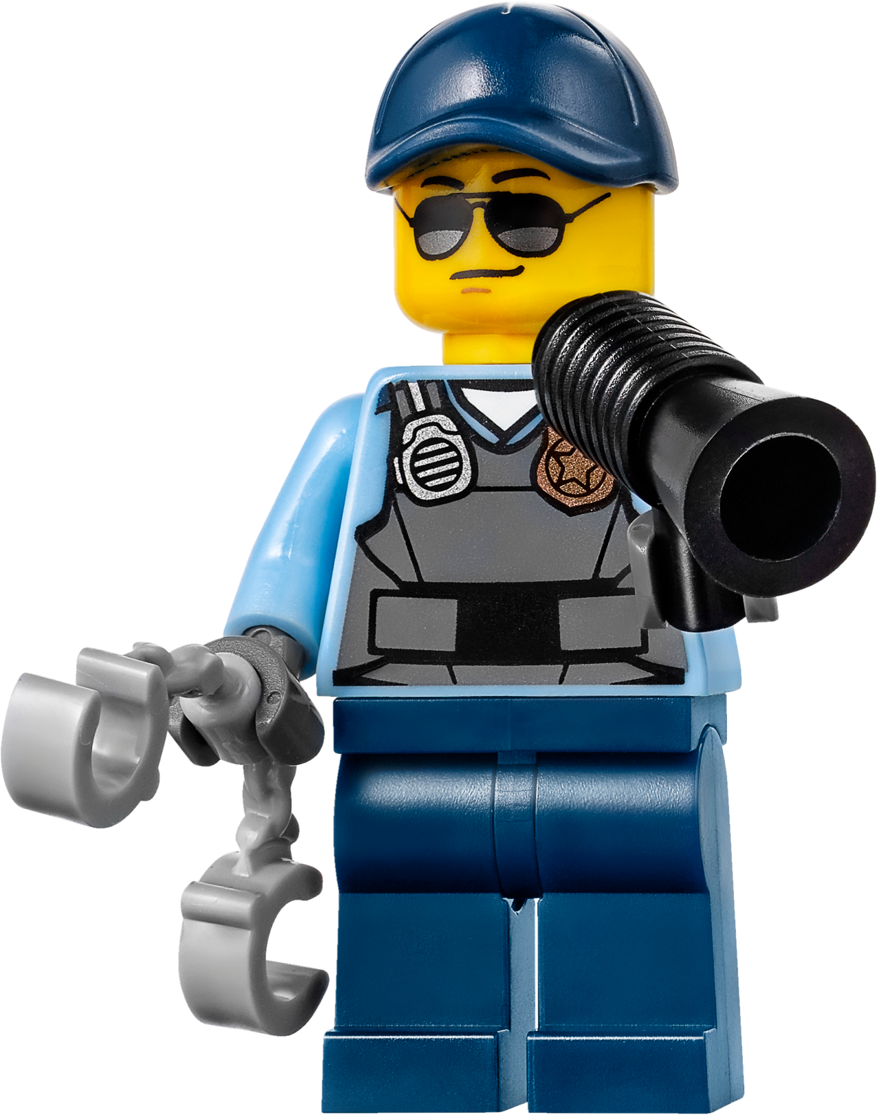 Accessory elements include handcuffs, 2 walkie-talkies, crowbar, nightstick, money bill, ball and chain, and a megaphone.