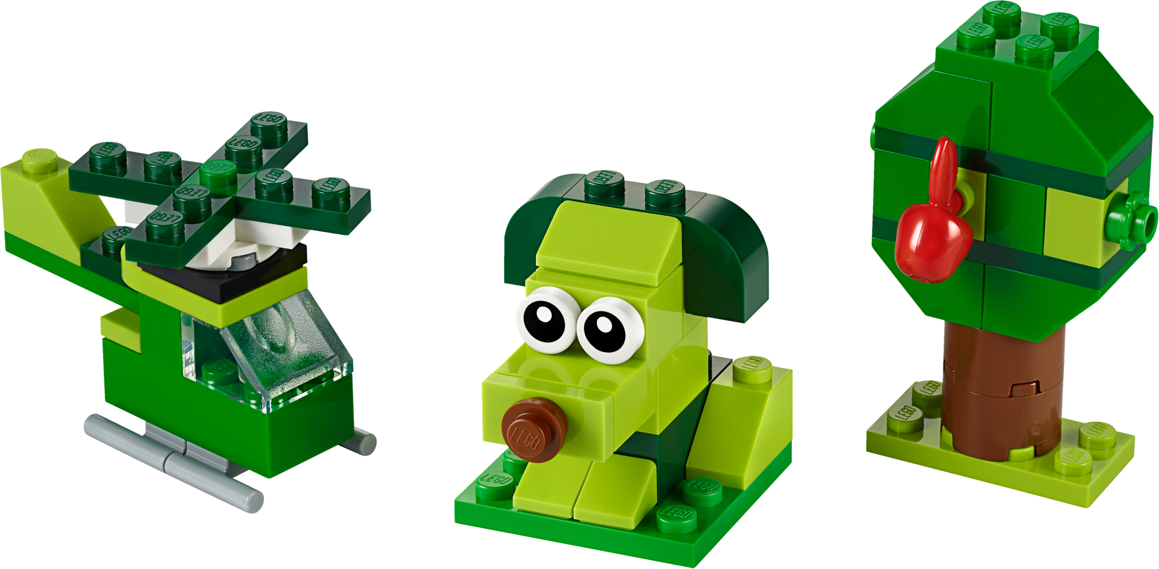 The 60 LEGO® bricks and pieces build into 3 models – a green dog, a mini helicopter and an apple tree. Cool features and endless customized creations ensure the imaginative play never stops.