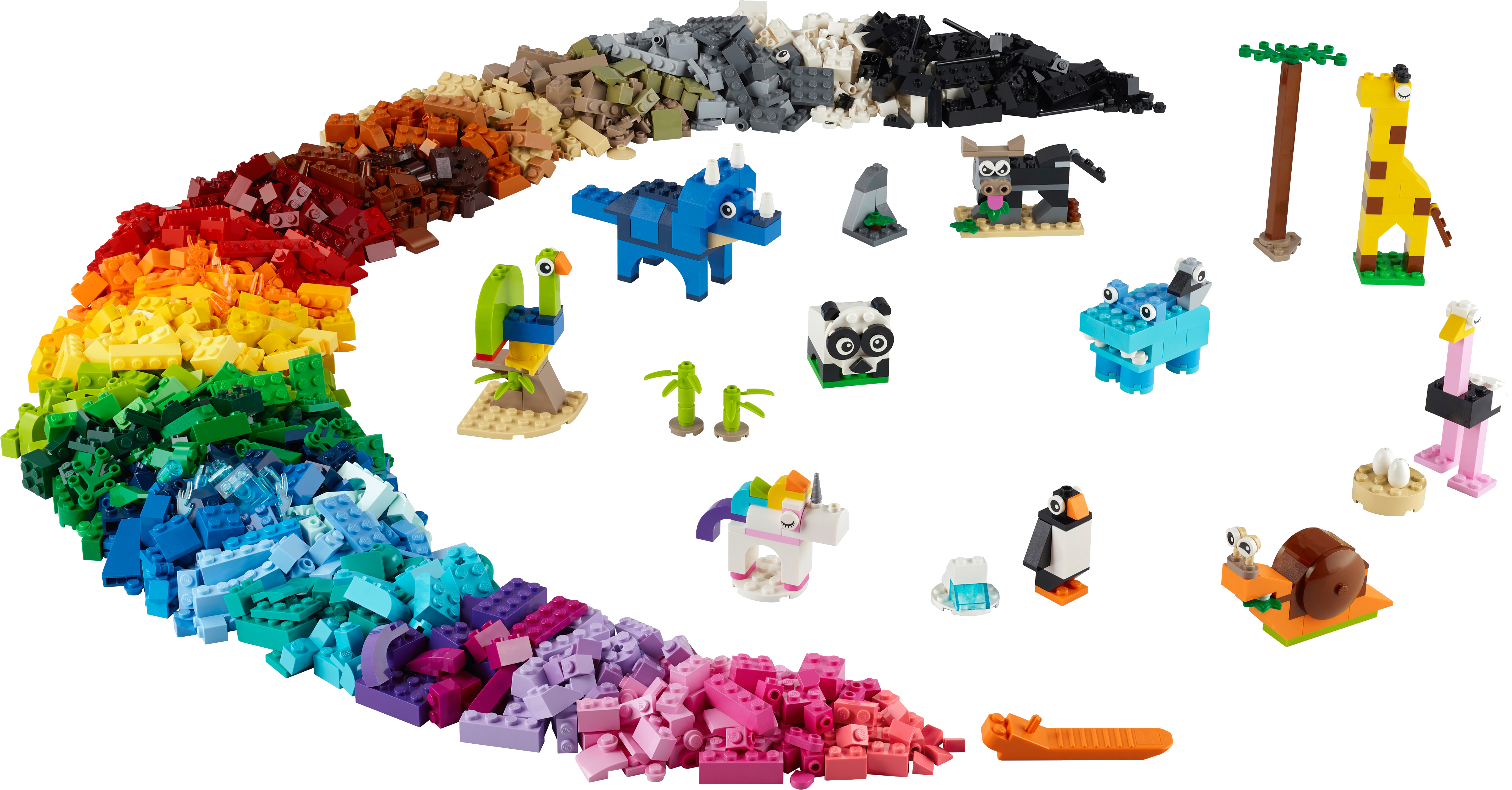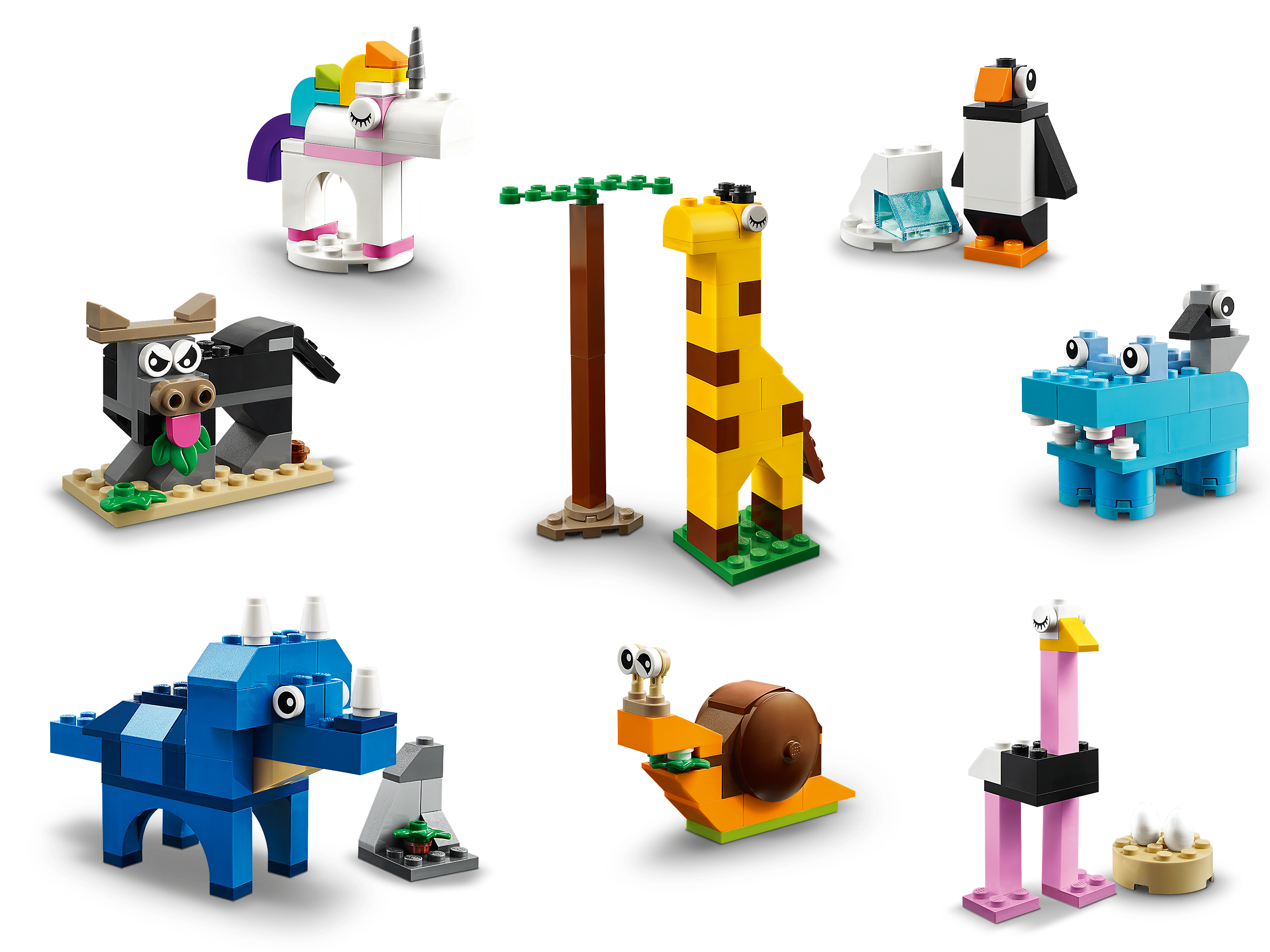 Young animal lovers will enjoy endless imaginative play with this animal building set. The 10 amazing animals can be built at the same time, each in its own setting. And, while kids are busy building and playing, they’re also developing key skills.Kids' brick-built animals for LEGO® beginners!Youngsters will go wild for these easy-to-build LEGO animals. The 10 easy-to-build toys include a peacock with stand, bull, penguin with ice, dinosaur with rocks, unicorn, ostrich with nest, snail, hippo with a bird on its back, panda bear with bamboo trees and a giraffe with a tree. As kids build and rearrange the figures and accessories, they discover the joy of construction and immerse themselves in imaginative role-play.Inspire creative skills with LEGO Classic building toysLEGO Classic sets put creative construction and imaginative play into kids' hands. Once the simple guides and fun models get them building, they'll never want to stop!Kids build 10 fun, familiar animals, then get creative using the kit for imaginative, open-ended play. Add to this the unlimited possibilities free-building bring and… anything is possible!This creative toy builds into a peacock, bull, penguin, dinosaur, unicorn, ostrich, snail, hippo, panda, giraffe… and absolutely anything kids can imagine! With 1,500 awesome bricks, the animals are just the beginning!Youngsters enjoy building and playing with their models, and developing their own creations. Kids can also expand the fun by combining the bricks and pieces with other LEGO® toys.Boys and girls aged 4 and over will love this animal building kit. Versatile, fun and educational, this LEGO® toy makes an ideal Christmas holiday, birthday or any-other-day gift for any animal-loving child.With 1,500 LEGO® bricks for kids to get creative with, there's no need to be restricted to building animals as they develop their construction skills – the possibilities are endless!This animal playset is battery free, so the fun never stops! All that’s needed is a child’s imagination to fuel the creative fun. Hands-on building toys like this encourage a wide range of developmental benefits.Simple, clear instructions for each animal ensure kids get building the LEGO® models as soon as the set is opened. The more they play, the more their imaginations conjure up exciting new possibilities.Develop kids' creative-thinking and fine motor skills with the mad mix of bricks, pieces, ideas and inspiration that you’ll find inside every LEGO® Classic set. Great open-ended play for LEGO beginners!LEGO® toys meet the highest industry standards, so they are consistent, compatible and connect and pull apart easily – and it’s been that way since 1958.As well as meeting the highest global safety and quality standards, The LEGO Group drops, squashes, twists, heats, bends, scratches and stretches LEGO® bricks and pieces so you can be sure the toy is safe for your child.