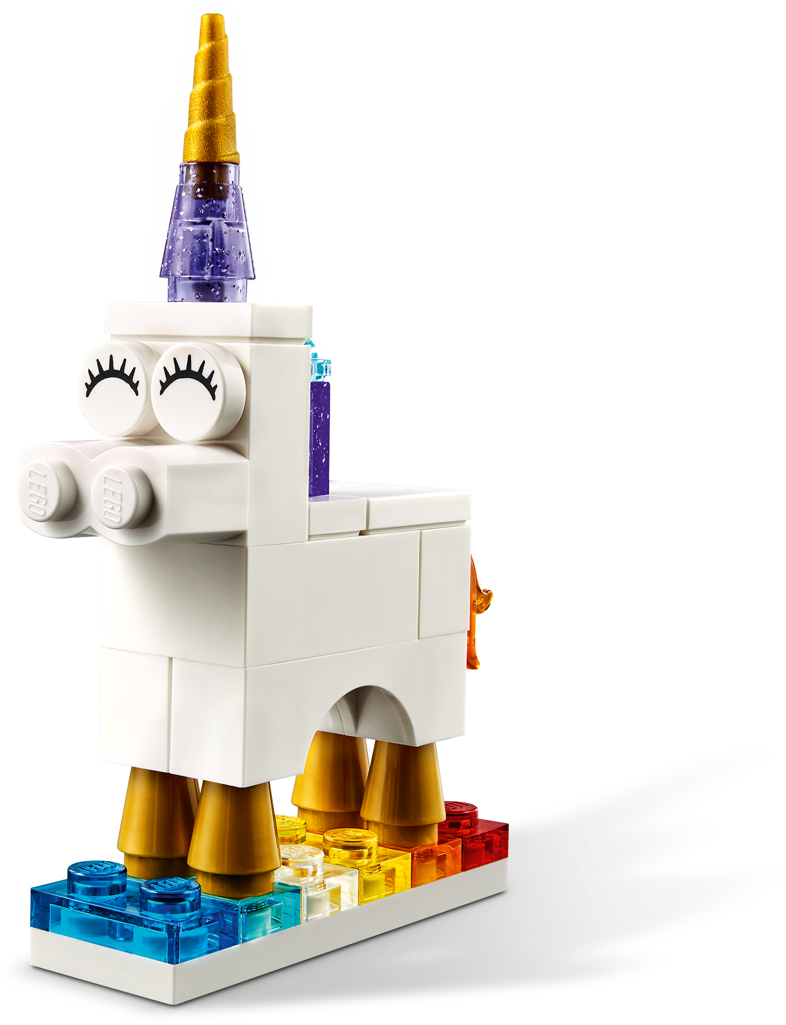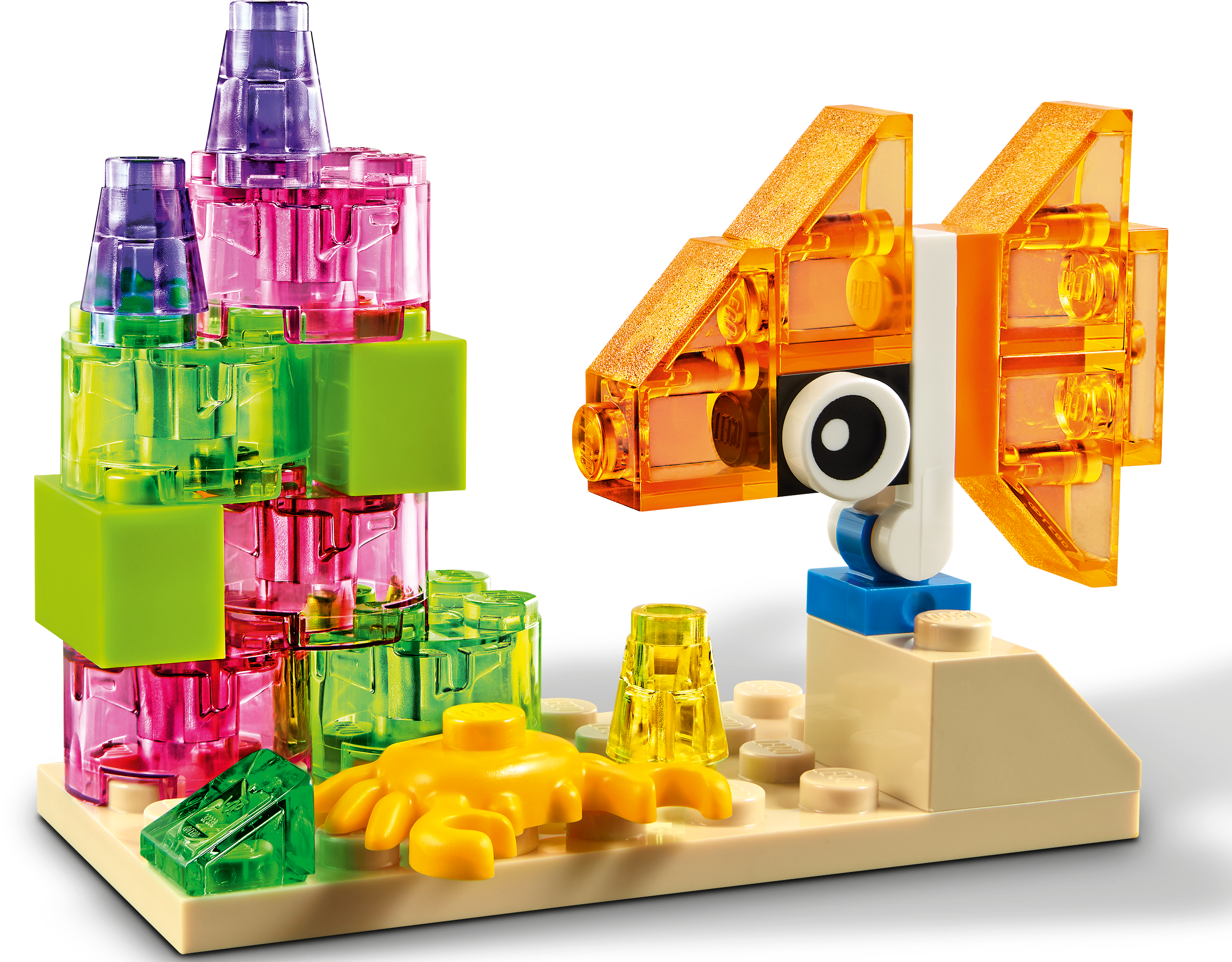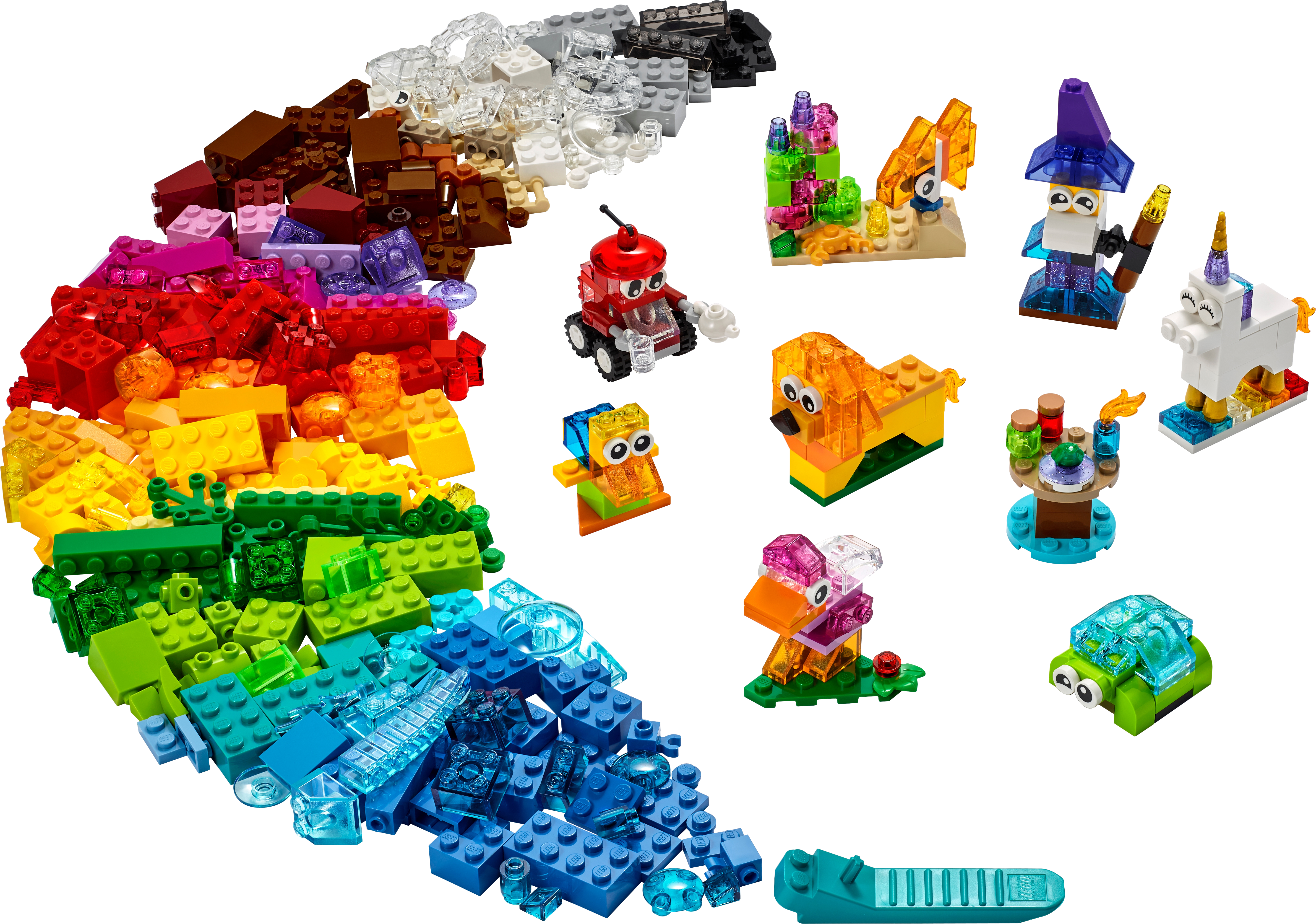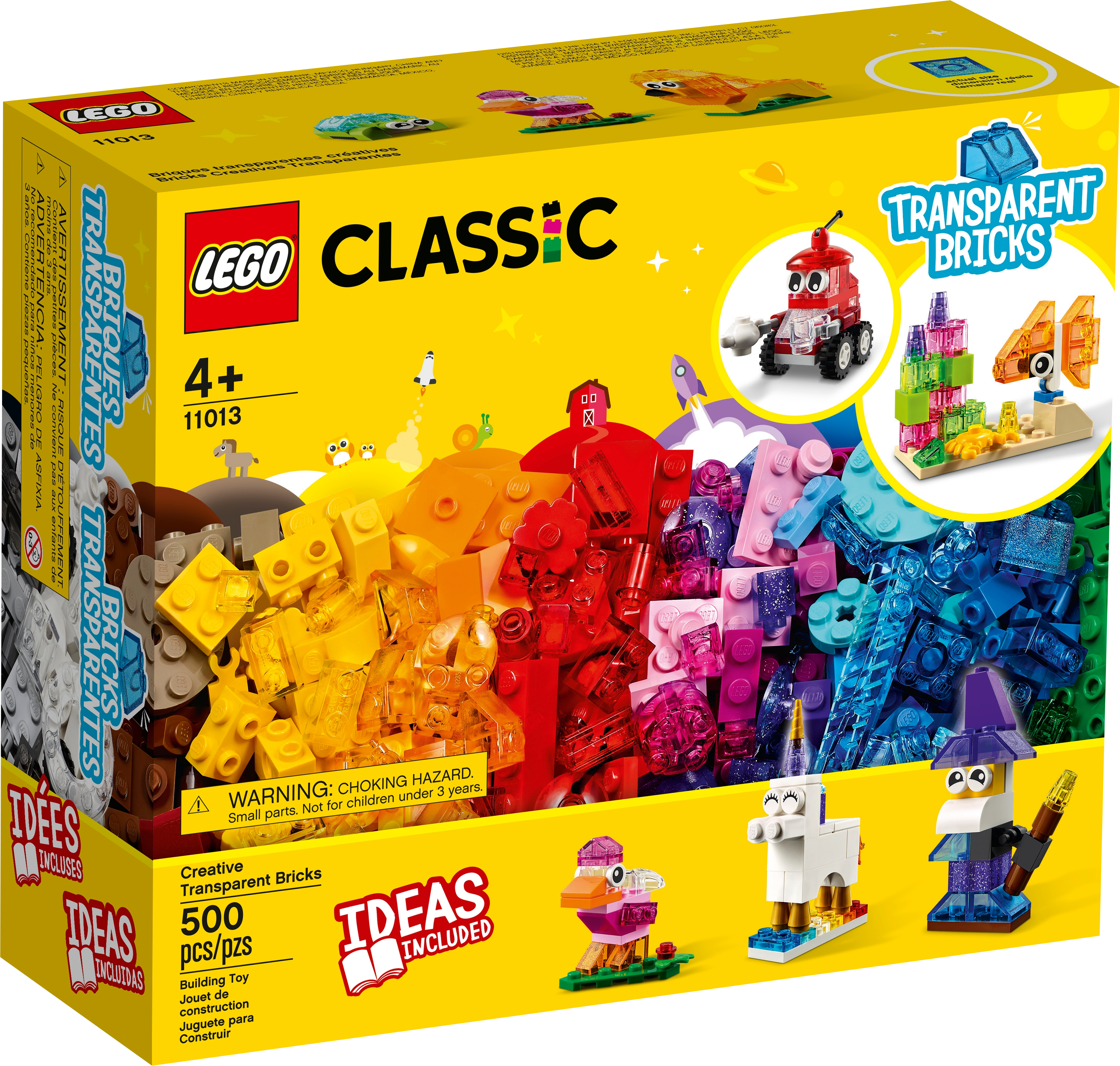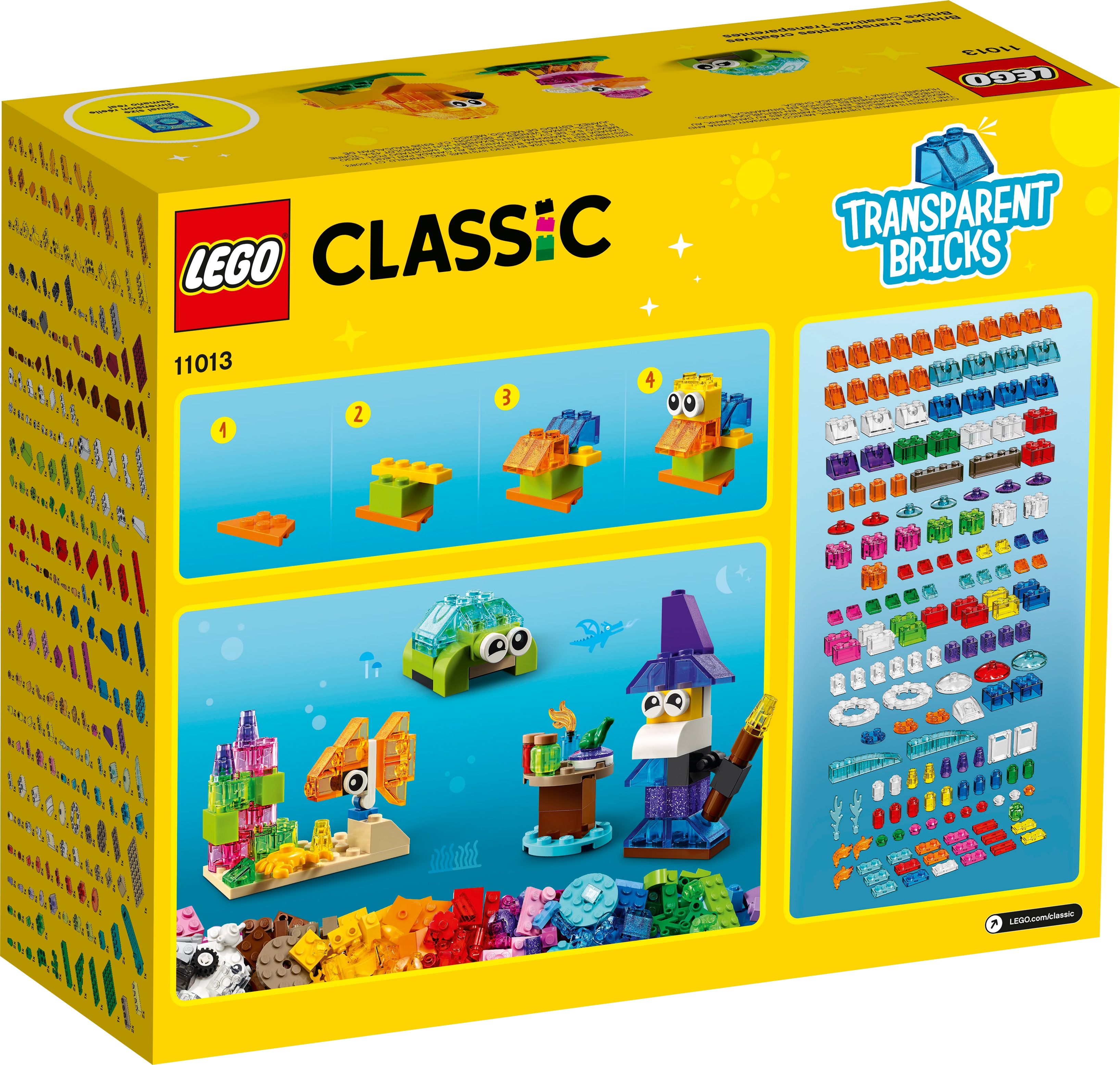The LEGO® Classic Creative Transparent Bricks (11013) building set features a dazzling array of transparent LEGO pieces in all kinds of colors, shapes and sizes, plus an exciting selection of classic LEGO bricks, pieces, eyes and wheels. Everything kids need for endless hours of creative play.A perfect playset for little builders aged 4 and upThis high-quality playset comes with 8 inspiring building ideas. There's a toy bird, lion, turtle, robot, unicorn, pink bird, wizard with a potions desk and a fish with a coral setting. And because every model comes with a simple building guide and digital building instructions, even first-time builders get to experience the pride and joy of constructing their own LEGO toys.Helps kids develop key life skillsLEGO Classic building sets inspire boys and girls to imagine and create. Children can join with friends and family, developing creative and physical skills as they build and play. Learning has never been so much fun!Kick-start kids’ creativity with this inspiring 500-piece playset, featuring a dazzling array of transparent LEGO® pieces, plus classic LEGO bricks, eyes and wheels for creating 8 fun models and more.What’s in the box? All kids need to build a toy bird, lion, turtle, robot, unicorn, pink bird, wizard with potions desk and a fish in a coral setting, plus extra LEGO® bricks for more creative fun!Building and playing with the 8 toys included with the LEGO® Classic Creative Transparent Bricks (11013) playset is just the beginning. There’s a whole universe of creative fun for kids to explore.Makes an impressive Christmas, birthday or any-other-day gift for new LEGO® builders, as well as boys and girls who wish to add a sparkle to their LEGO brick collection.Kids can get creative with 500 LEGO® bricks, including a wide selection of transparent pieces. This playset also combines with other original LEGO sets for even more build and play fun.Inside the box you'll discover separate brick bags, each containing the LEGO® pieces required to complete 2 builds. Simply make your choice, open the brick bag and let the fun begin!Comes with printed building instructions and Instructions PLUS – part of the free LEGO® Building Instructions app, with zoom, rotate and visualization tools to bring the construction process to lifeLEGO® Classic construction sets inspire open-ended creative play. Boosting kids' creative-thinking and problem-solving skills has never been so much fun!LEGO® bricks and pieces are produced under stringent quality standards to ensure they are consistent, compatible and fun to build with.All LEGO® playsets are thoroughly tested to ensure they meet strict safety standards.