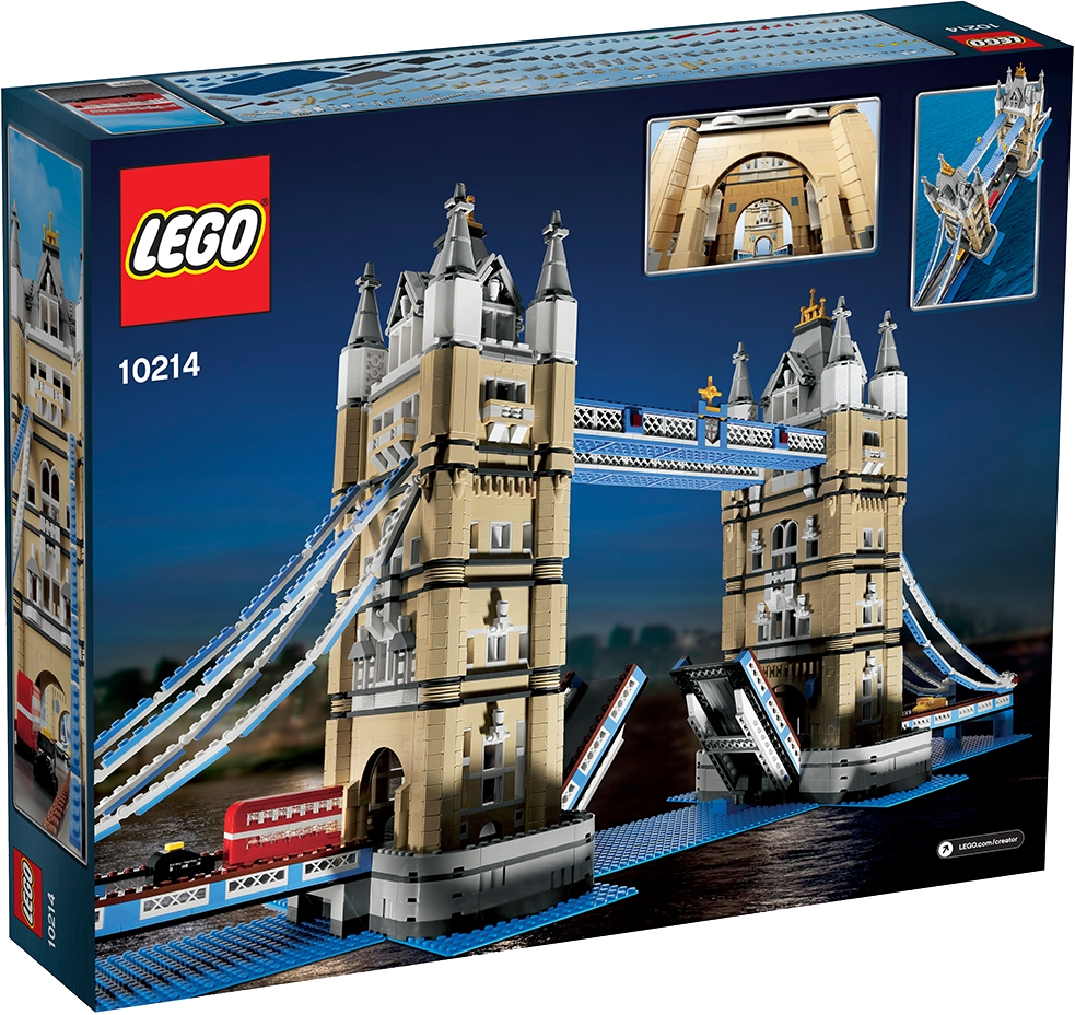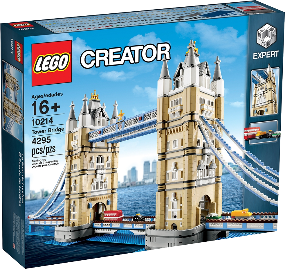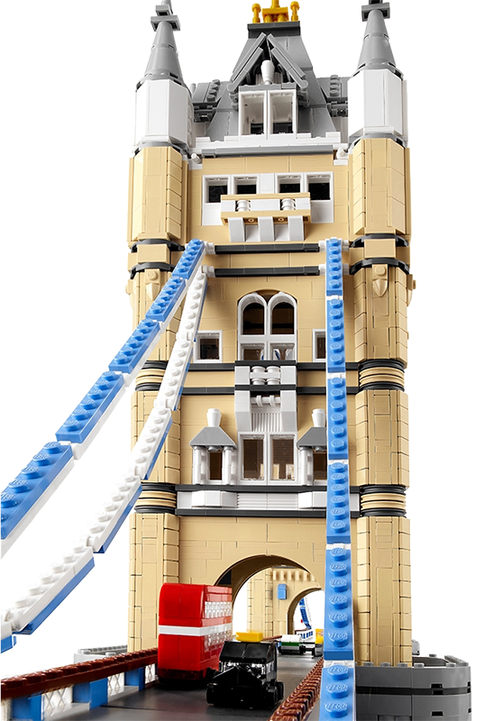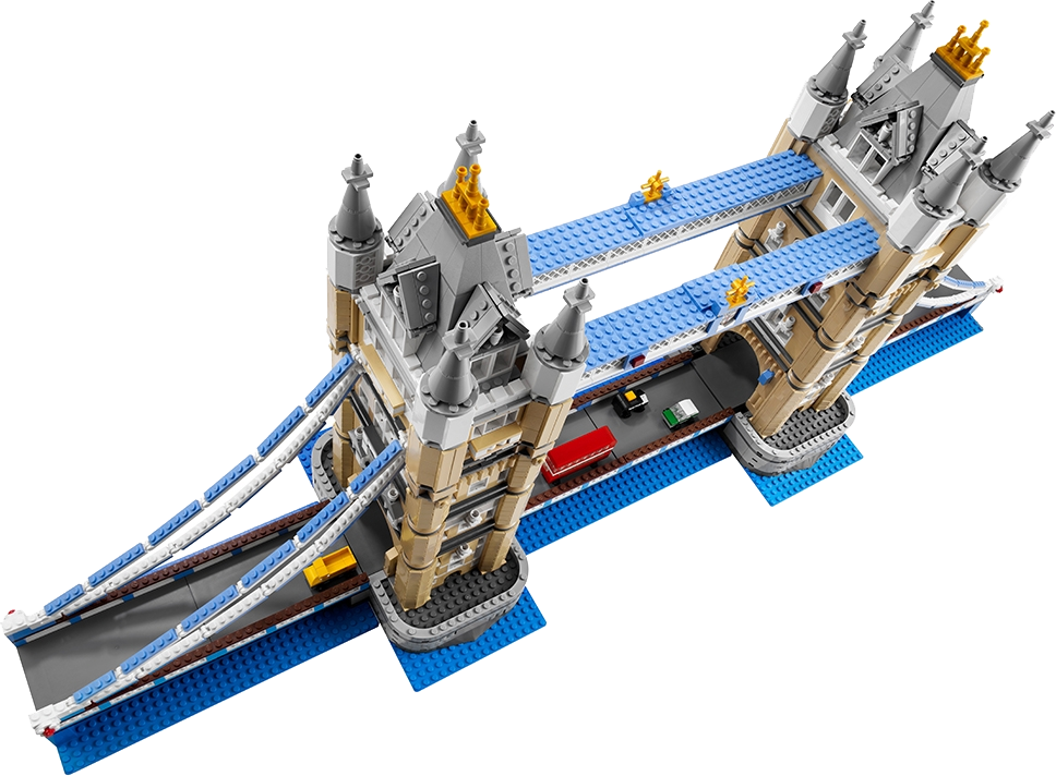 Build London's famous Tower Bridge! Stretching over the River Thames since 1894, the famous Tower Bridge of London, England is one of the most recognizable landmarks in the world. Now you can add this timeless classic to your LEGO world buildings collection! Designed with advanced building techniques and rare colors and elements, the Tower Bridge is complete with its iconic paired towers and a drawbridge that really opens. Fun to build and display, it locks together solidly but can be taken apart in sections for easy transport. Includes 4 miniature vehicles; a black London taxi, a traditional red double-decker bus, a yellow truck and a green automobile. Completed model measures 40" (102 cm) long, 17" (45 cm) high and 10" (26 cm) wide.Includes 4 miniature vehicles: a black London taxi, a yellow truck, green automobile and even a traditional red double-decker bus!Features the iconic paired towers and a drawbridge that really opens and closes!Includes unique printed shield!Features hundreds of 1x1 slopes in tan!Many useful arches, angular bricks in tan!Includes 4 blue base plates and over 80 windows!Tower Bridge is ideal for building and display - it can be taken apart in sections for easy transport!Add this amazing landmark to your LEGO world buildings collection!Completed model measures an impressive 40" (102 cm) long, 17" (45 cm) high and 10" (26 cm) wide.