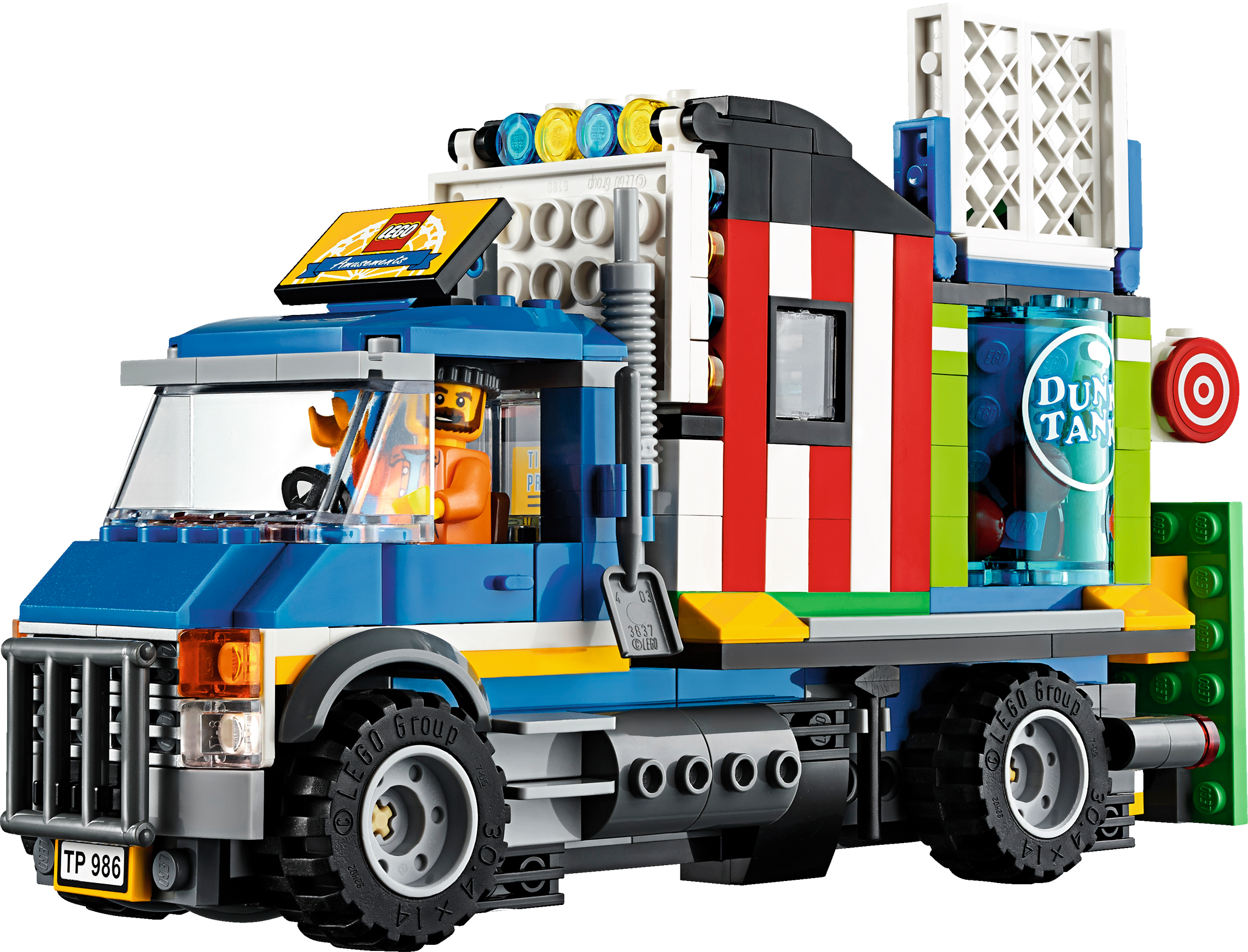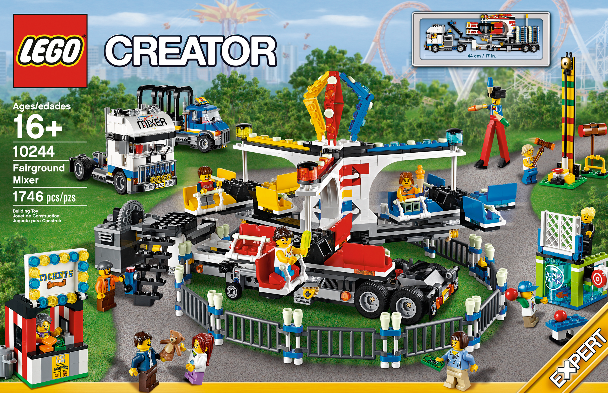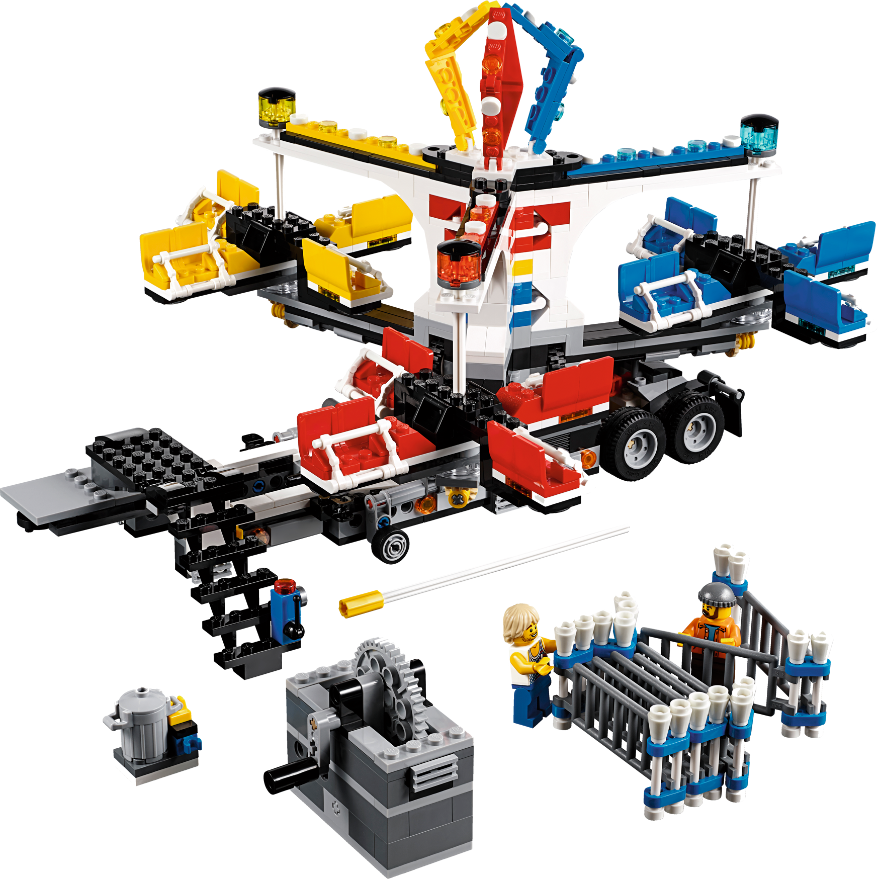 Climb aboard the LEGO® Fairground Mixer and hold onto your hat! Unfold the awesome Fairground Mixer, turn the crank and see it come to life! The fair has come to town and children and adults alike can’t wait to try the rides. Buy your ticket from the ticket booth and climb aboard the Mixer. Then try reaching the golden bell on the high striker or hit the target to plunge the dunk tank lady into the water. As evening falls, the swirling Mixer ride glows in the darkness, before being folded down onto its own trailer for transportation to the next town. This magical fairground is packed with wonderful details that will capture everyone’s imagination. Includes 12 minifigures: a juggling man on stilts, dunk tank lady, strong man challenger, ticket lady, truck driver/ride operator, 2 women, 2 girls, 2 boys and a queasy man who tried the mixer one too many times.
