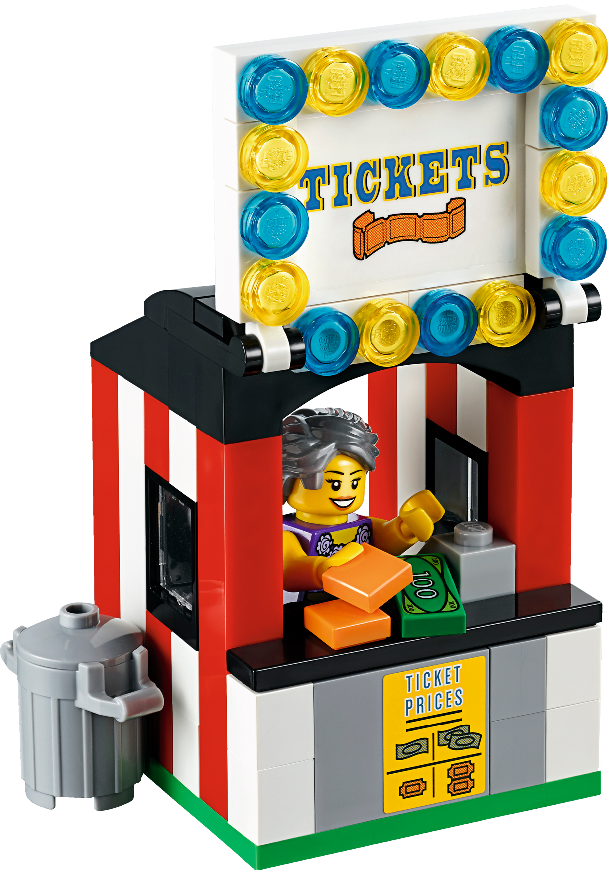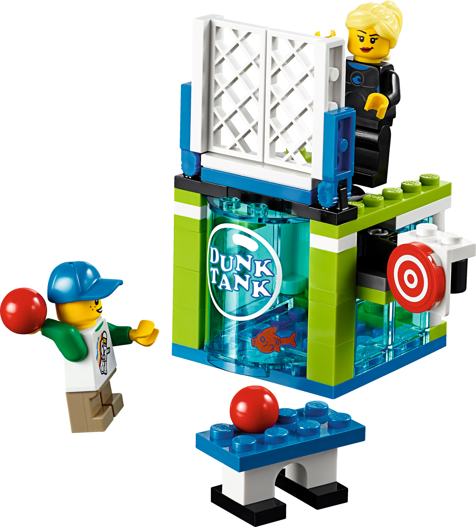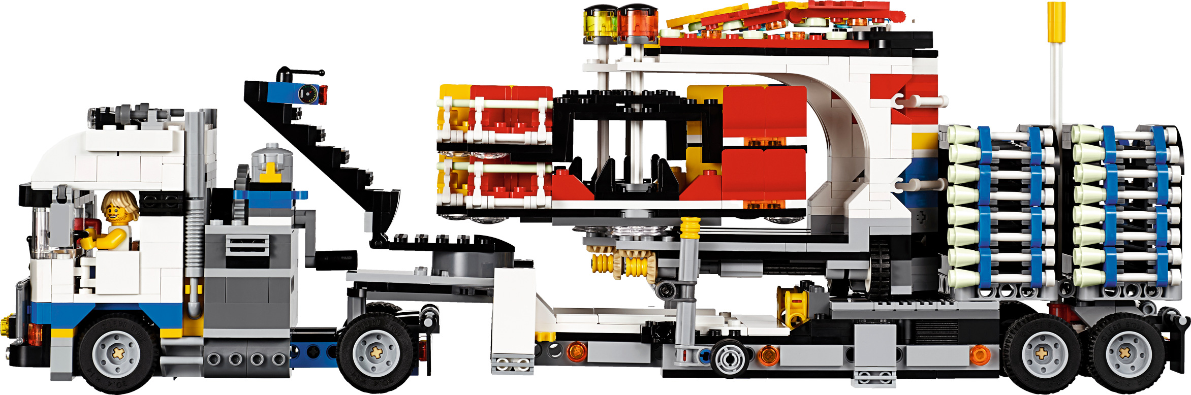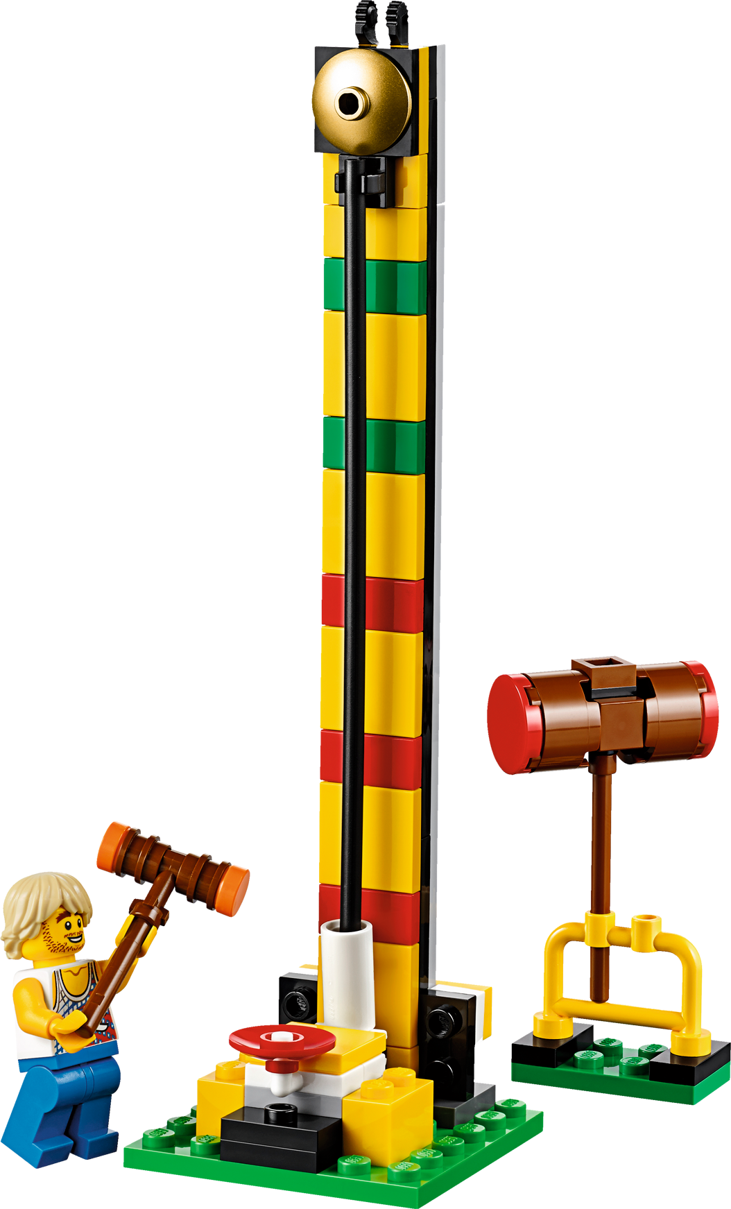 Climb aboard the LEGO® Fairground Mixer and hold onto your hat! Unfold the awesome Fairground Mixer, turn the crank and see it come to life! The fair has come to town and children and adults alike can’t wait to try the rides. Buy your ticket from the ticket booth and climb aboard the Mixer. Then try reaching the golden bell on the high striker or hit the target to plunge the dunk tank lady into the water. As evening falls, the swirling Mixer ride glows in the darkness, before being folded down onto its own trailer for transportation to the next town. This magical fairground is packed with wonderful details that will capture everyone’s imagination. Includes 12 minifigures: a juggling man on stilts, dunk tank lady, strong man challenger, ticket lady, truck driver/ride operator, 2 women, 2 girls, 2 boys and a queasy man who tried the mixer one too many times.