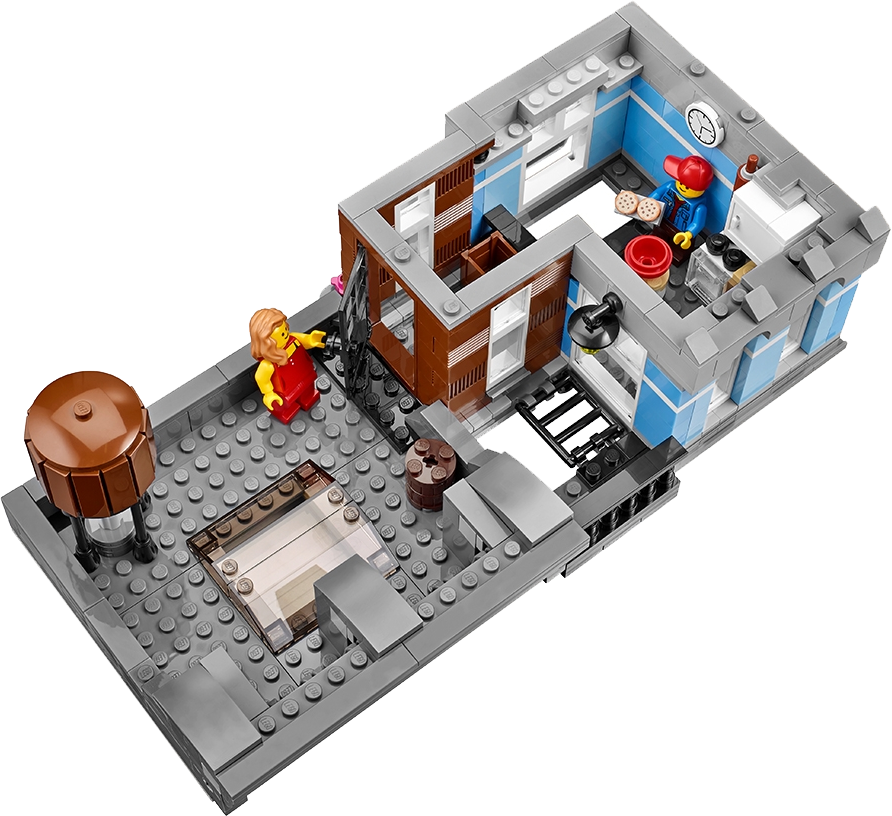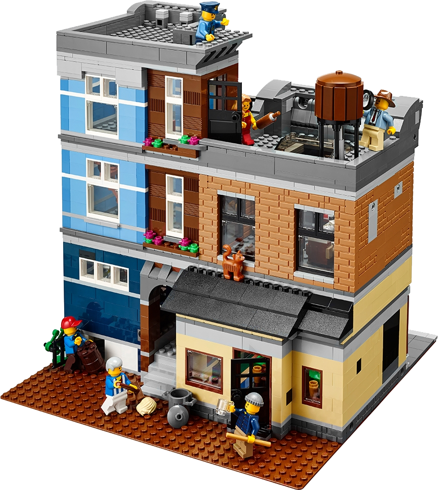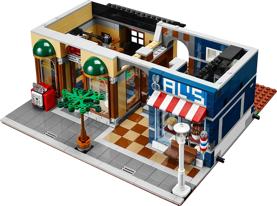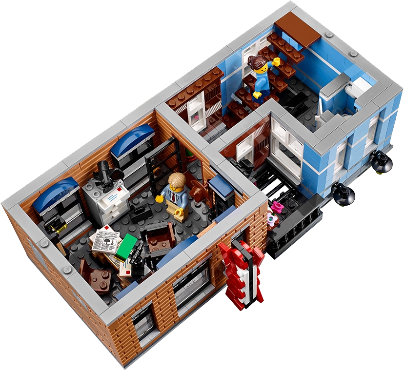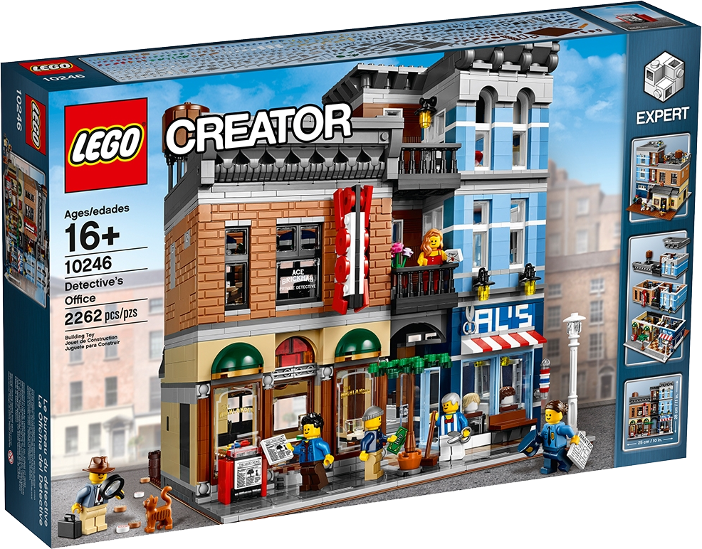 Discover hidden clues and surprises at the Detective’s Office! Discover a world of mystery and adventure with the LEGO® Creator Expert Detective’s Office! Step through the open archway and into the barbershop, where seated customers are pampered in the reflection of a large wall mirror, while next door, competitors play pool and darts beneath the comforting whir of a rotating ceiling fan. Venture to the first floor and you’ll find the detective’s office, his desk strewn with clues, a safe containing valuable evidence and a concealed wall compartment. Then visit the adjacent bathroom, featuring a classic pull-chain toilet, before taking the stairway to the well-equipped kitchen, from where you can access the roof terrace, complete with large water tower. This latest addition to the LEGO Modular Building series is packed with unsurpassed detail and hidden surprises. Easy-to-remove roof and ceilings provide access to the delightful interior, while the exterior of the building features a decorative roofline and a beautifully designed façade. Can you solve the smuggling mystery? Includes 6 minifigures with assorted accessories: Detective Ace Brickman, Al the barber, dart player, pool player, police woman and a mysterious lady in red. Includes 6 minifigures with assorted accessories: Detective Ace Brickman, Al the barber, dart player, pool player, police woman and a mysterious lady in red Features a pool hall, barbershop, detective’s office, bathroom, kitchen, water tower and a cat Detective’s office features a desk, assorted clues, brick-built lamp, filing cabinet, fan, safe, painting, concealed wall compartment, newspaper, menu, wanted poster and a wall lamp Pool hall features a hinged, rotatable ceiling fan, pool table, printed dartboard, pool cues, pool balls and a drinking glass Barbershop features never-before-seen scissors and reflective mirror element, 2 wall lamps, barber’s chair, hinged cabinet, 2 mannequin heads and a broom Bathroom features a detailed pull-chain toilet Kitchen features a stove, barrel, table, cabinet, refrigerator, wall clock and a rolling pin Accessories include Ace Brickman’s brimmed hat, briefcase, magnifying glass and a police hat Detach the roof and floorsfor easy access Search for hidden clues Help Ace Brickman solve the mystery! Special elements include never-before-seen scissors and reflective mirror element, printed dartboard, wanted poster, 1x1 round plate with hole in black, painter’s roller in black, designing element 1x2x2 in dark gray, 1x2 bricks in light blue, 1x3 tiles in brown and a 32x32 base plate in brown Detective’s Office measures over 10” (27cm) high, 9” (25cm) wide and 9” (25cm) deep Collect and build an entiretown with the LEGO® Creator Expert Modular Building series: 10232 Palace Cinema and 10243 Parisian Restaurant