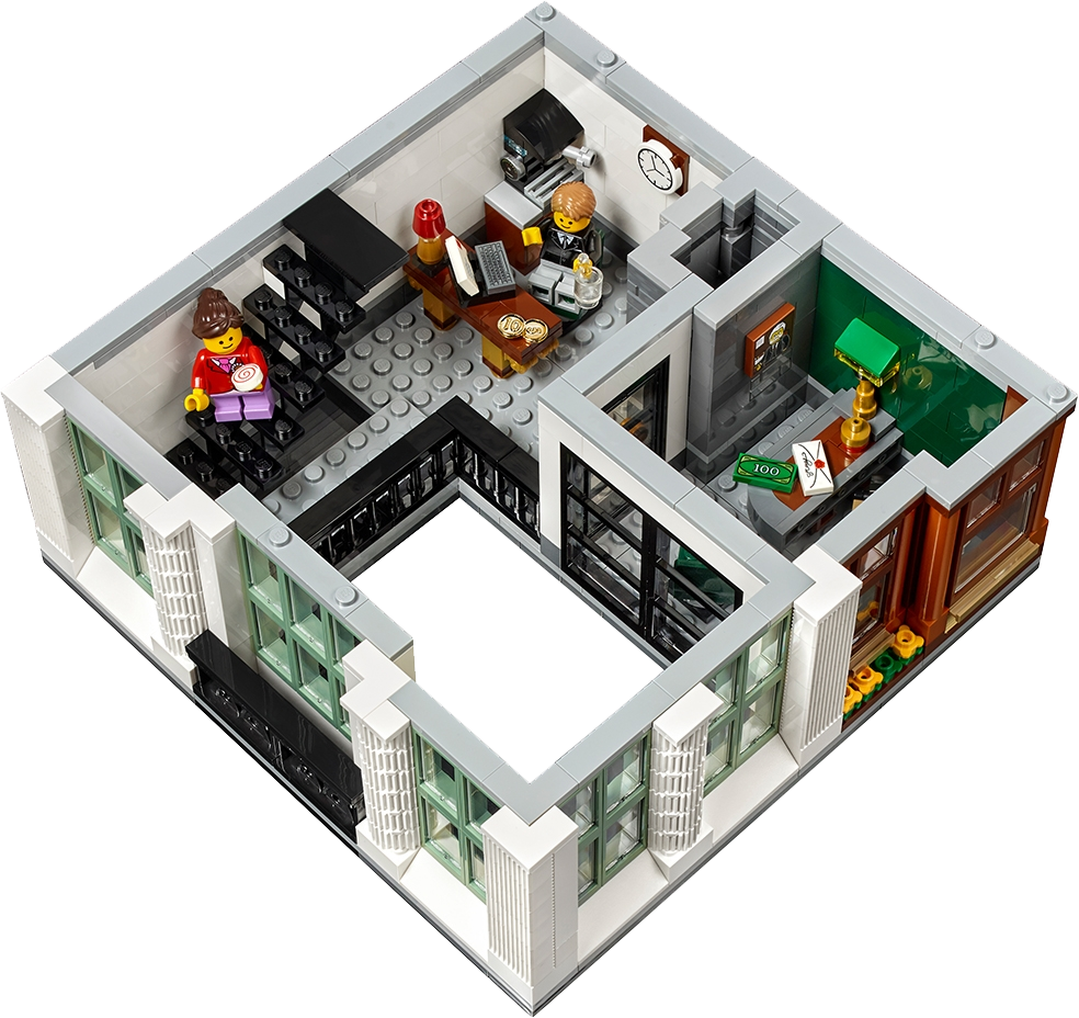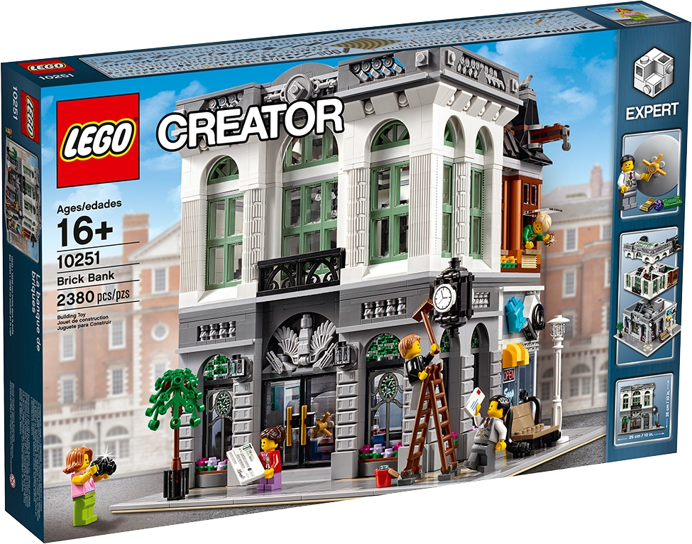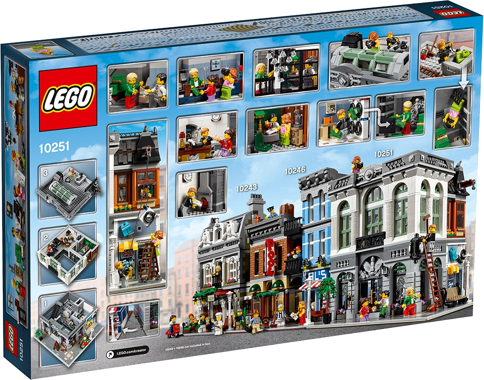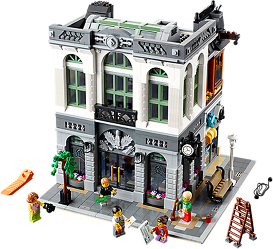 Make a safe deposit at the Brick Bank! Step through the arched entrance of the sculptural façade onto the elegantly tiled floor of the grand foyer, where daylight floods through the large, oxidized copper skylight, illuminating the ornate chandelier high in the atrium.Make a deposit with the friendly teller and place the money in the bank’s secure vault. Then take the stairs to the second floor, where you can discuss your finances over a delicious espresso in the plush surroundings of the bank manager’s office, while next door to the bank, customers are busy depositing their laundry at the cozy, self-service laundromat. Welcome to this magnificent building that houses one of the area’s most established and respected financial institutions… but the vault has a potential weakness, and someone has already found it! This latest addition to the LEGO® Modular Building series is packed with unsurpassed detail and hidden surprises! Includes 5 minifigures: a bank manager, secretary, teller, and a mom and child. The Brick Bank features a bank, secretary’s office, bank manager’s office, laundromat and a detailed façade and sidewalk. Bank features an atrium foyer with wide, arched entrance, triangular-patterned floor tiling, ornate chandelier, oxidized-copper colored skylight, transaction counter with hidden alarm buttons and security glass, and a bank vault with safe deposit boxes and a large round door. Laundromatfeatures a printed window, tiled floor and 4 laundry machines. Secretary’s office features a wall clock, desk, typewriter, cabinet with opening drawers, fireplace and an espresso machine. Bank manager’s office features a large desk with banker’s lamp and approval stamp, leather-look chair, printed portrait, statue and a cabinet. Accessory elements include a mug, document, camera, candy, blank white paper, chrome-golden coins, 1 chrome- golden bar and banknotes. Remove the building sections to access the detailed interior. Unlock the bank vault to access the safe deposit boxes. Visit the laundromat for a spot of laundering. Stack coins with the coin counting machine. With over 2380 pieces, this model will put your LEGO® building skills to the test! Special elements include a printed prize check, printed ground-floor windows, a special printed portrait in the bank manager’s office, plus rare, sand-blue and dark-green bricks, and sand-green window frames. Collect and build an entire town with the LEGO® Creator Expert Modular Building series 10243 Parisian Restaurant and 10246 Detective’s Office. Brick Bank measures over 10” (26cm) high, 10” (25cm) wide and 10” (25cm) deep.