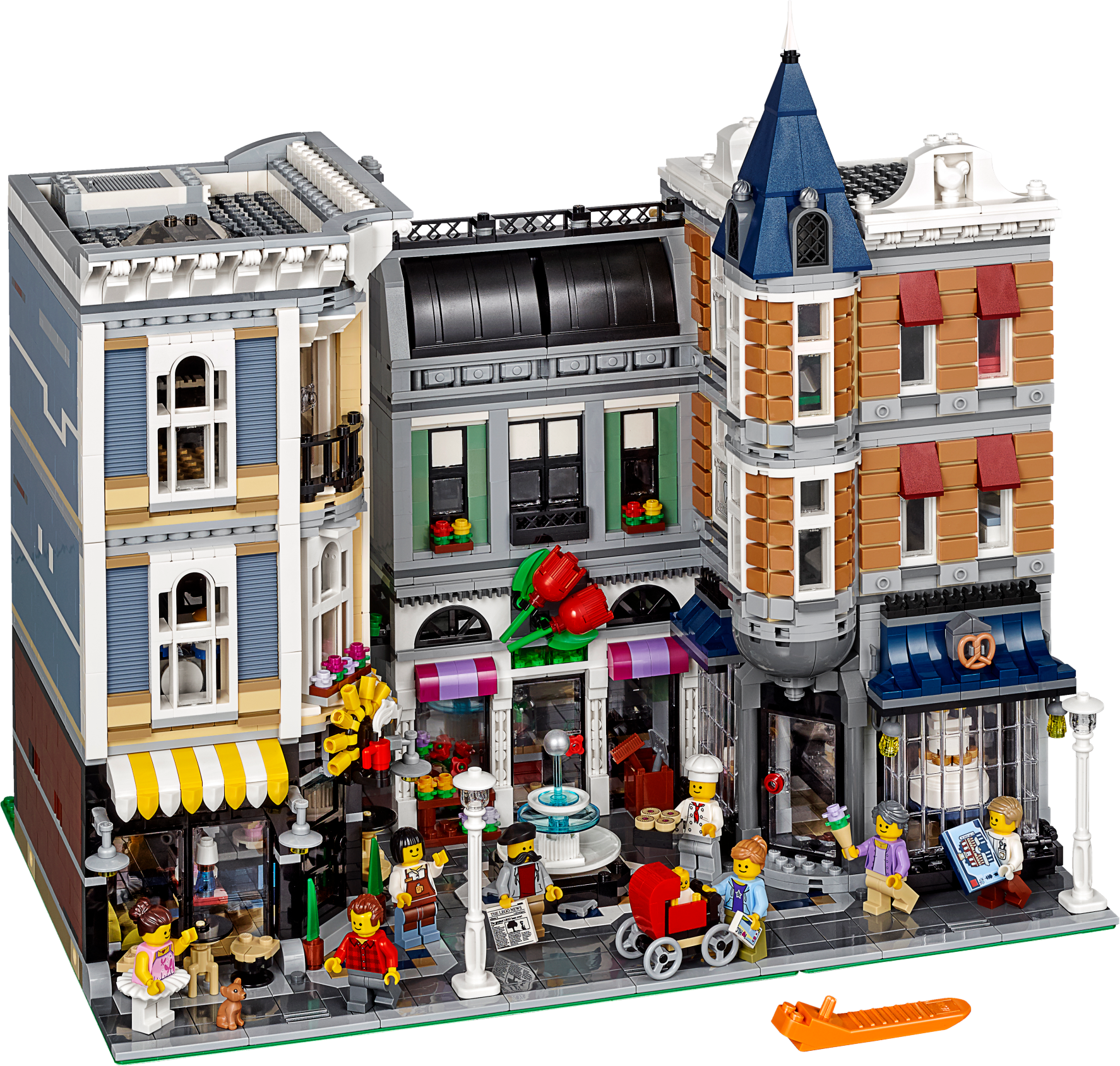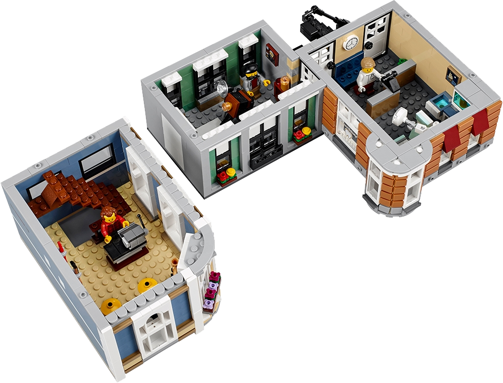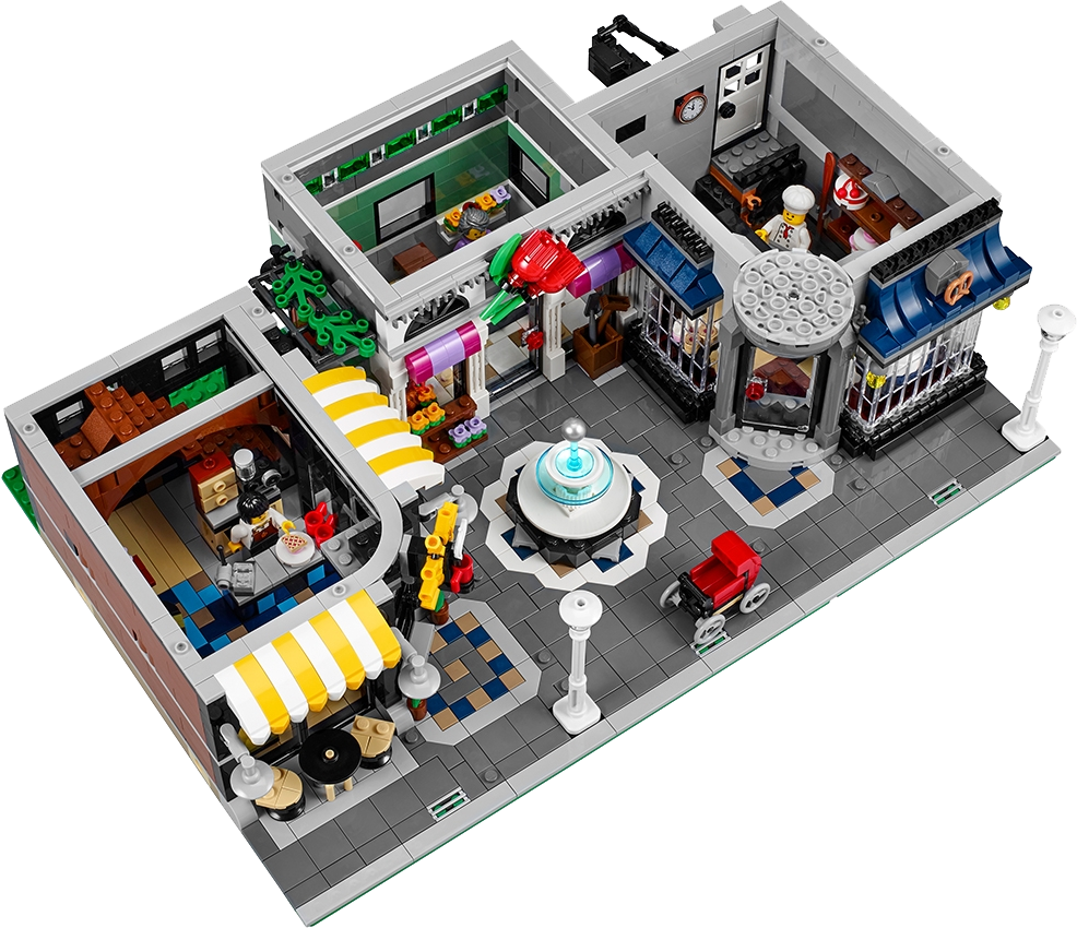 The three-level Assembly Square features an authentic, elaborate facade with detailed windows and doors, three buildable shop signs, spired tower, decorative roofline and a rooftop terrace, plus a detailed tiled sidewalk with a fountain, outdoor café furniture and two streetlamps. The highly detailed interior includes a bakery, florist’s shop, café, music store, photo studio, dental office, apartment and a dance studio.