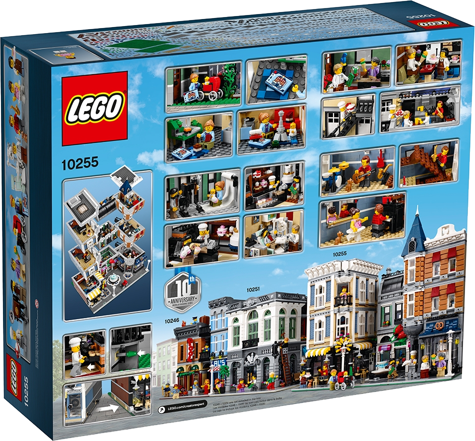 Take a trip to the amazing Assembly Square, developed to celebrate ten years of LEGO® Modular Buildings, featuring a wealth of unsurpassed, intricate details and hidden surprises. Easy-to-remove building sections provide access to the highly detailed interior, comprising a ground level with a bakery, florist’s shop and café, a middle level with a music store, photo studio and dental office, and an upper-level dance studio and apartment with access to a rooftop terrace with barbecue.
