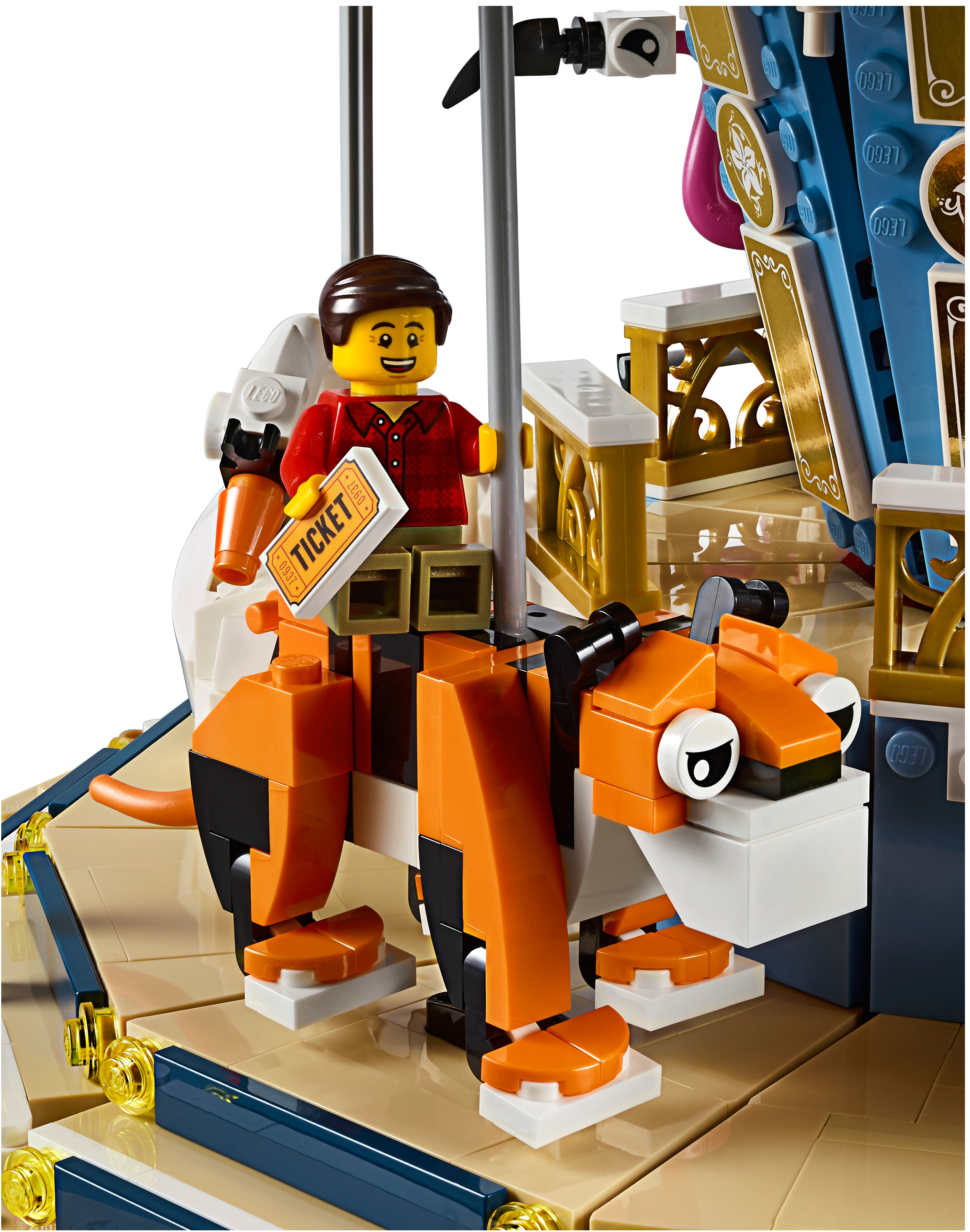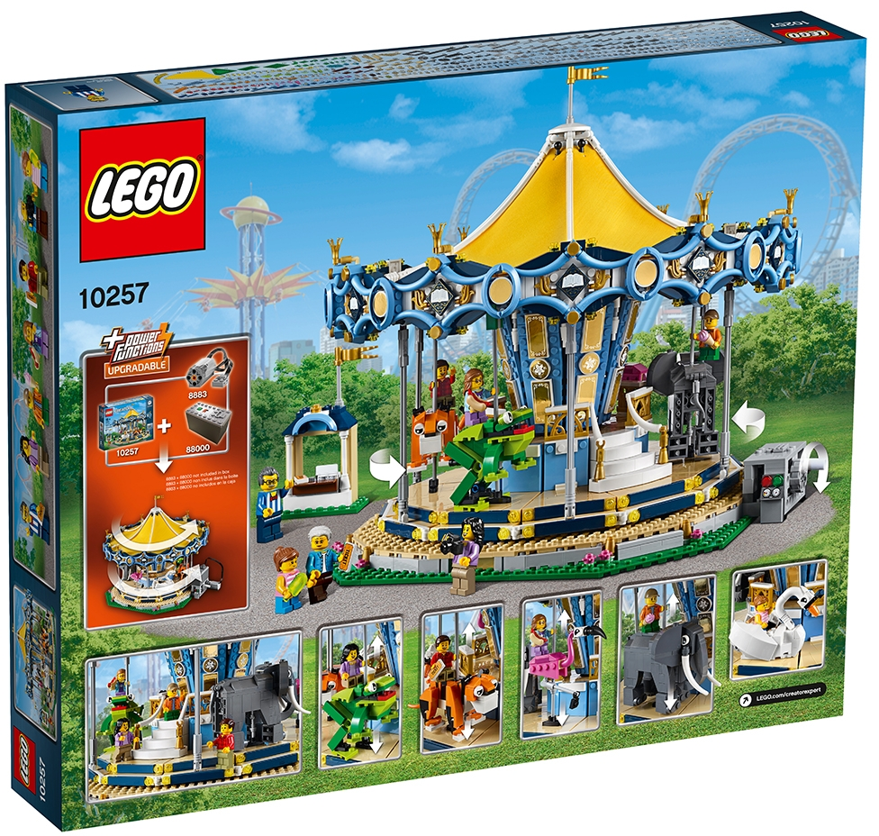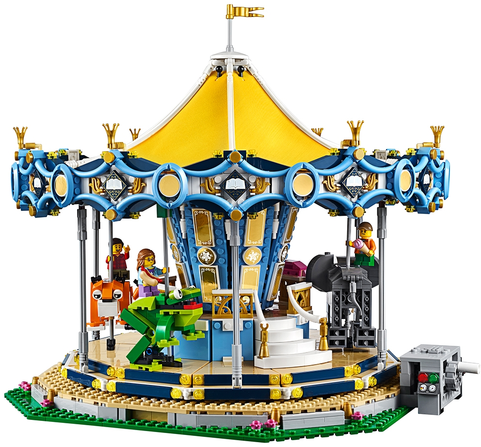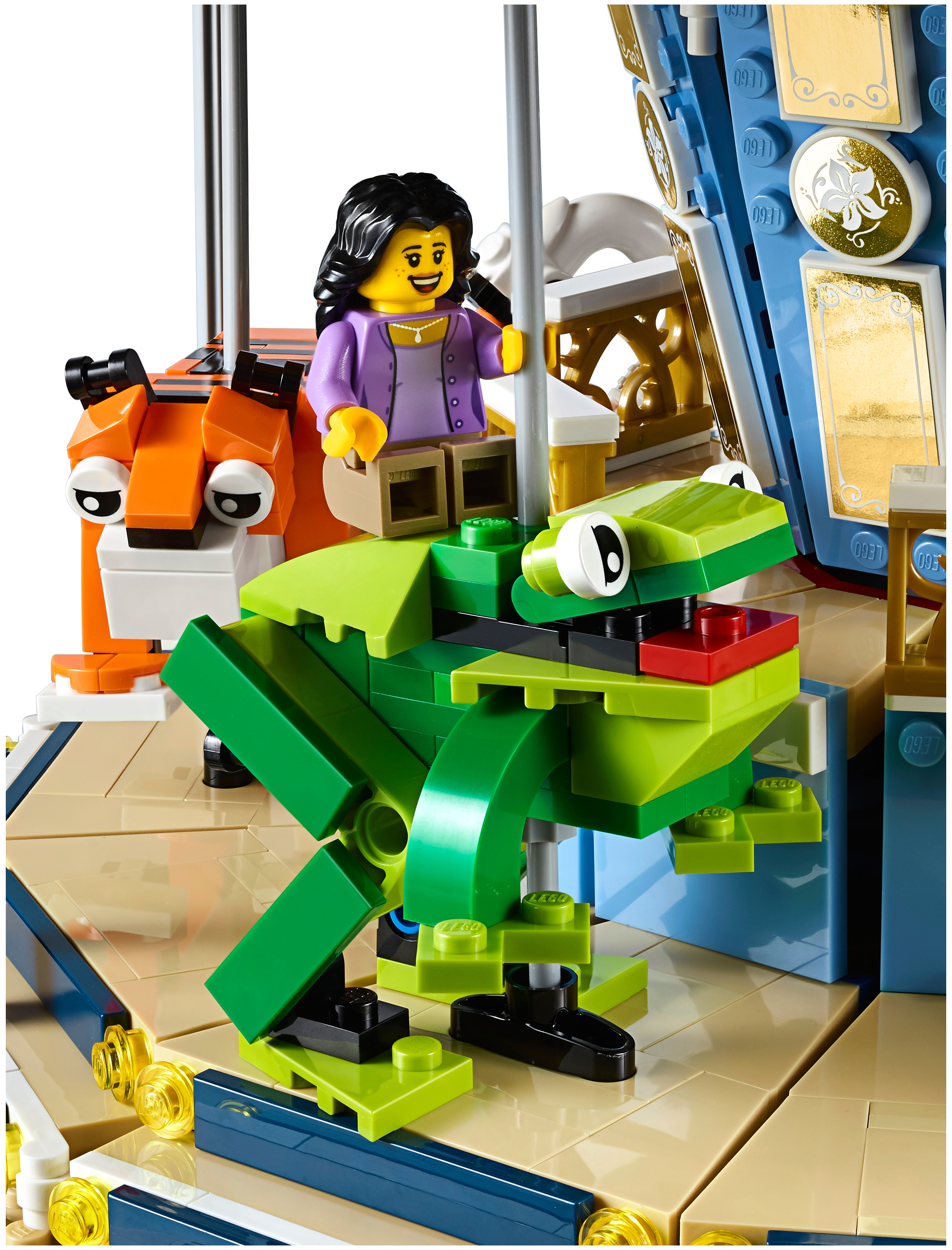 Experience the majestic Carousel with a wealth of delightful features, including a large textile canopy, ornate reflective rounding boards with blue and gold detailing, reflective center panels, and a 2-tier deck comprising a raised boarding platform with handrail and a main platform with 5 buildable animal rides, including a white swan and 4 moving animals. Turn the crank and see the elephant, tiger, flamingo and frog move up and down as the carousel rotates. This delightful LEGO® Creator Expert model has an iconic elegance that evokes feelings of nostalgia, romance and adventure. Upgrade with LEGO Power Functions for fully motorized operation. Includes 7 minifigures.