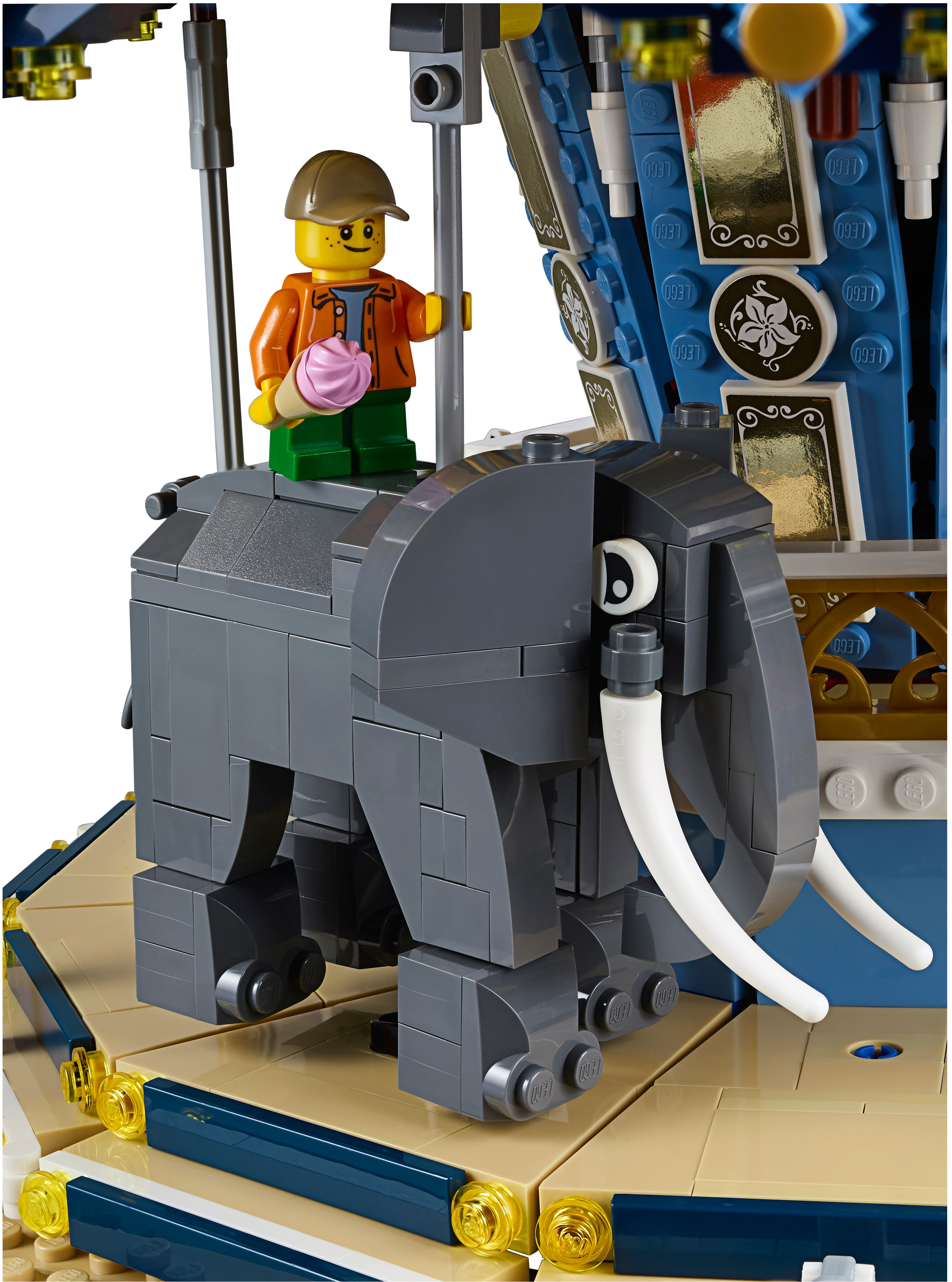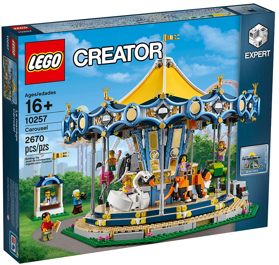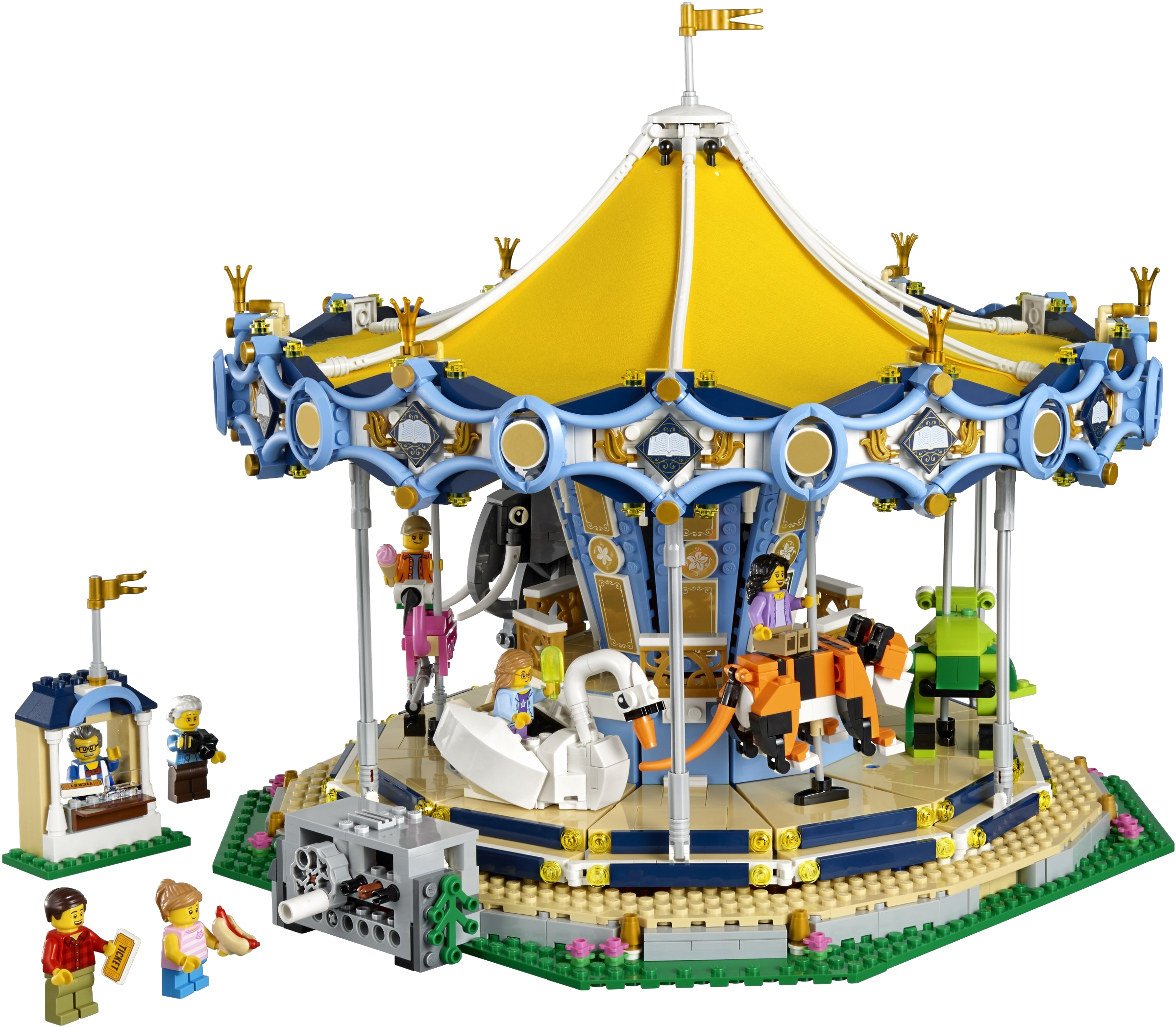 Experience the majestic Carousel with a wealth of delightful features, including a large textile canopy, ornate reflective rounding boards with blue and gold detailing, reflective center panels, and a 2-tier deck comprising a raised boarding platform with handrail and a main platform with 5 buildable animal rides, including a white swan and 4 moving animals. Turn the crank and see the elephant, tiger, flamingo and frog move up and down as the carousel rotates. This delightful LEGO® Creator Expert model has an iconic elegance that evokes feelings of nostalgia, romance and adventure. Upgrade with LEGO Power Functions for fully motorized operation. Includes 7 minifigures.