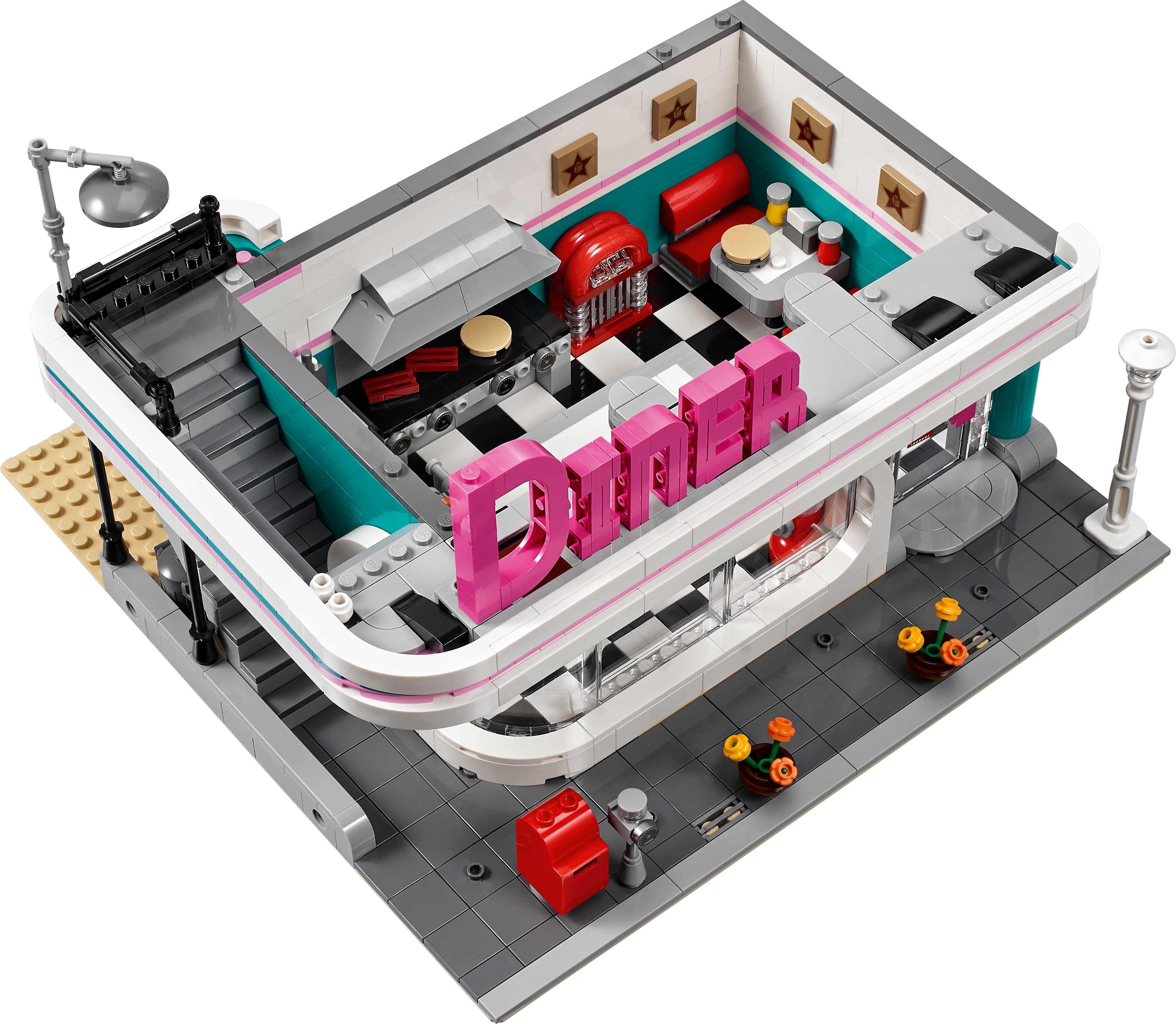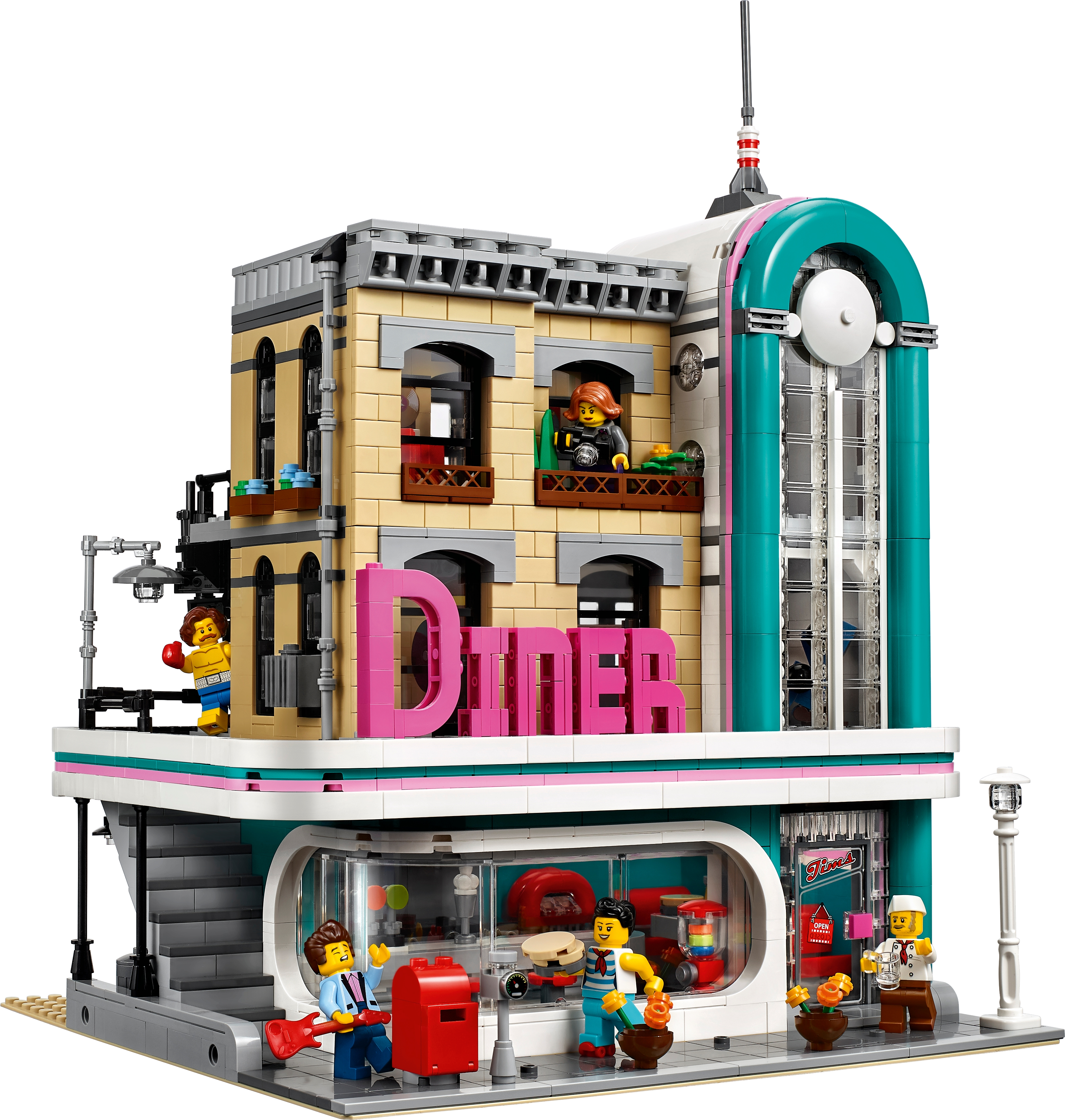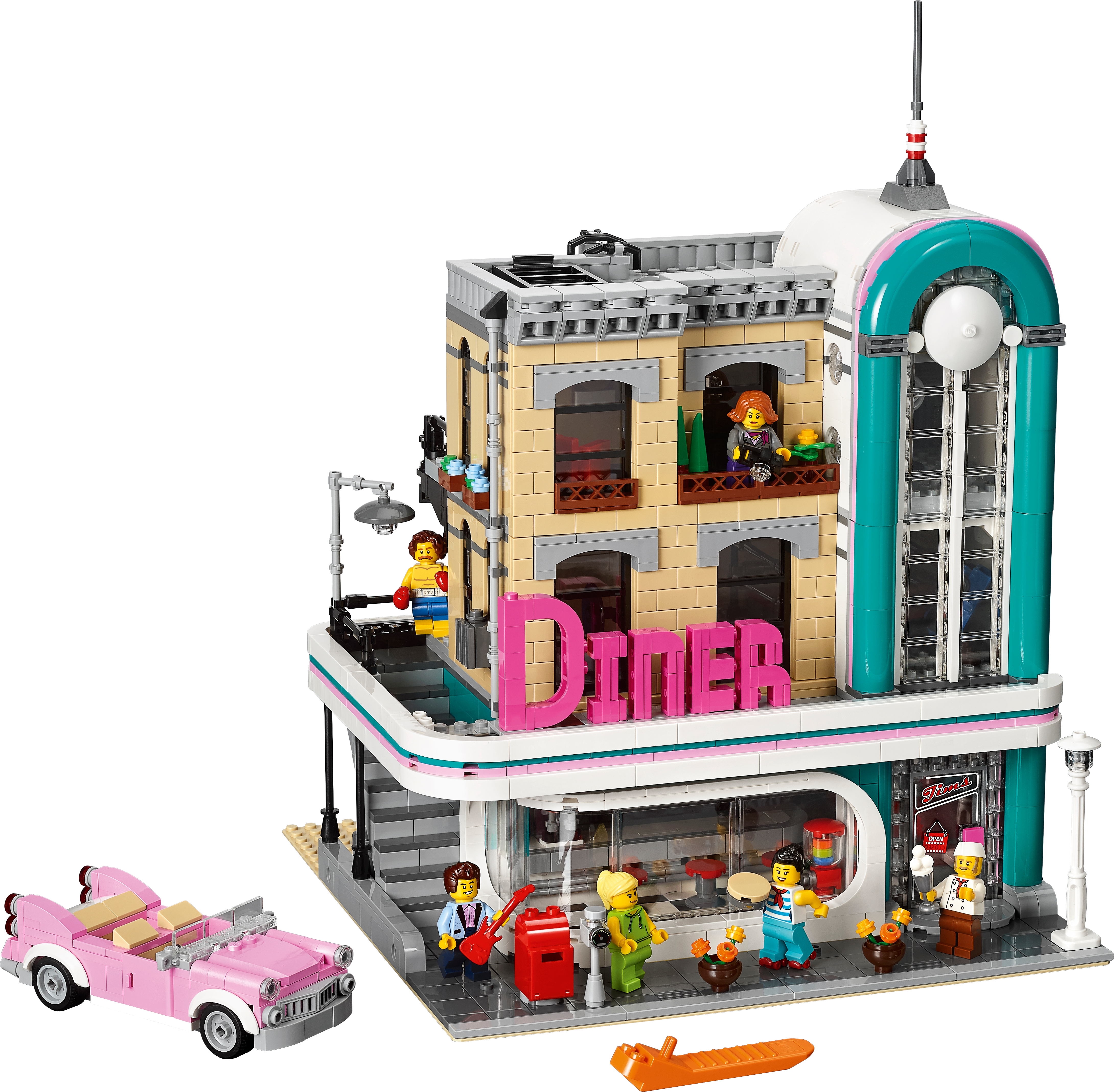 The 3-level Downtown Diner comes with an array of brick-built details, including a detailed facade with pink-and-teal Streamline Moderne styling and a large ‘DINER' sign, external staircase, arched windows, drainpipe, balconies, decorative roofline, opening skylight and a rooftop terrace, plus a detailed sidewalk with a mailbox, parking meter, flowerpots and an ornate streetlamp. This set also includes a pink 1950s-style convertible.