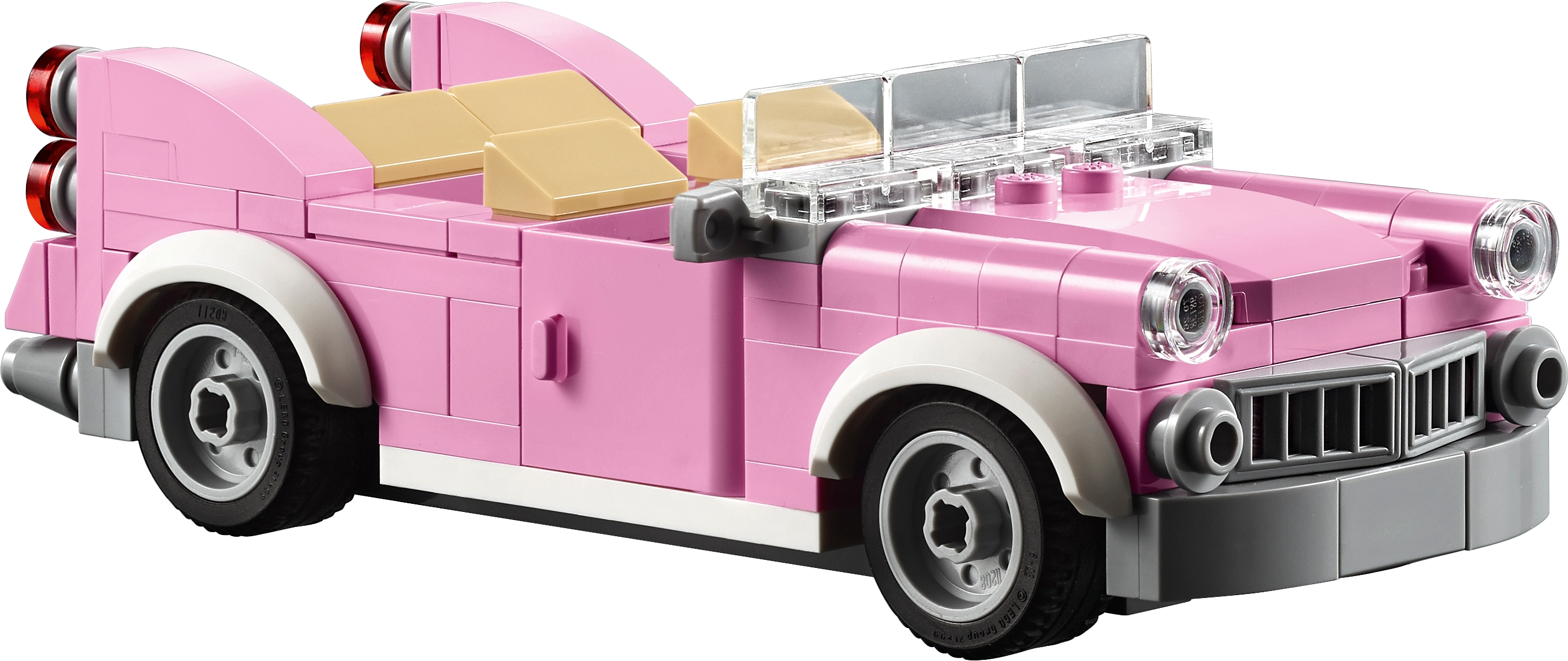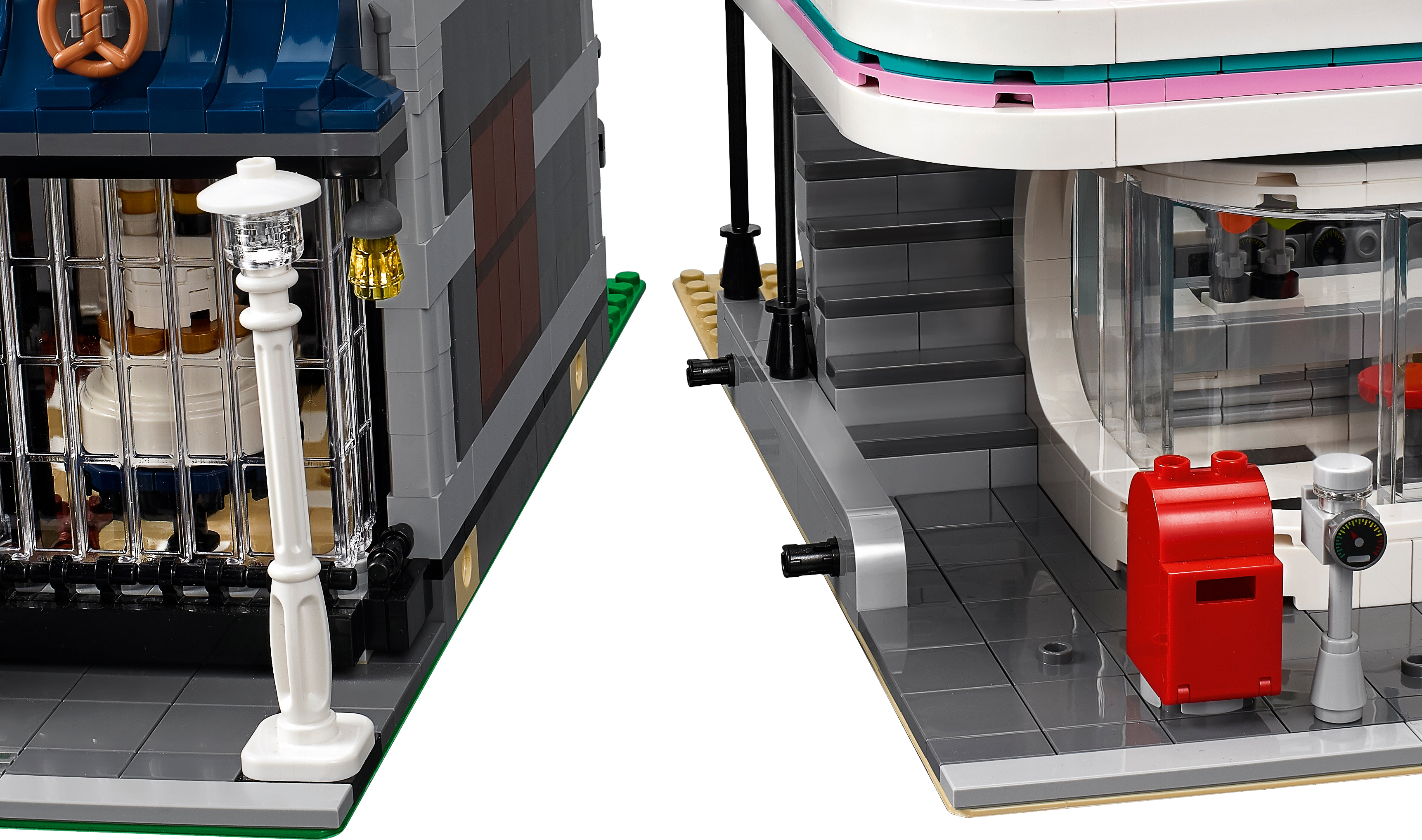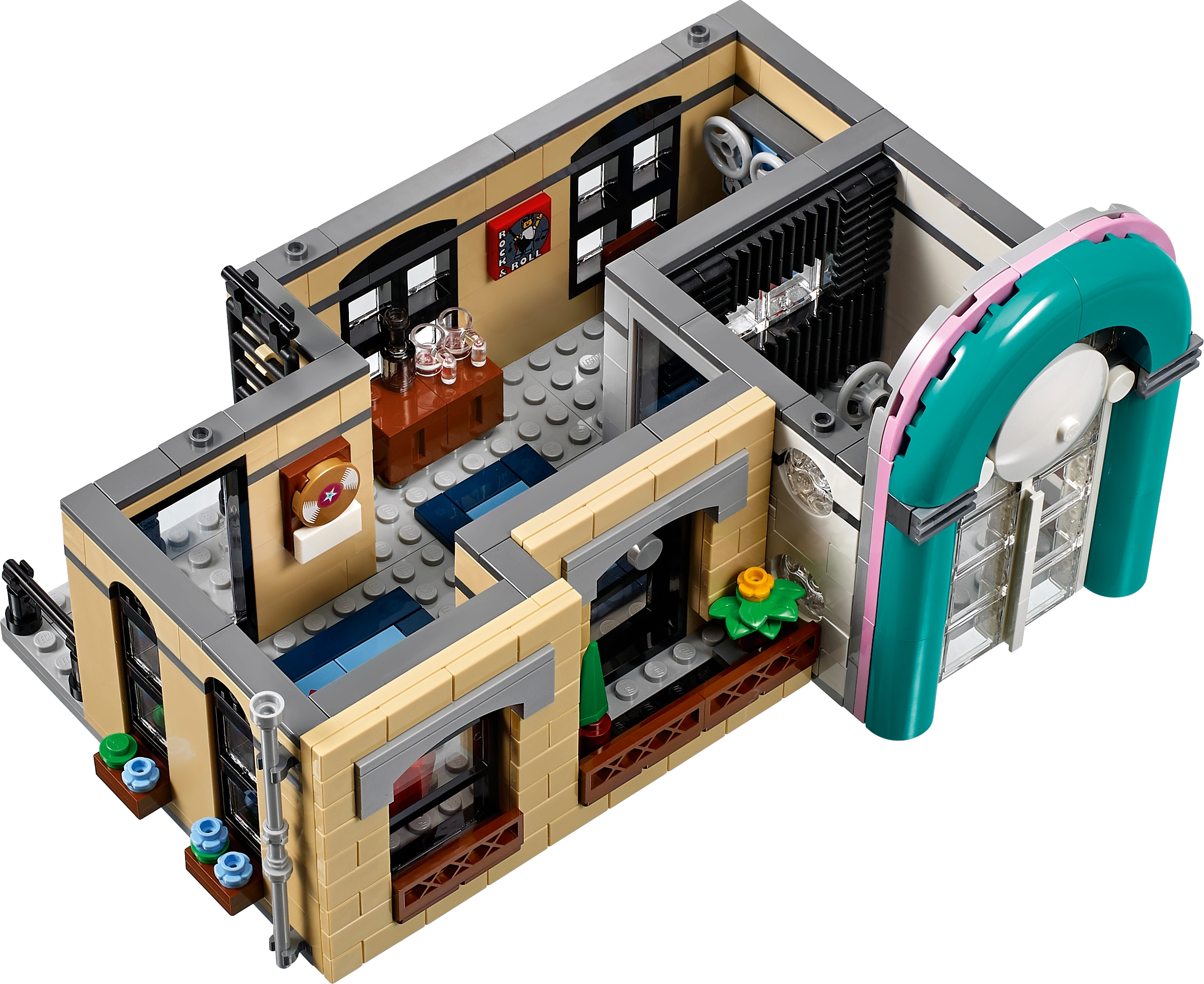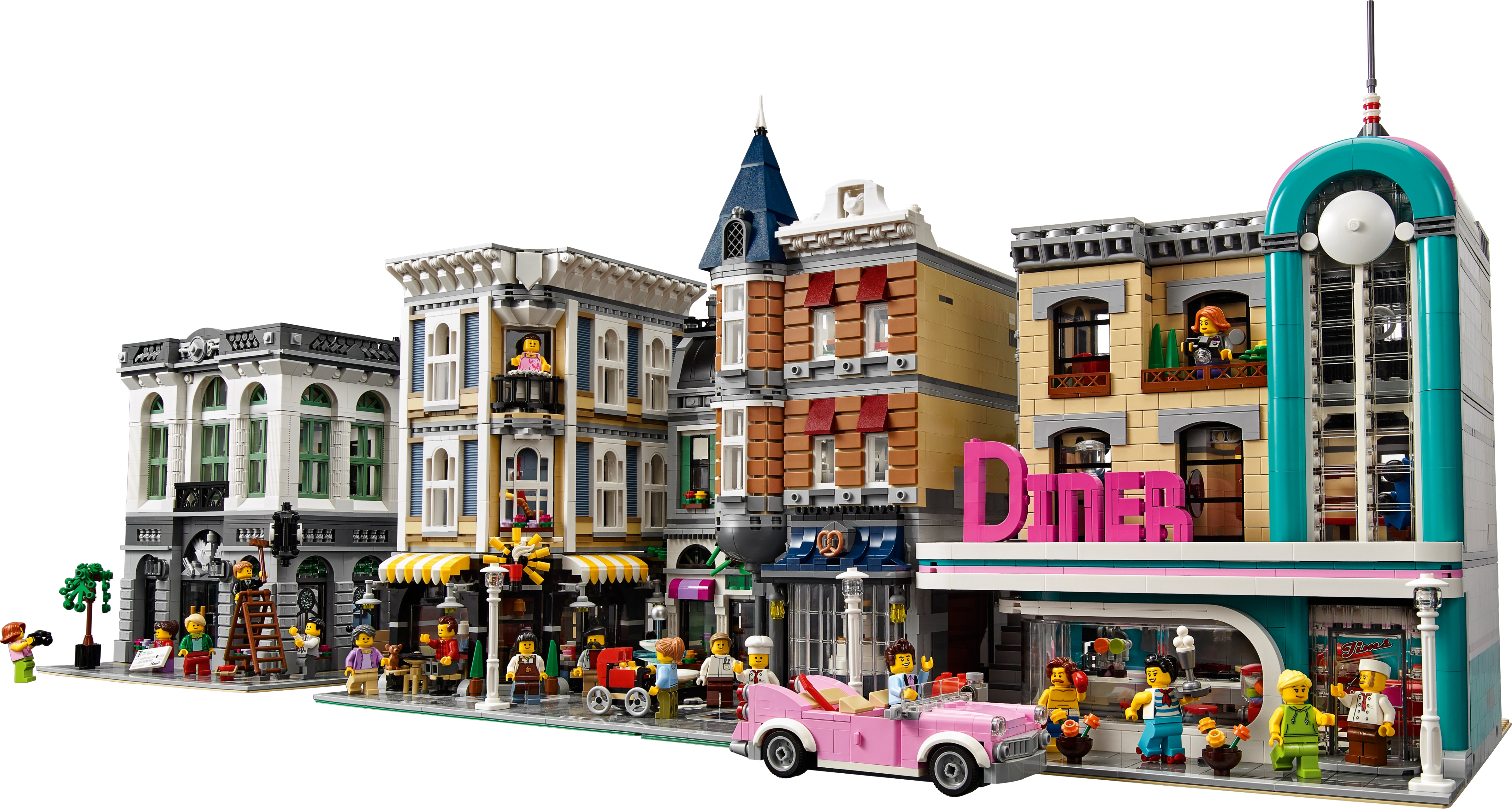 The 3-level Downtown Diner comes with an array of brick-built details, including a detailed facade with pink-and-teal Streamline Moderne styling and a large ‘DINER' sign, external staircase, arched windows, drainpipe, balconies, decorative roofline, opening skylight and a rooftop terrace, plus a detailed sidewalk with a mailbox, parking meter, flowerpots and an ornate streetlamp. This set also includes a pink 1950s-style convertible.