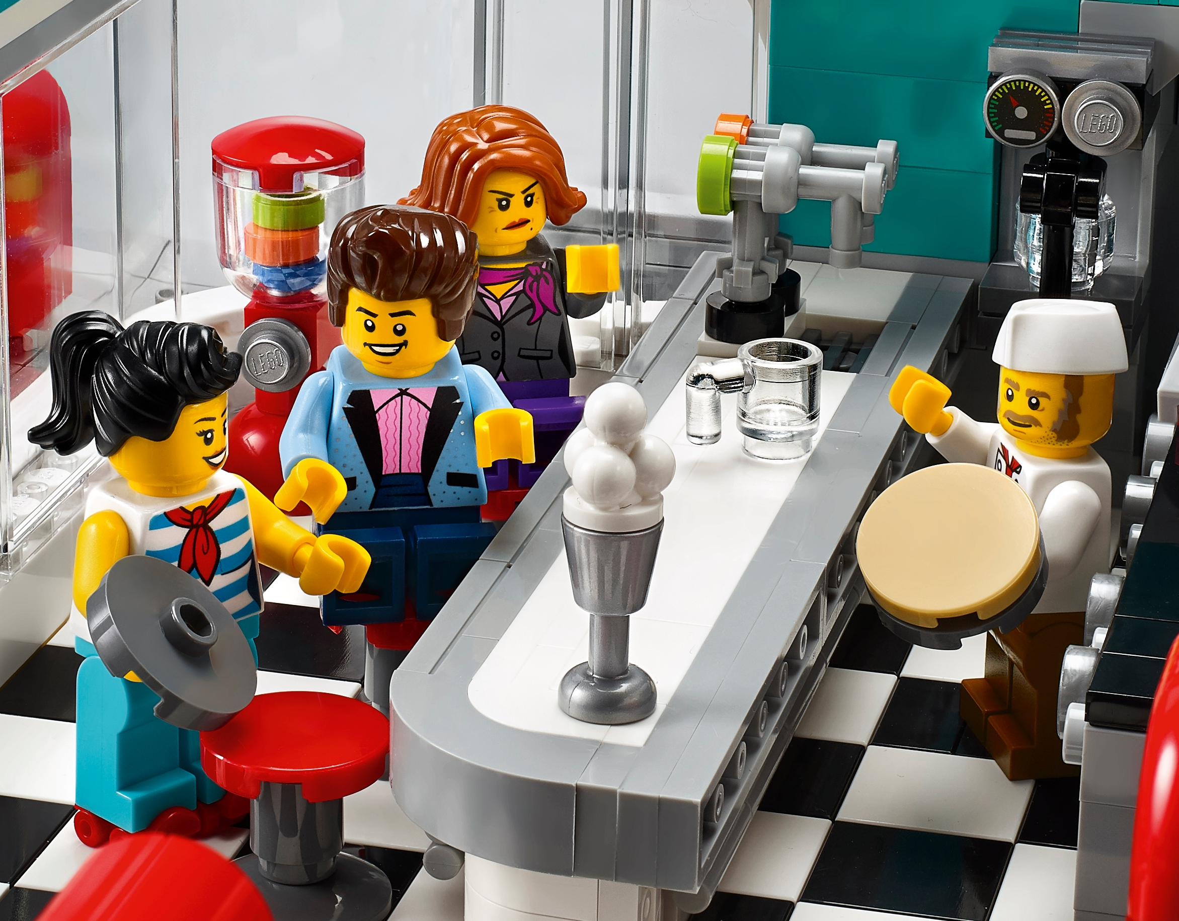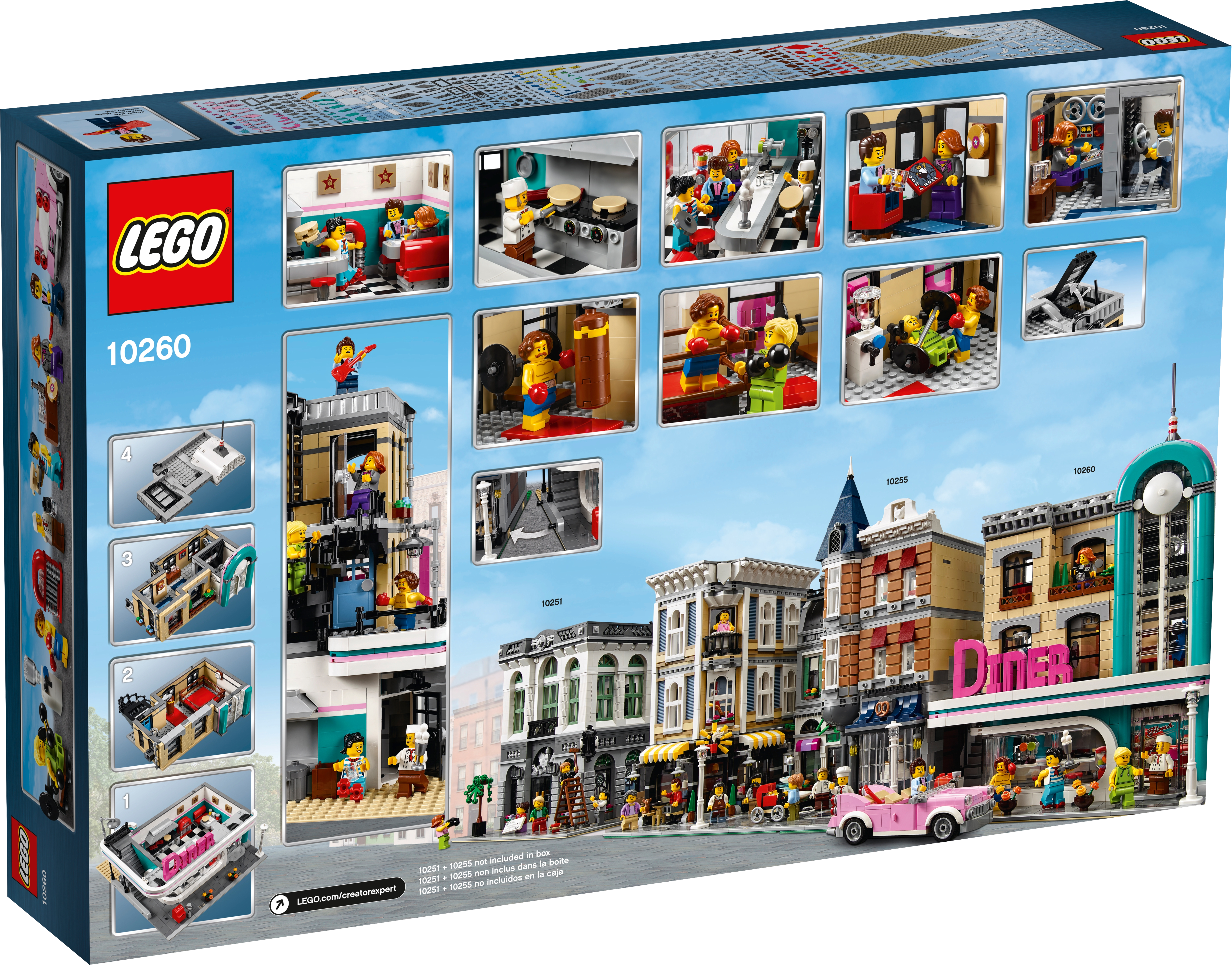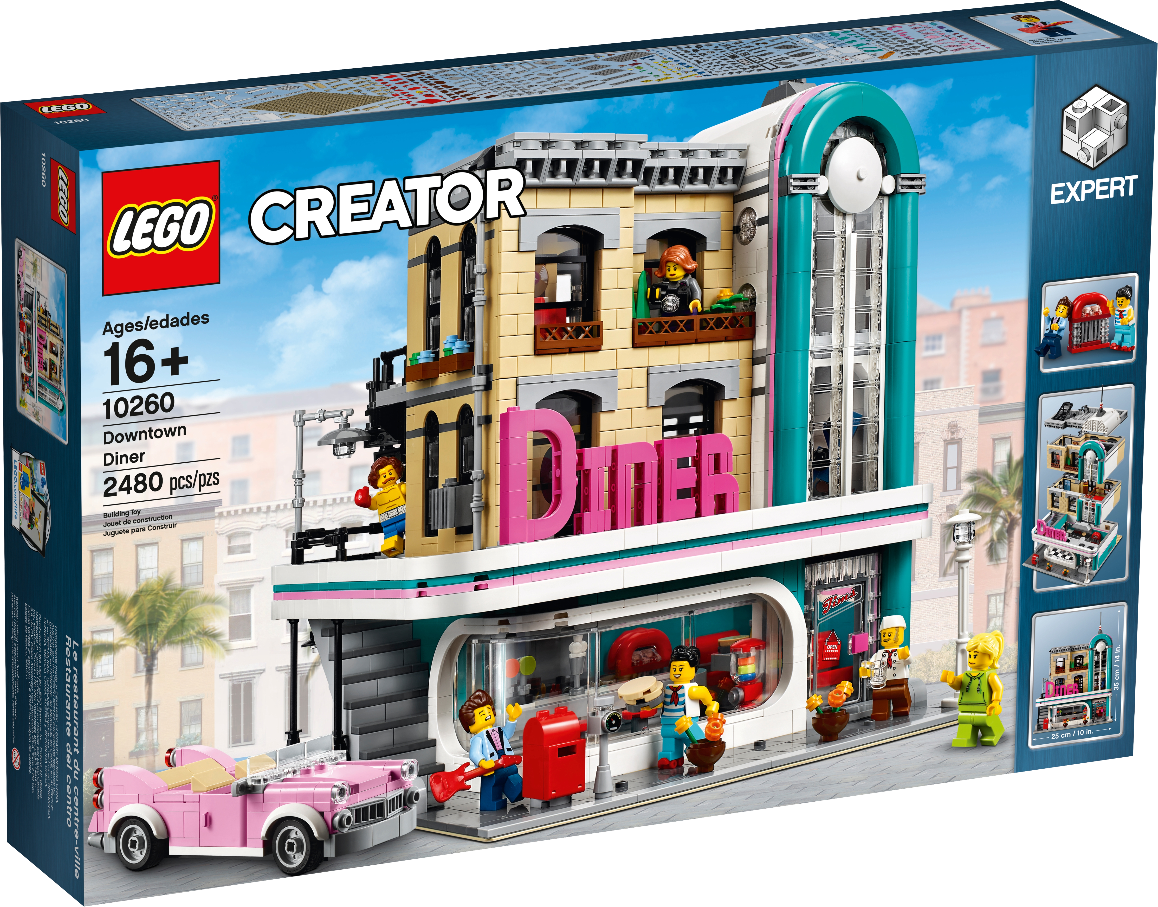 Drop in at the LEGO® Creator Expert 10260 Downtown Diner, where you’ll discover a healthy portion of fun and surprises. This impressive model features removable building sections for easy access to the detailed interior, which comprises a ground-level 1950s-style diner with a large curved front window, red bar stools, jukebox, counter and an open-plan kitchen. The mid level has a gym with boxing ring, punching bag and weight training room, while on the upper-level you'll find a recording studio, complete with vocal booth, mixing desk and a refreshments cabinet. The facade of the building features pink-and-teal Streamline Moderne styling with a large ‘DINER’ sign. Other external features include arched windows, balconies and a staircase, plus a pink convertible car and a detailed sidewalk, complete with mailbox, parking meter, flowerpots and a streetlamp. This incredible collectible toy has been designed to provide a challenging and rewarding building experience with a touch of nostalgia and charm. Includes 6 minifigures.