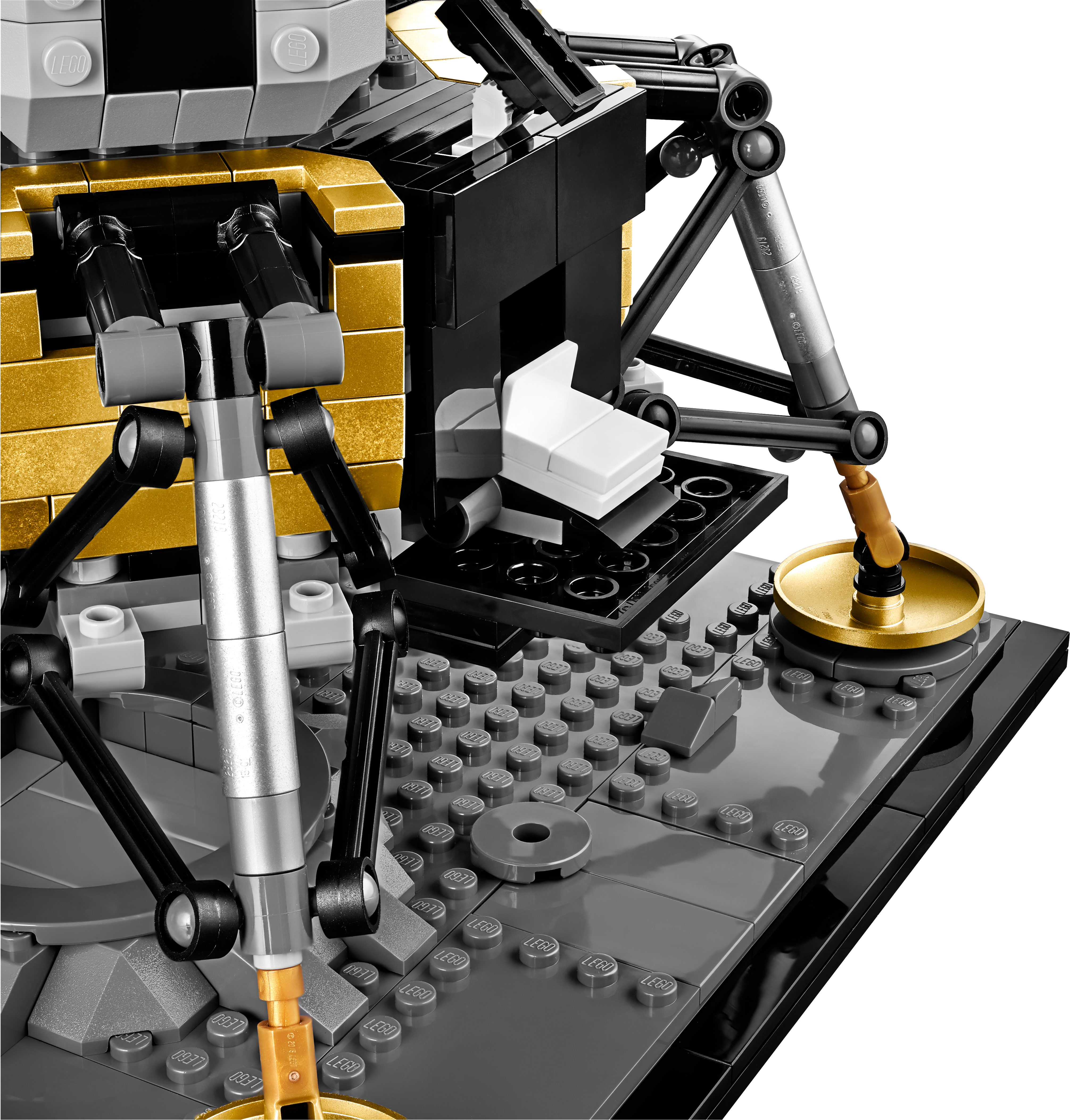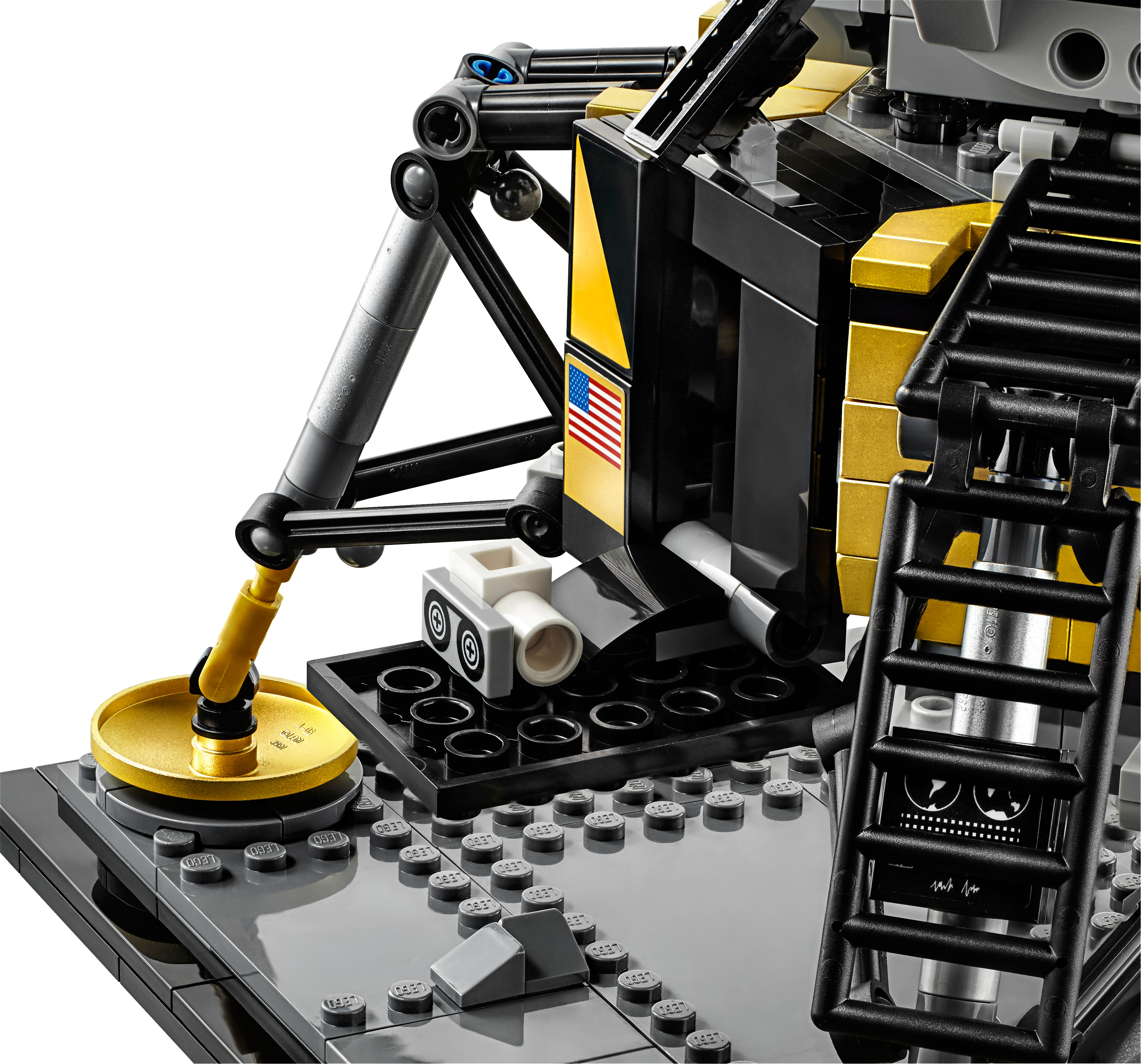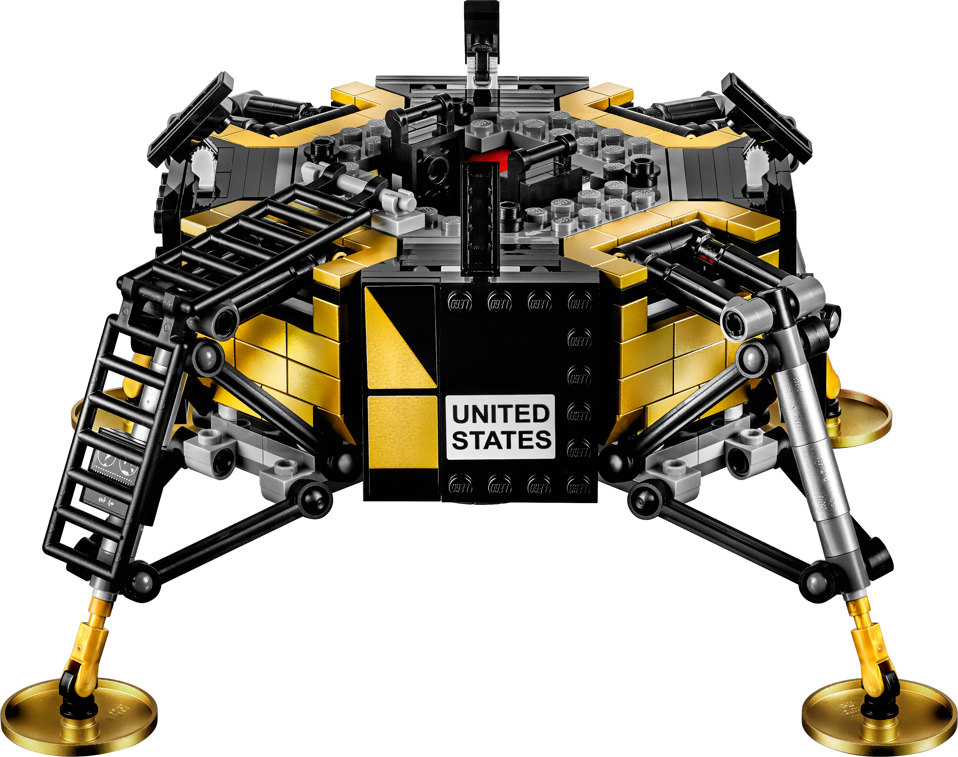 This advanced LEGO® set features a detailed replica of the Eagle lunar lander with separate ascent and descent stages, plus a depiction of the lunar surface with crater, footprints and a U.S. flag.
