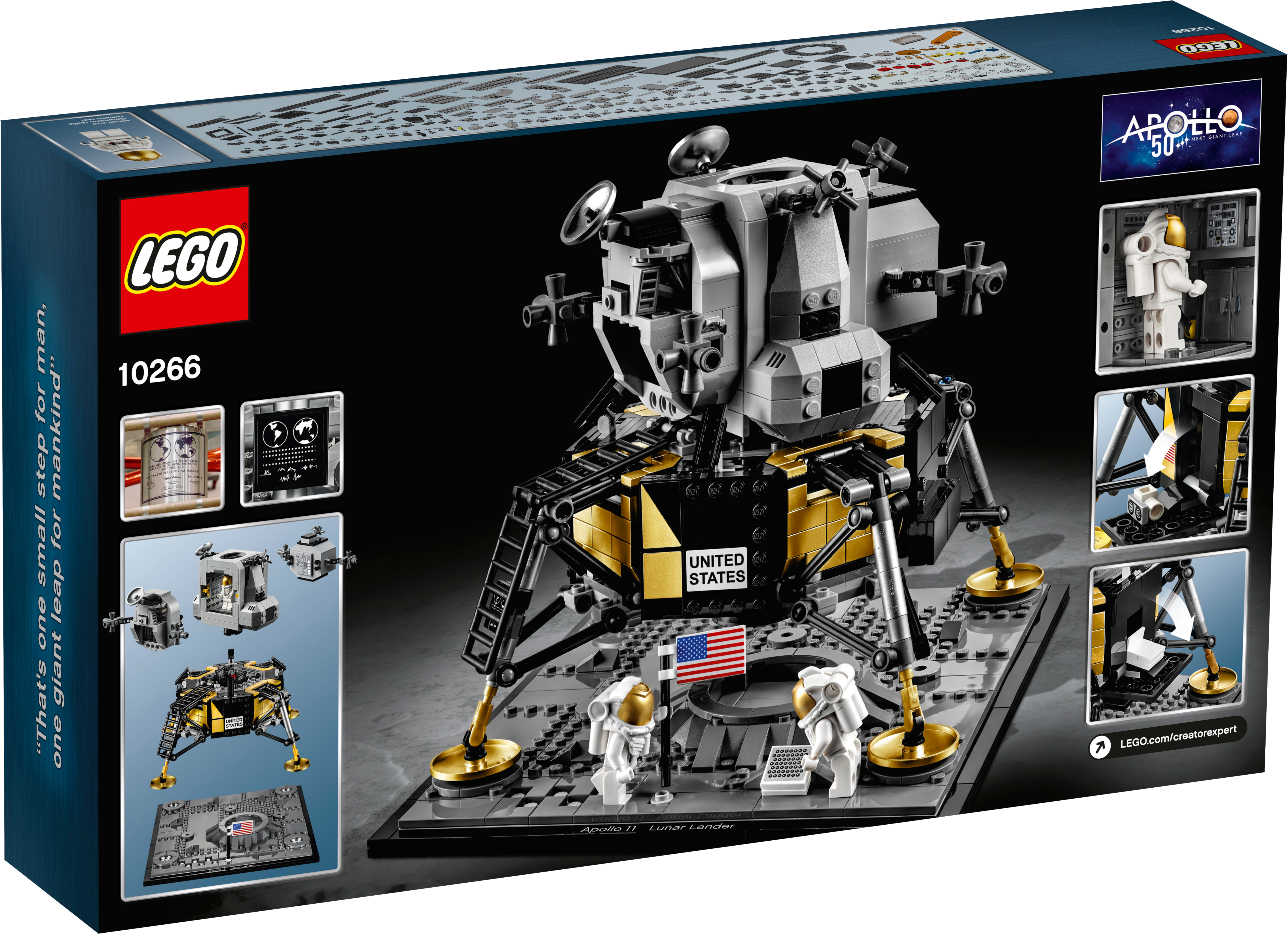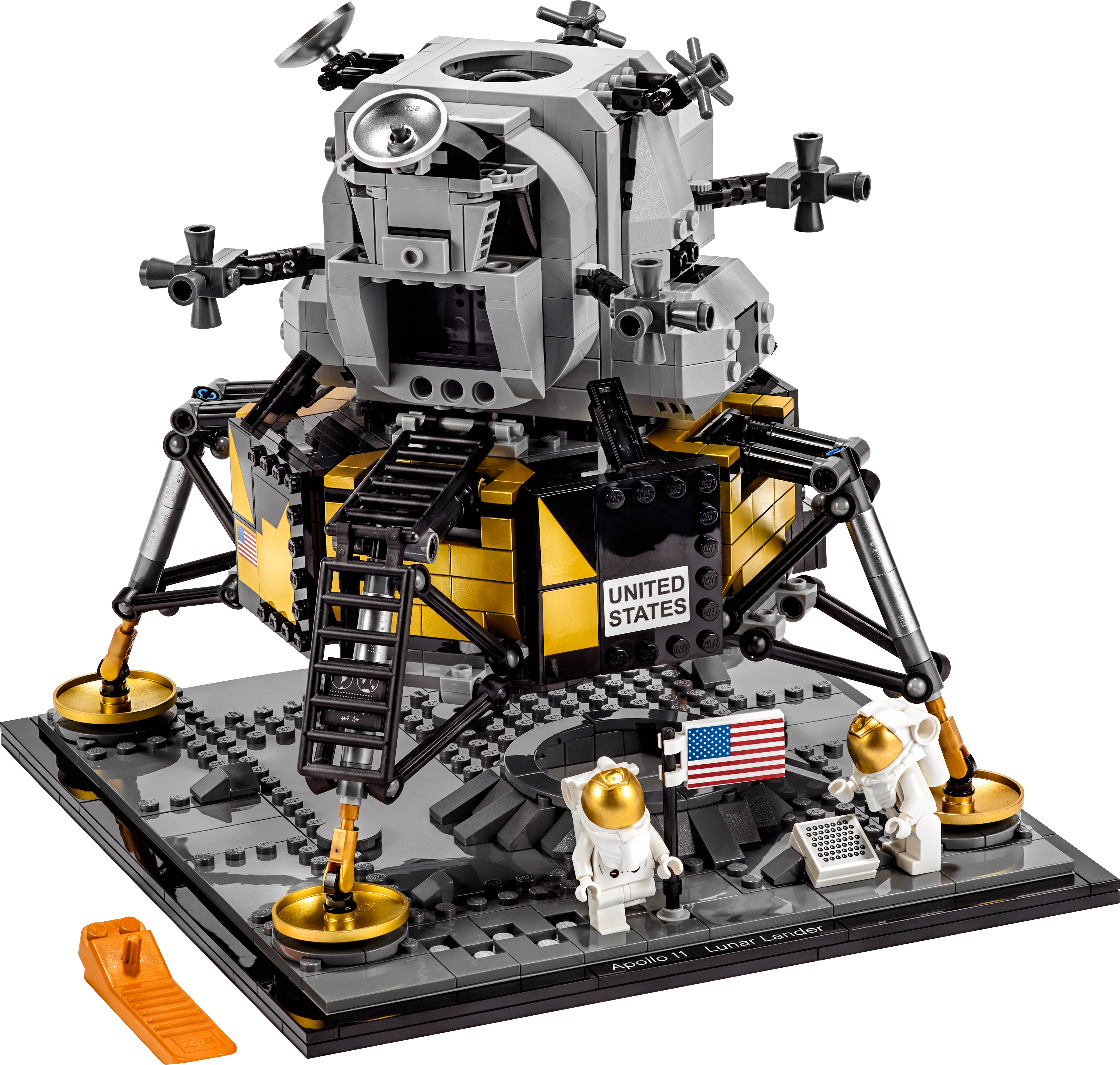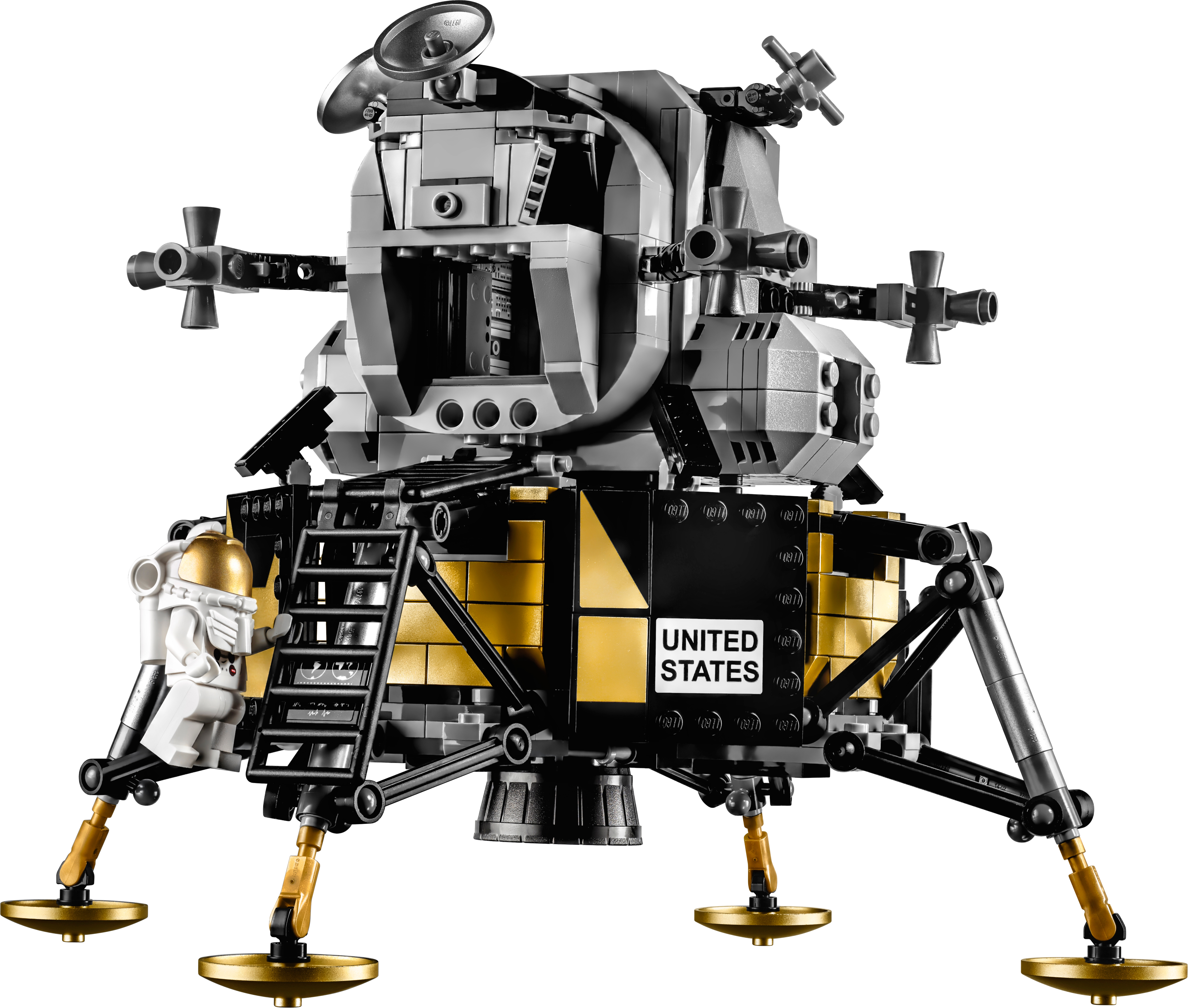 This advanced LEGO® set features a detailed replica of the Eagle lunar lander with separate ascent and descent stages, plus a depiction of the lunar surface with crater, footprints and a U.S. flag.